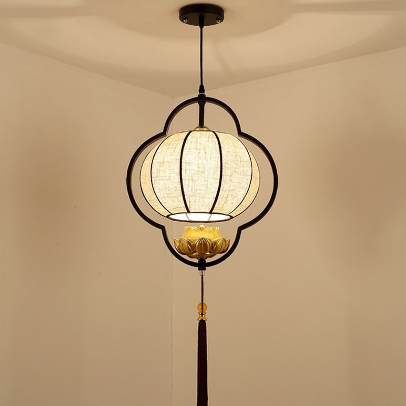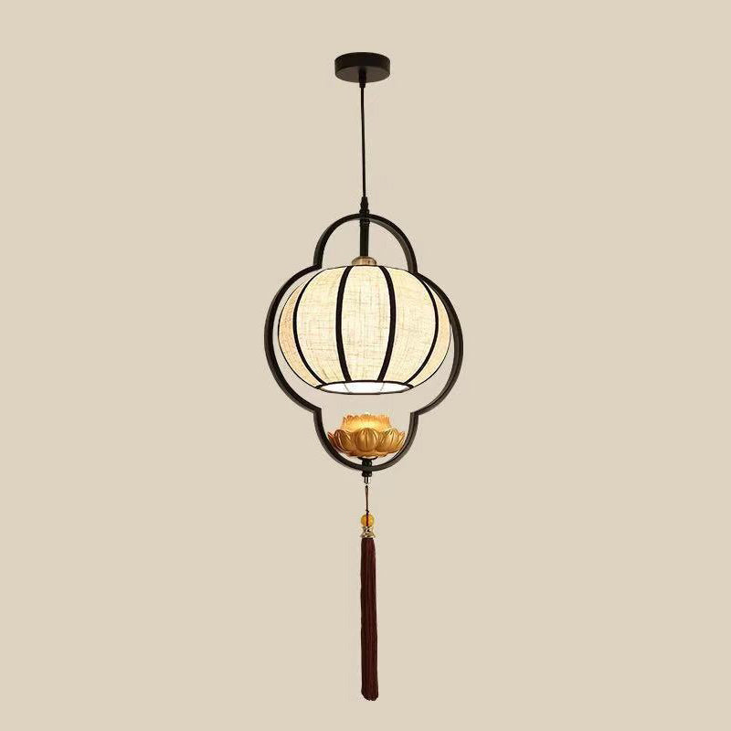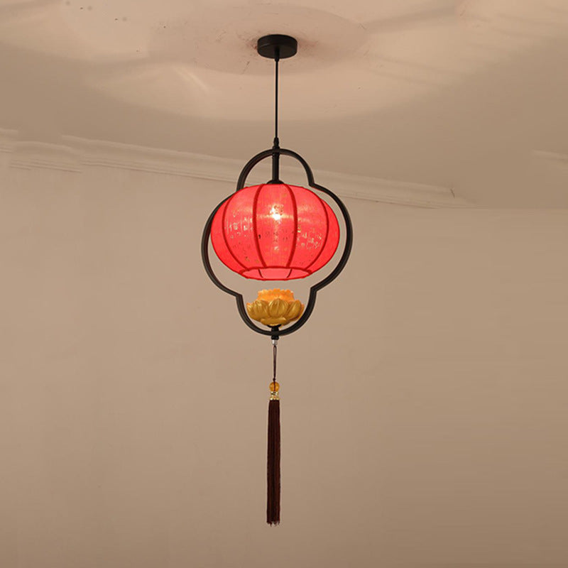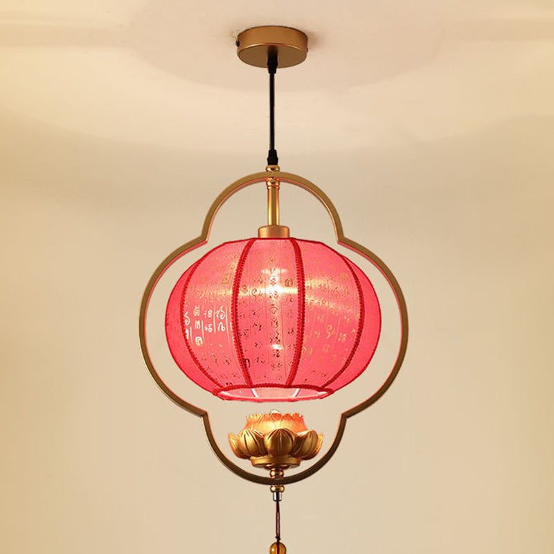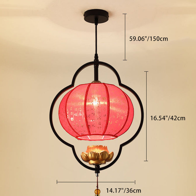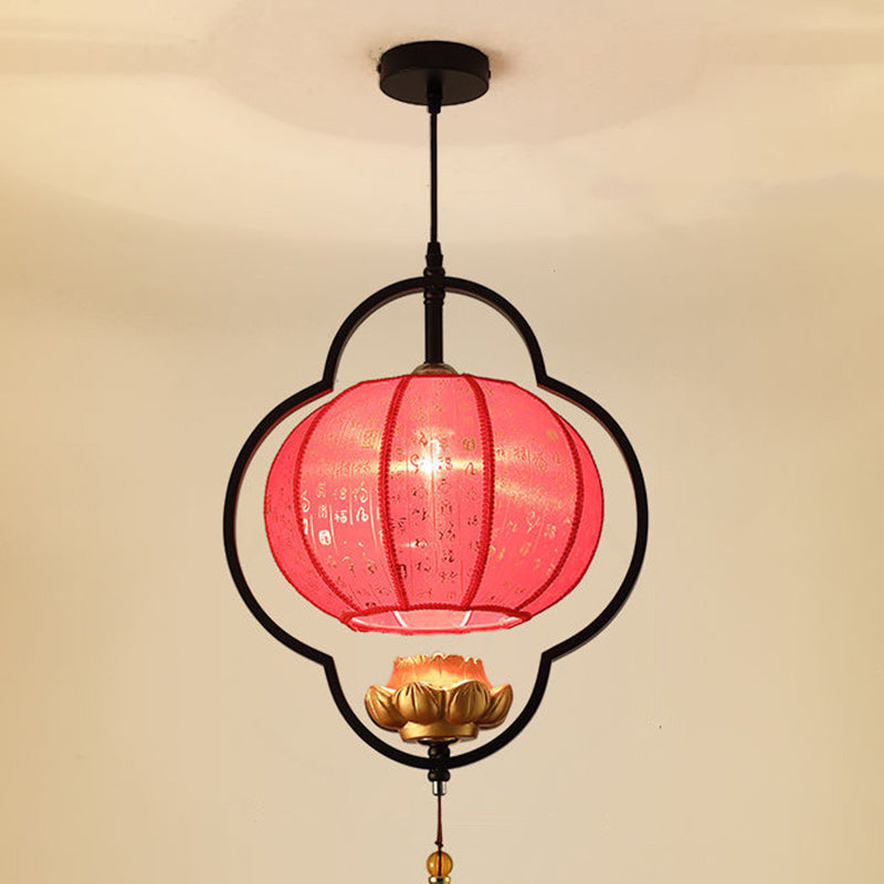 Traditional Chinese Lantern Lotus Fabric Iron 1-Light Pendant Light For Bedroom