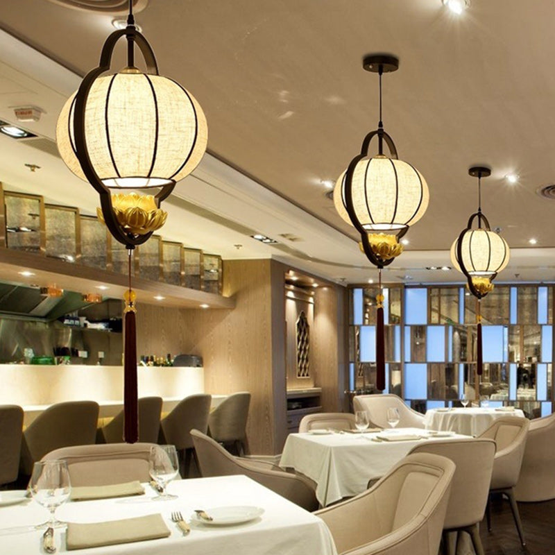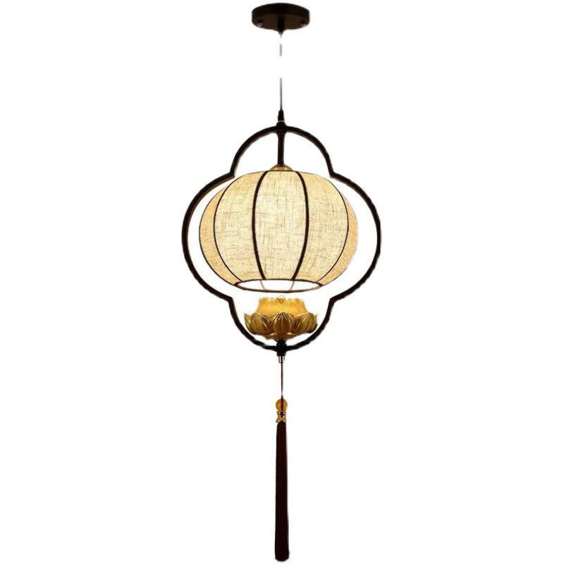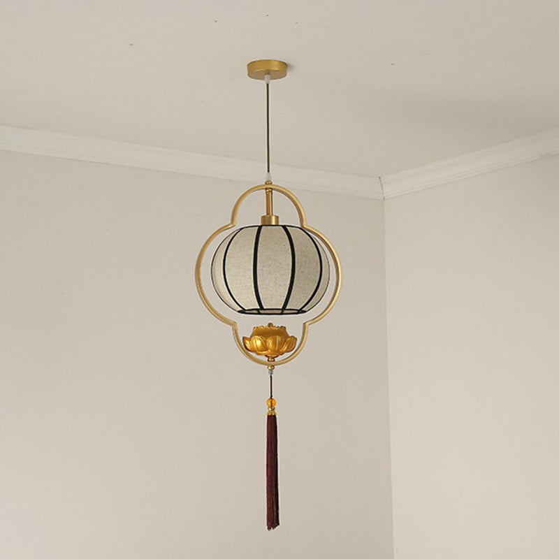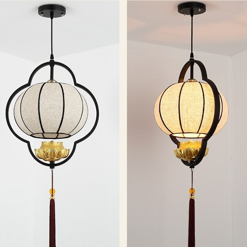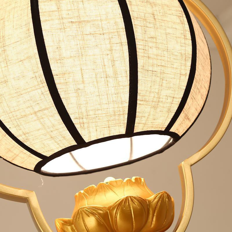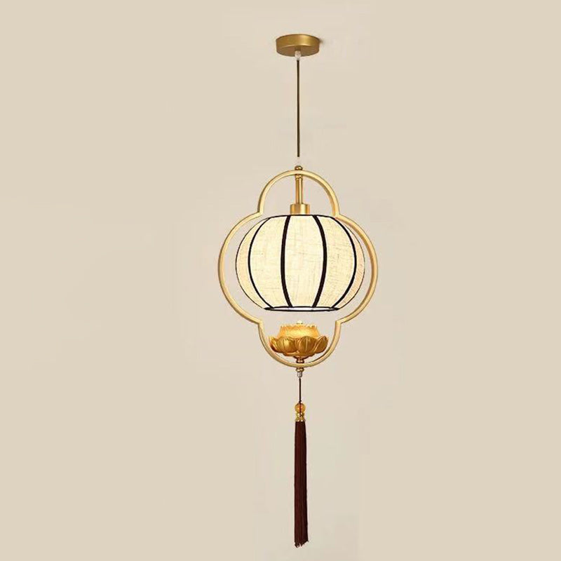 Traditional Chinese Lantern Lotus Fabric Iron 1-Light Pendant Light For Bedroom