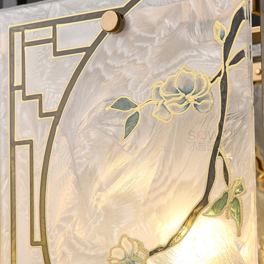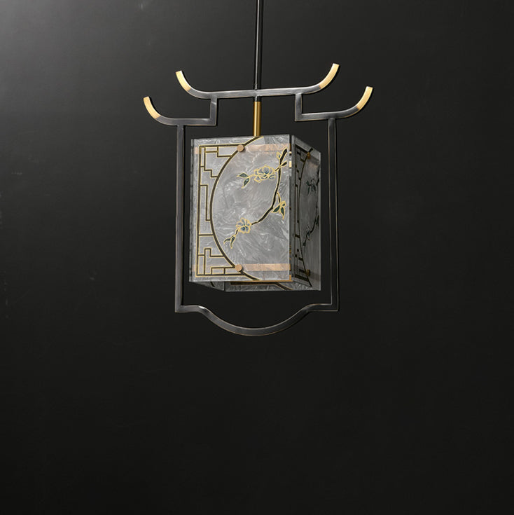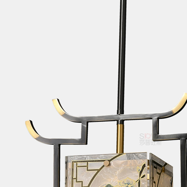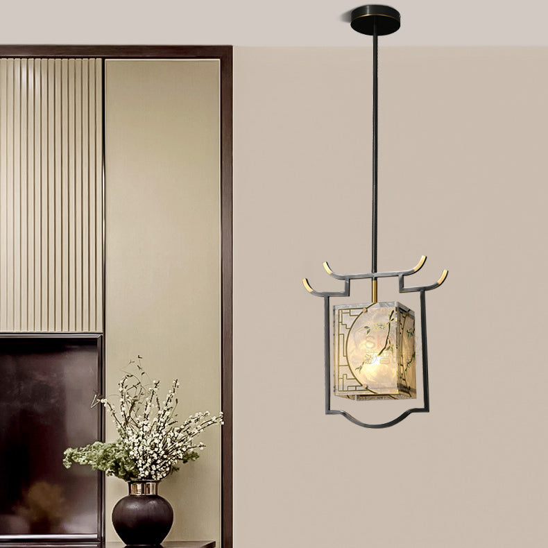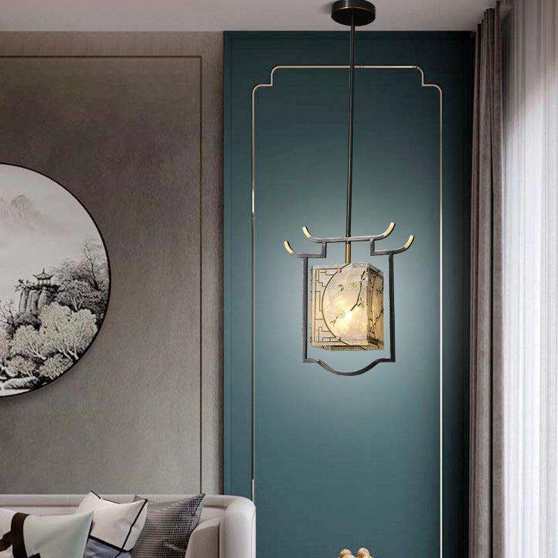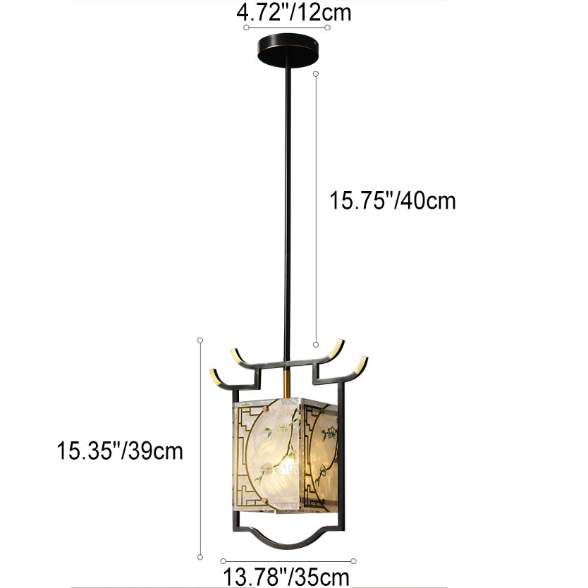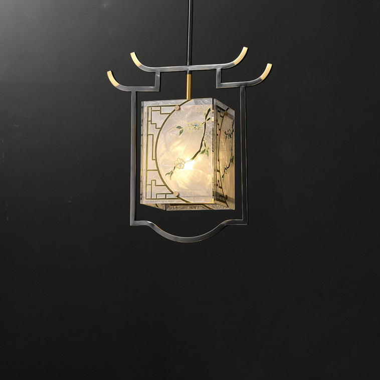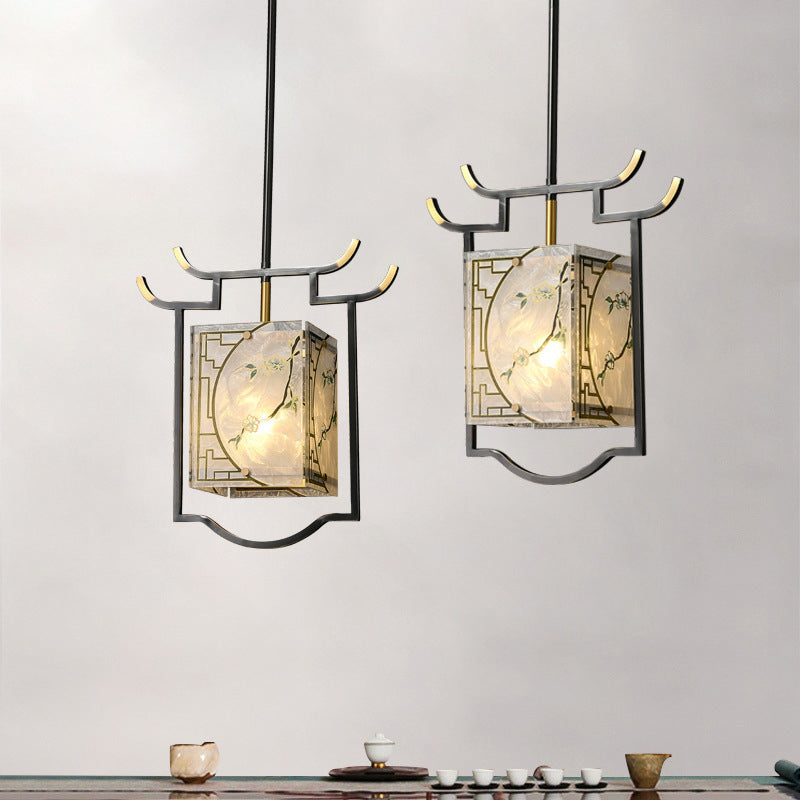 Traditional Chinese Lantern Square Glazed Painting Copper Glass 1-Light Pendant Light For Bedroom