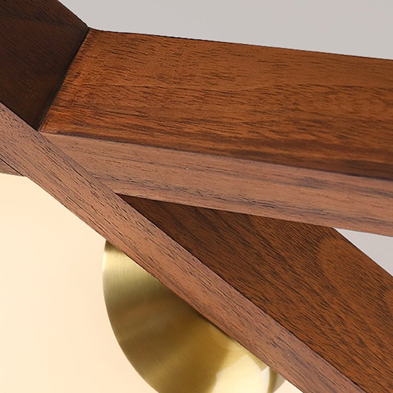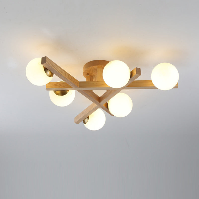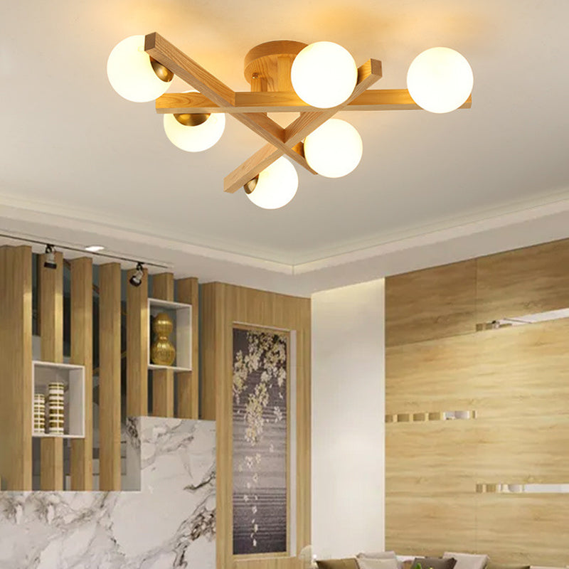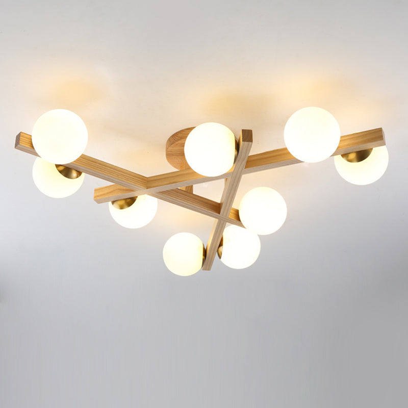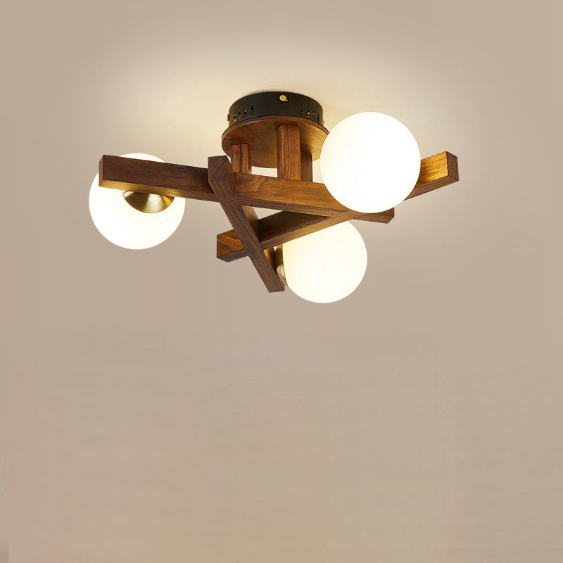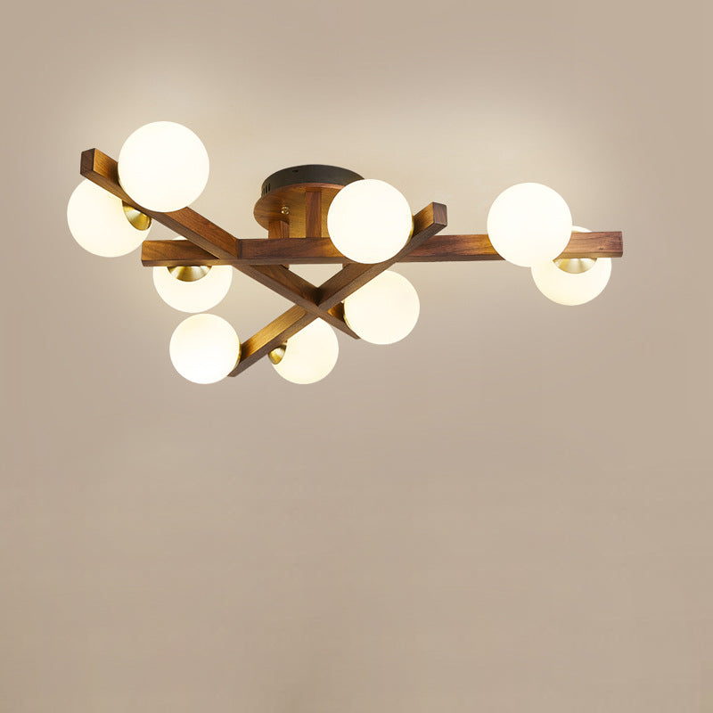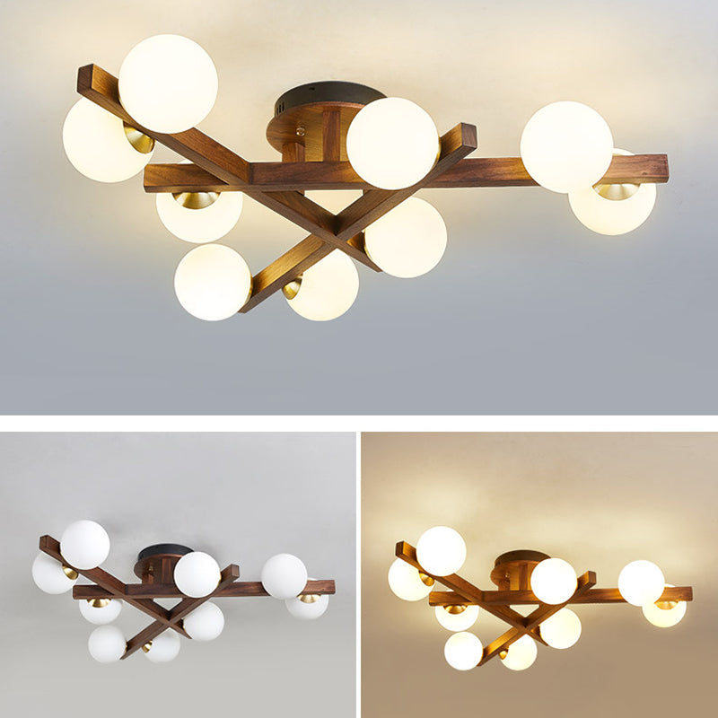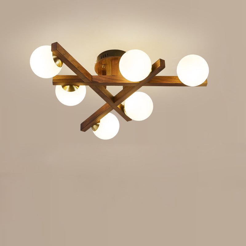 Traditional Chinese Long Round Ball Wooden Copper Frame Glass Shade 3/6/9 Light Semi-Flush Mount Ceiling Light For Living Room