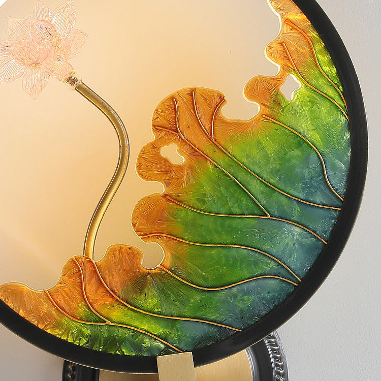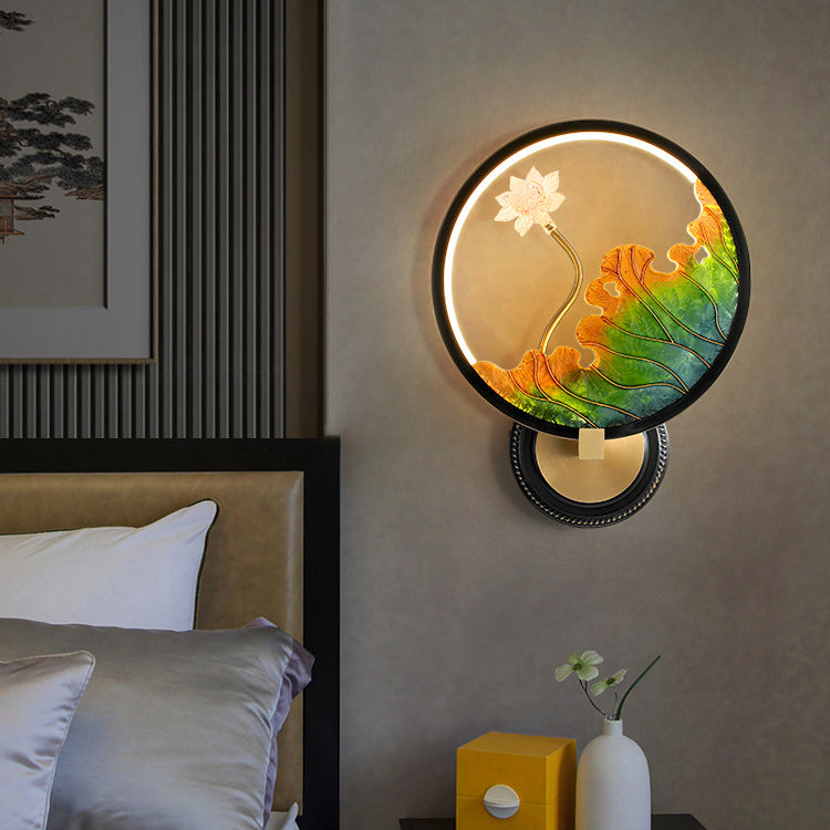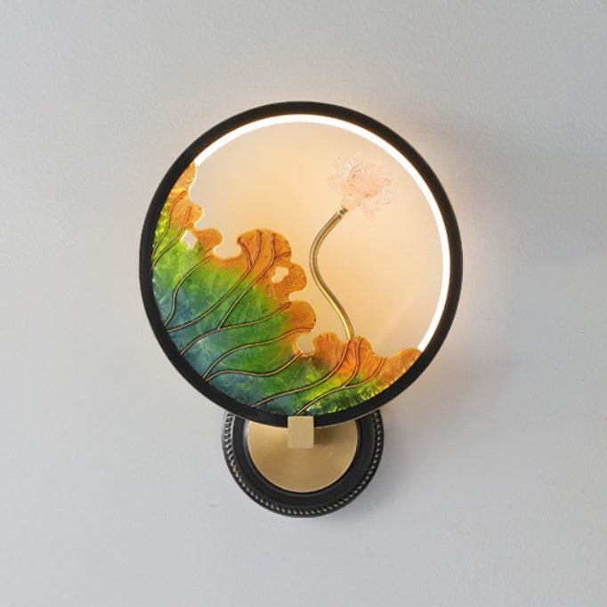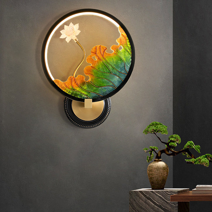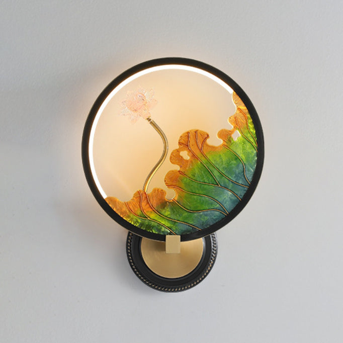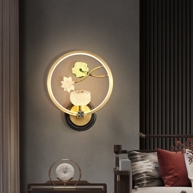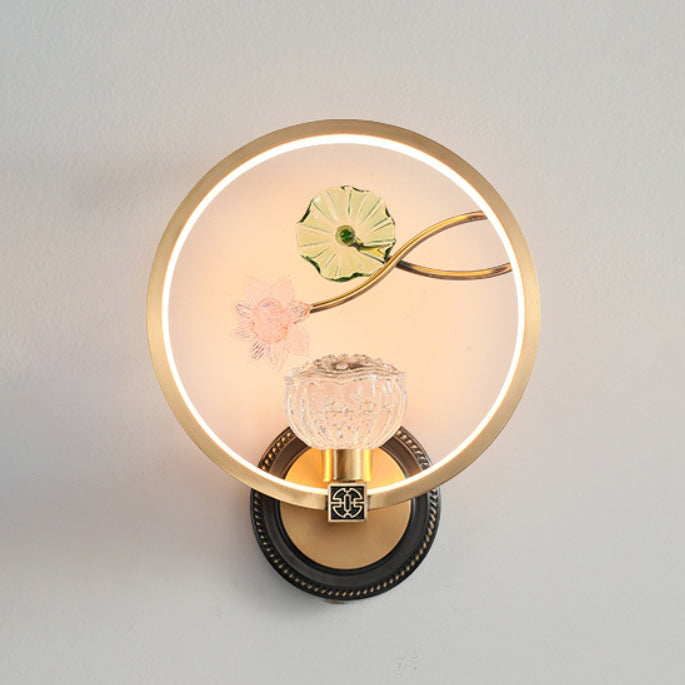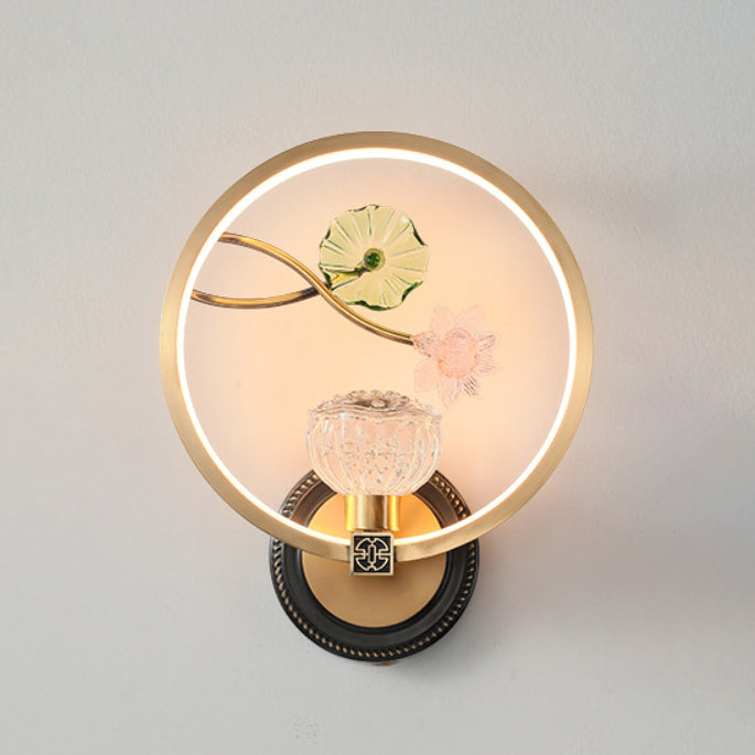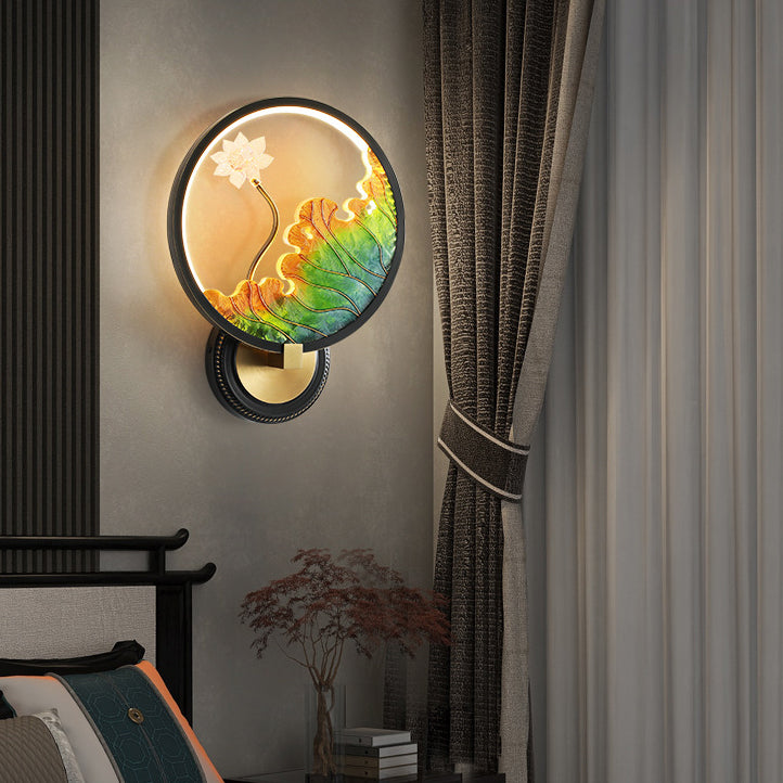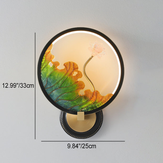 Traditional Chinese Lotus Leaf Flower Round Acrylic Glass Copper LED Wall Sconce Lamp For Living Room