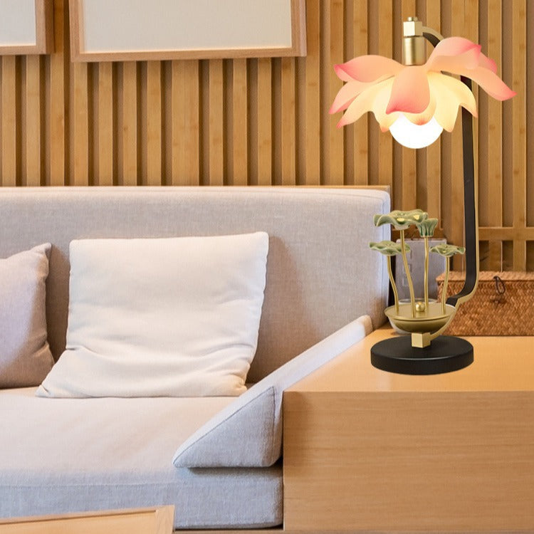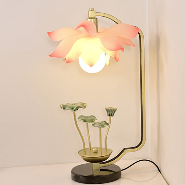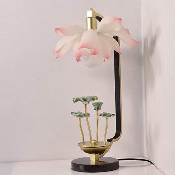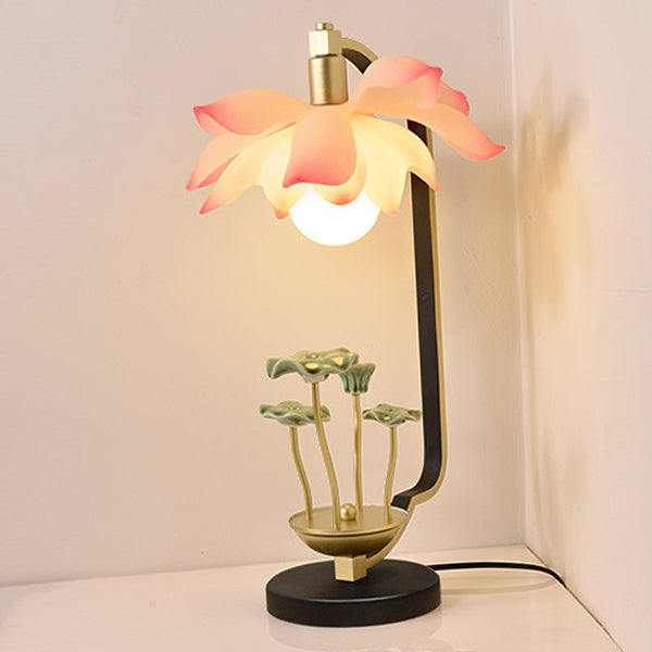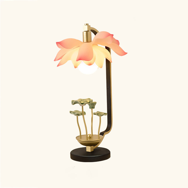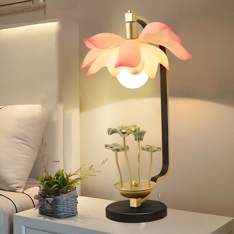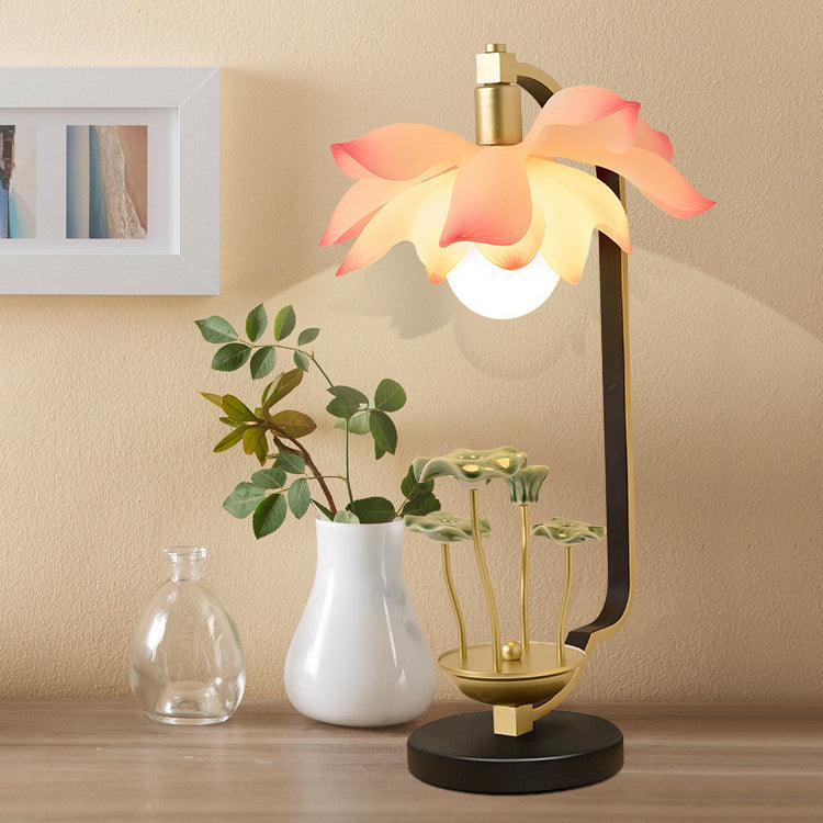 Traditional Chinese Lotus Leaf Round Resin Iron Ceramic 1-Light Table Lamp For Bedroom