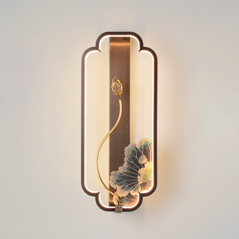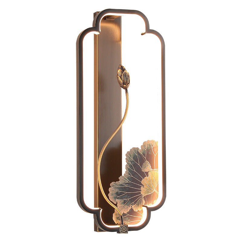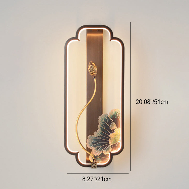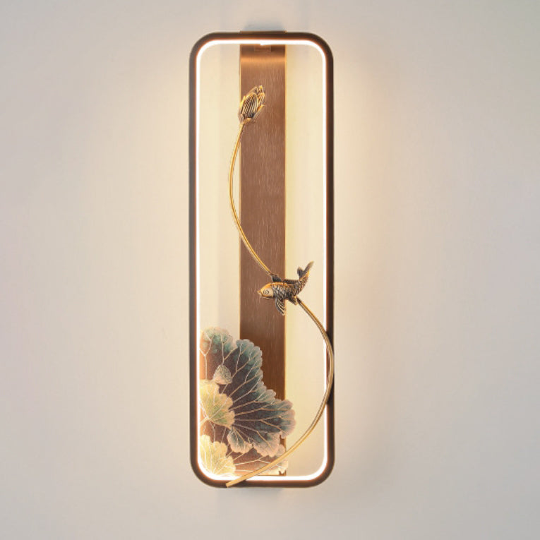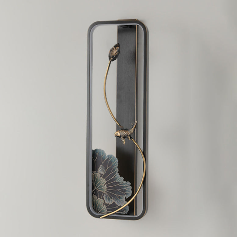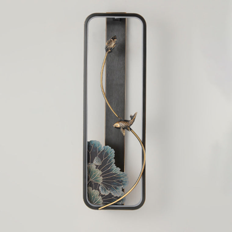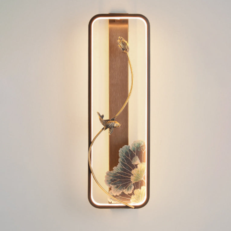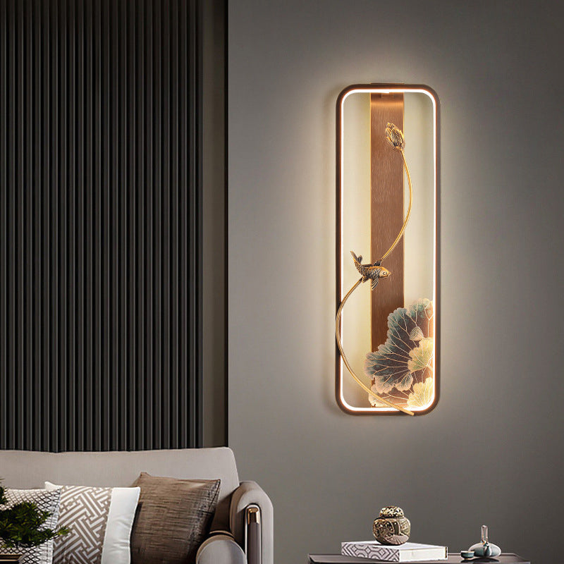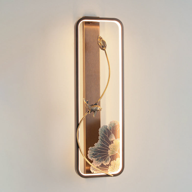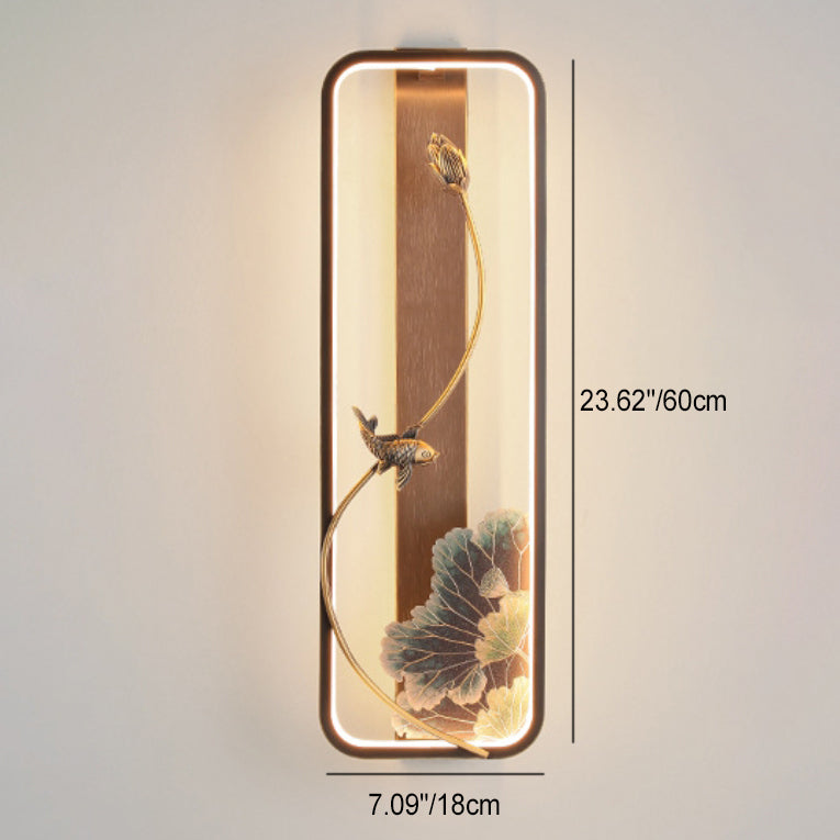 Traditional Chinese Lotus Rectangle Fish Wood Bronze LED Wall Sconce Lamp For Living Room