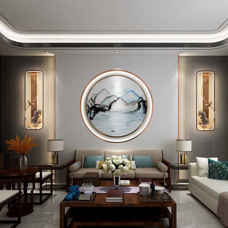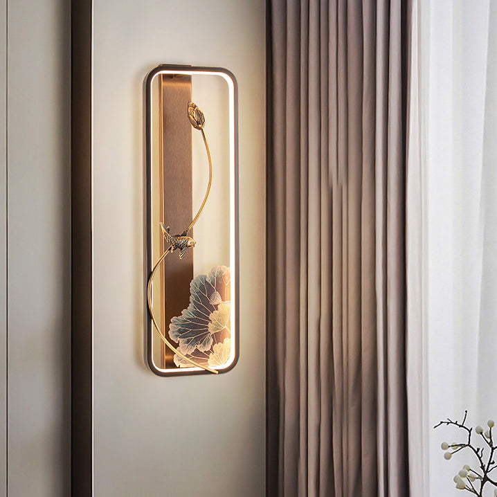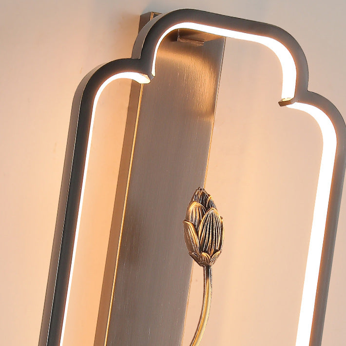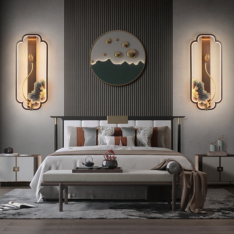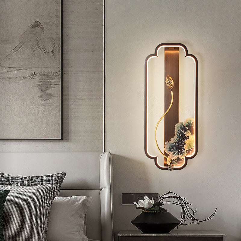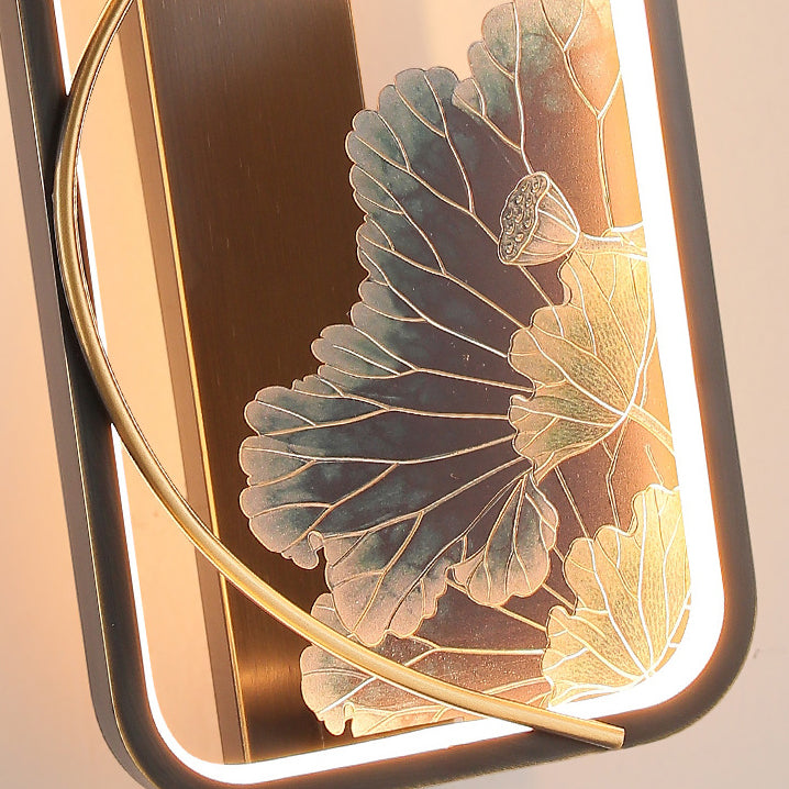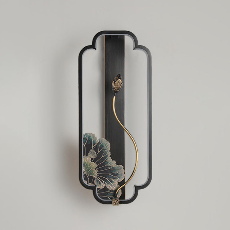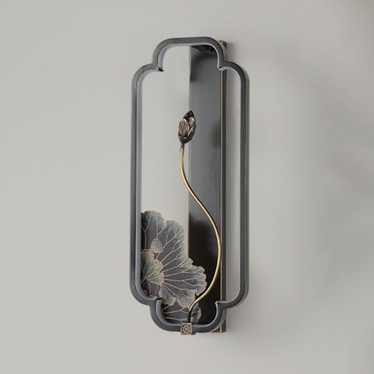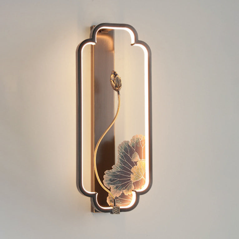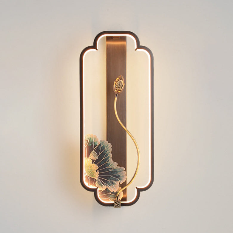 Traditional Chinese Lotus Rectangle Fish Wood Bronze LED Wall Sconce Lamp For Living Room