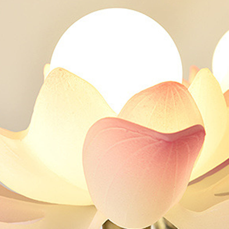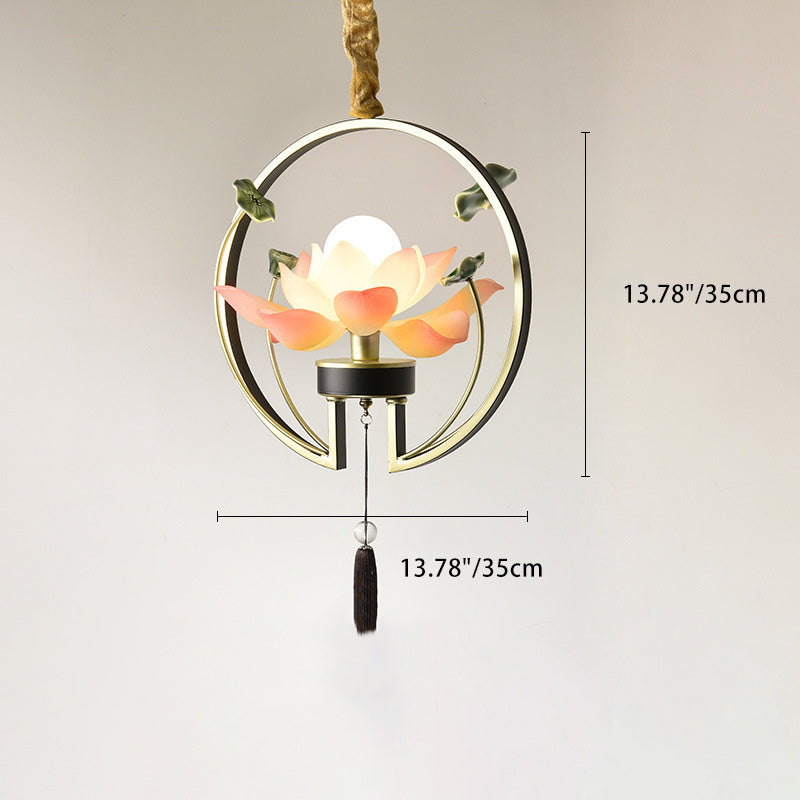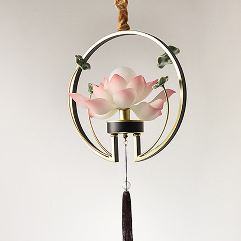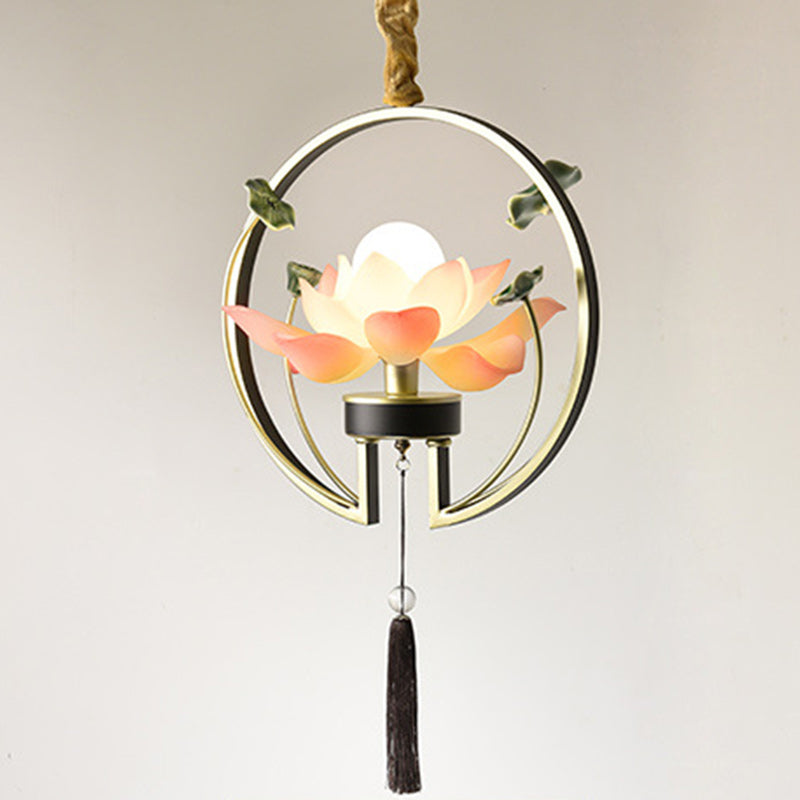 Traditional Chinese Lotus Tassel Round Resin Ceramic Iron 1-Light Pendant Light For Bedroom