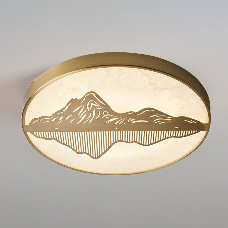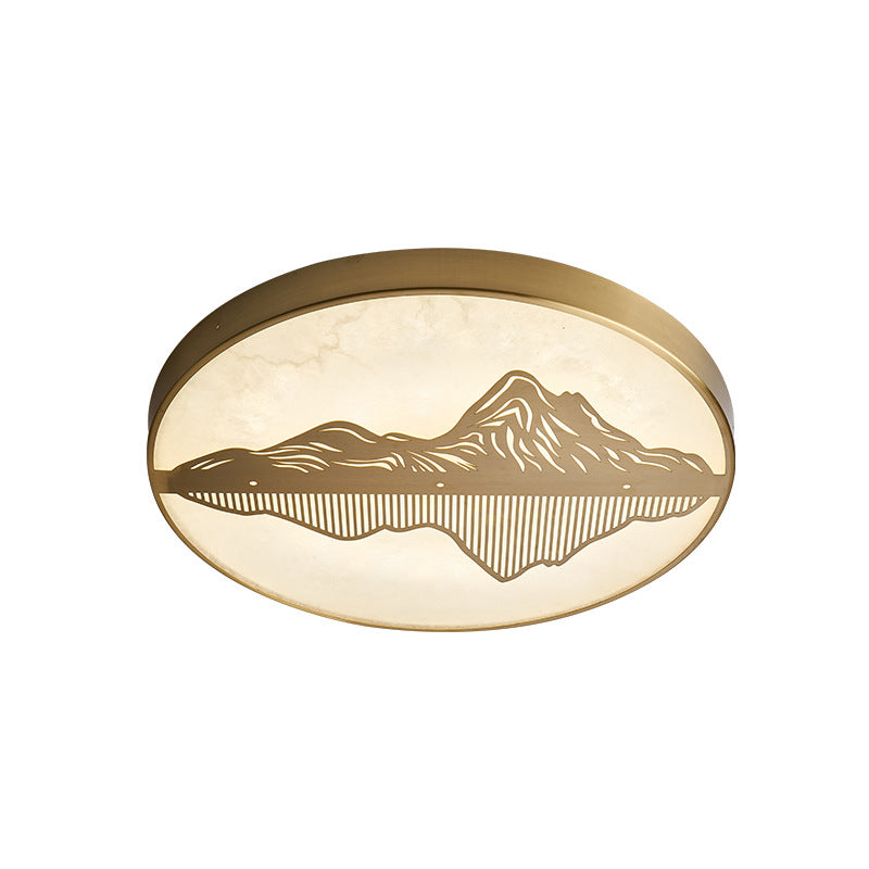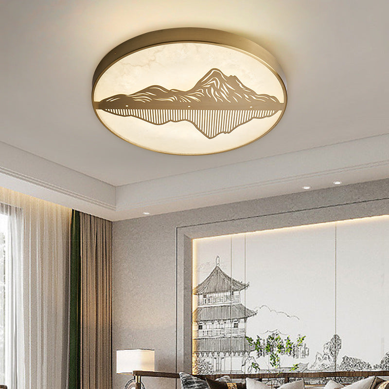 Traditional Chinese Marble Brass Landscape Round LED Flush Mount Ceiling Light For Bedroom
