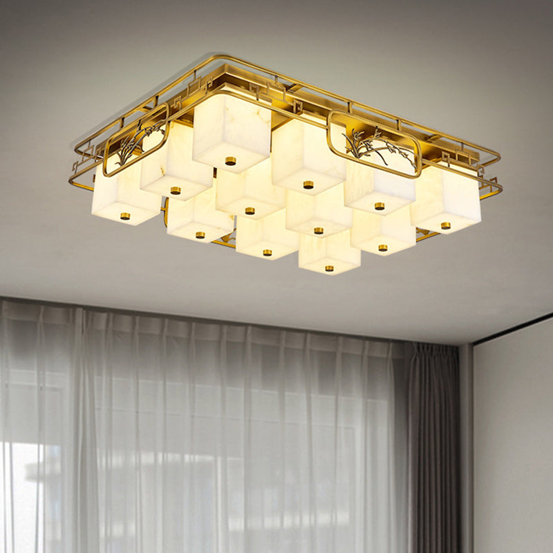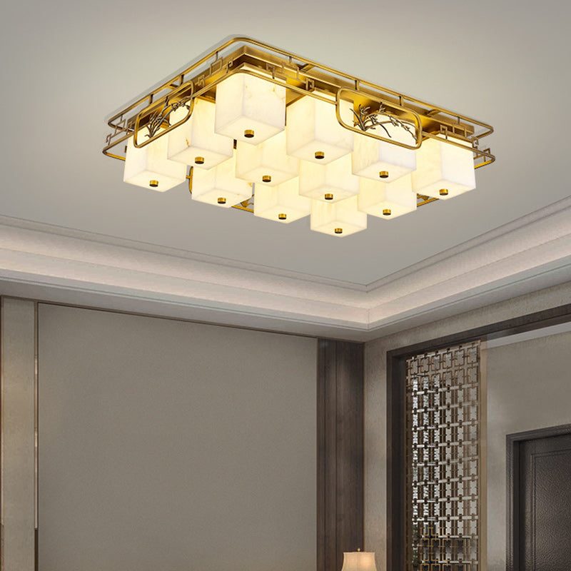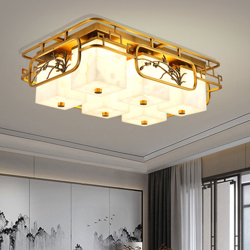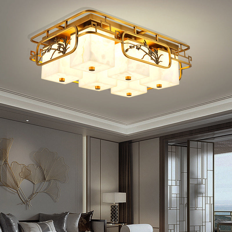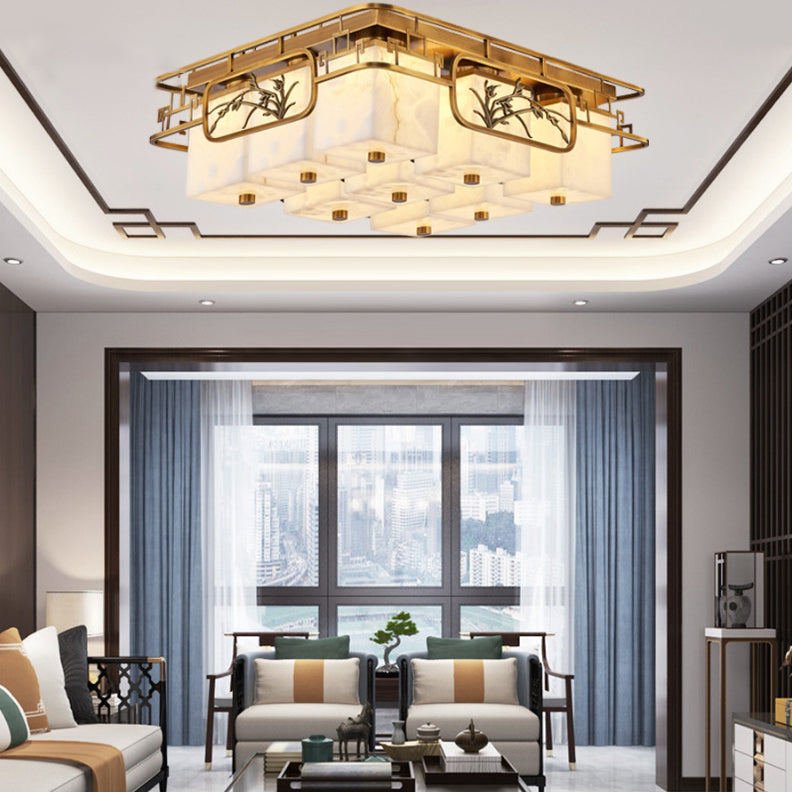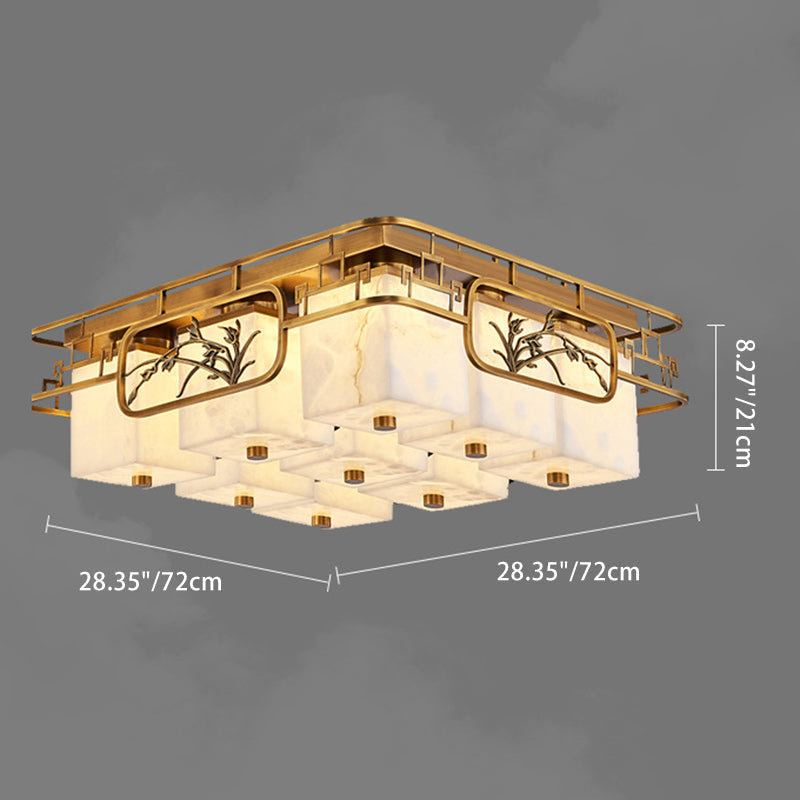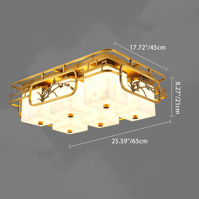 Traditional Chinese Marble Brass Square Rectangular LED Flush Mount Ceiling Light For Living Room