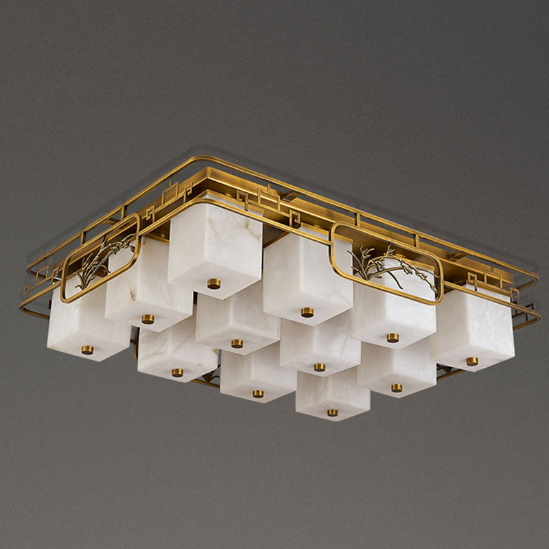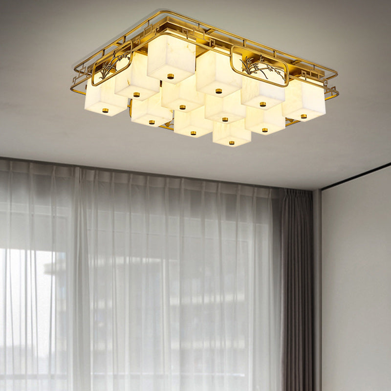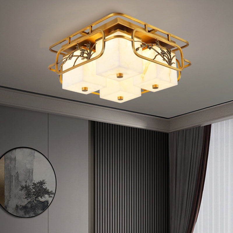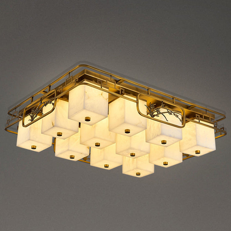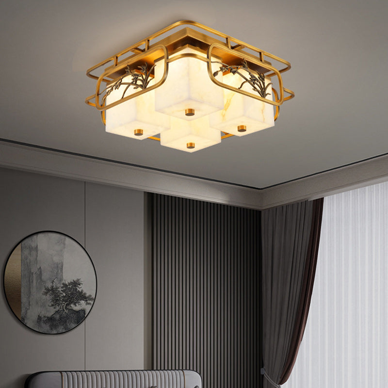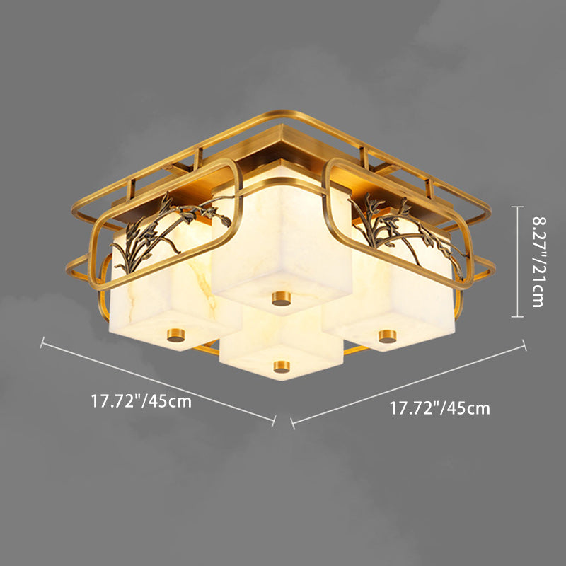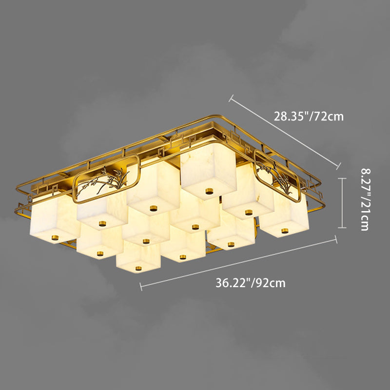 Traditional Chinese Marble Brass Square Rectangular LED Flush Mount Ceiling Light For Living Room