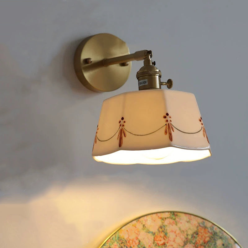Traditional Chinese Octagonal Trapezoidal Firework Printed Ceramic Shade Brass 1-Light Wall Sconce Lamp For Living Room