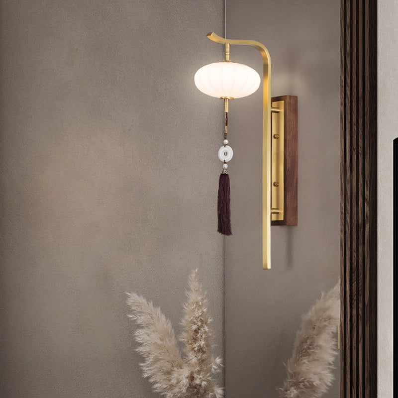 Traditional Chinese Oval Lantern Copper Walnut Lampshade 1 - Light Wall Sconce Lamp For Living Room