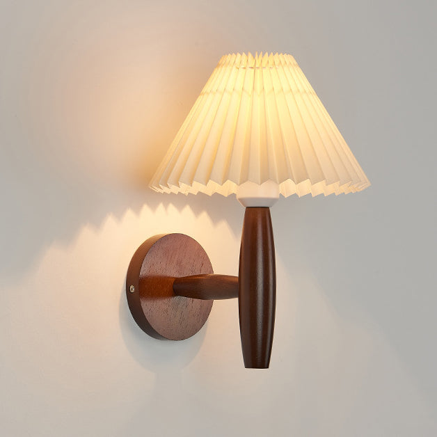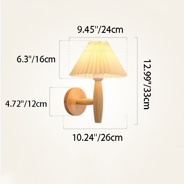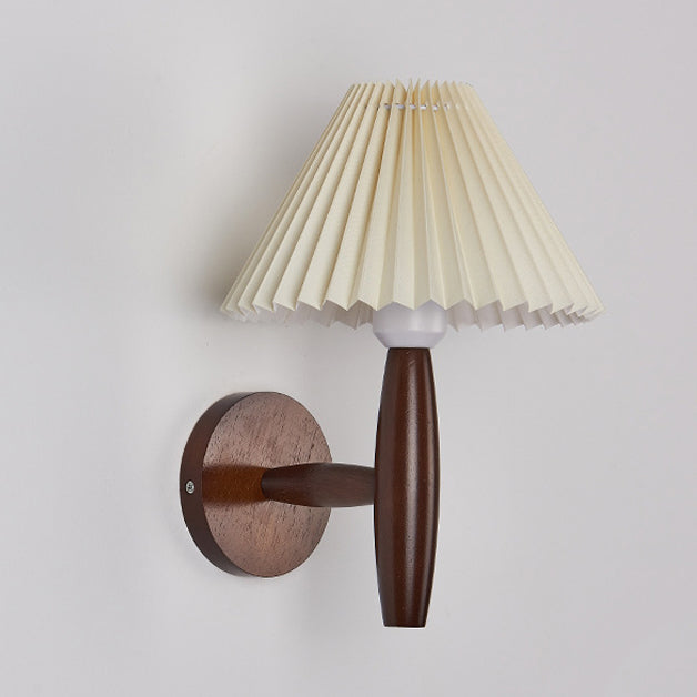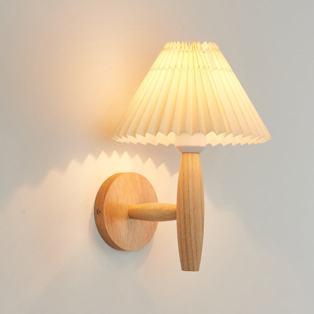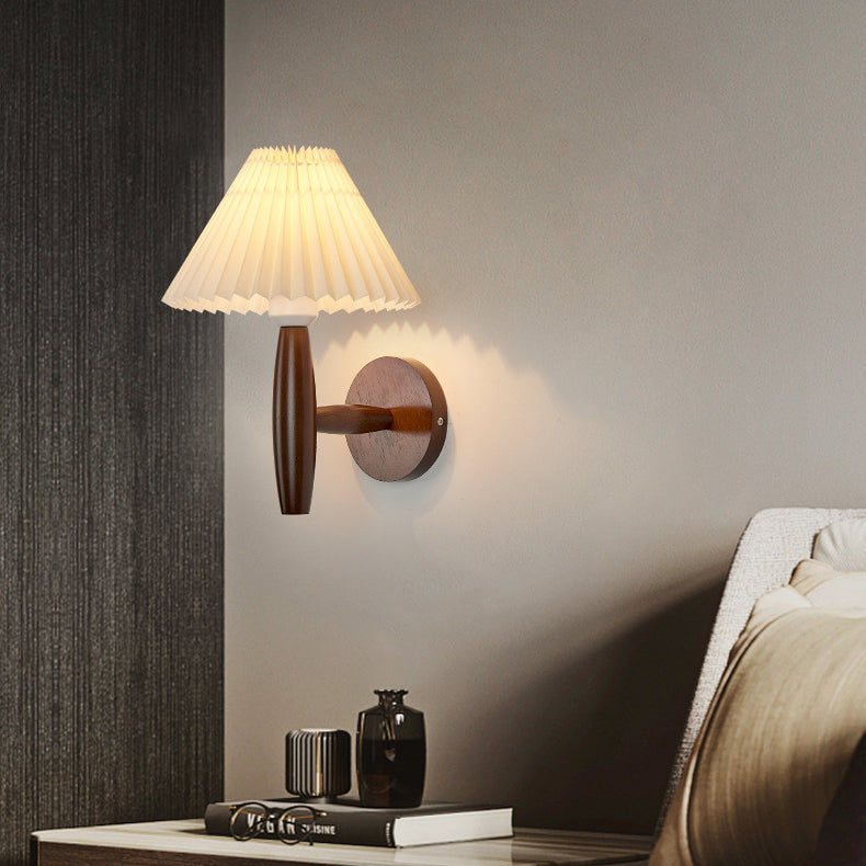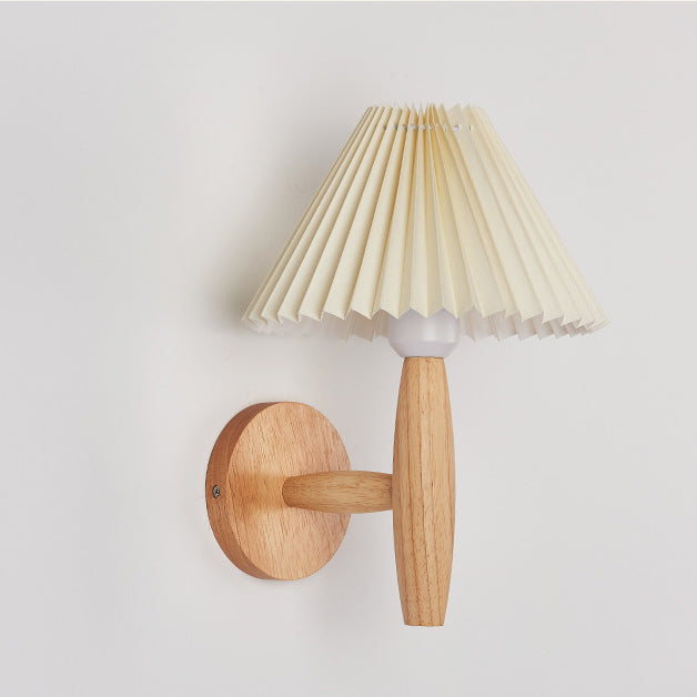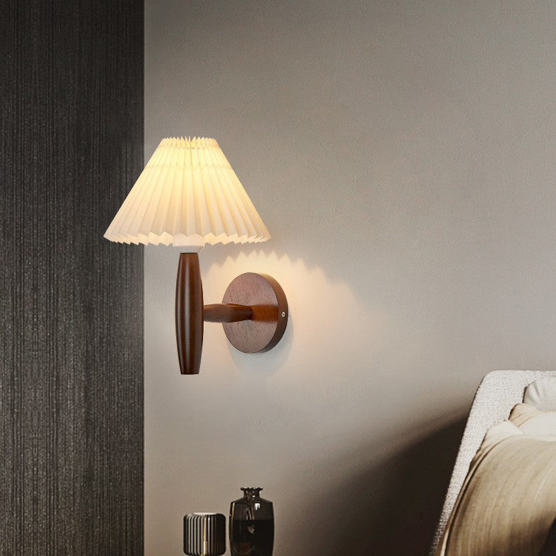 Traditional Chinese Pleated Umbrella Fabric Shade Wood 1-Light Wall Sconce Lamp For Living Room
