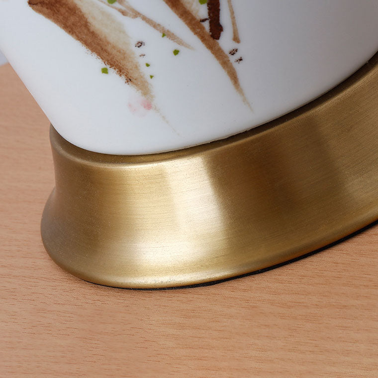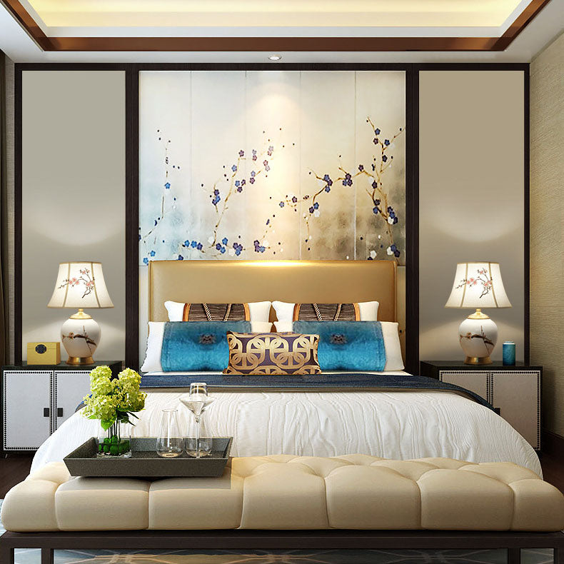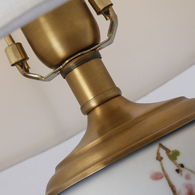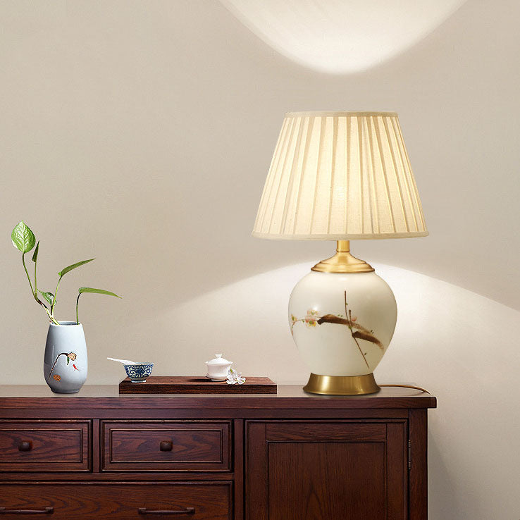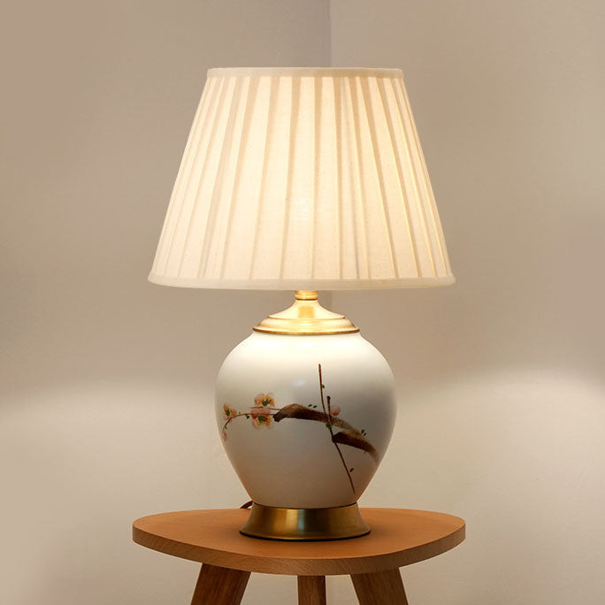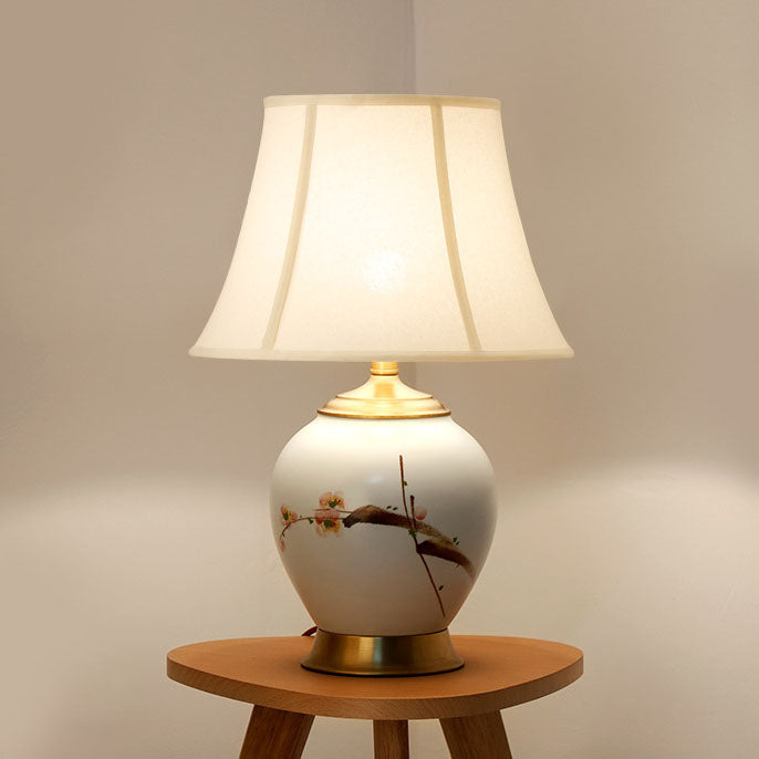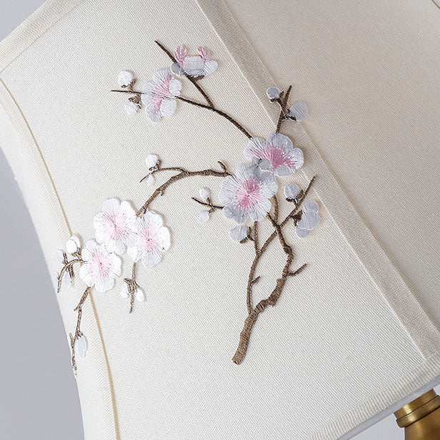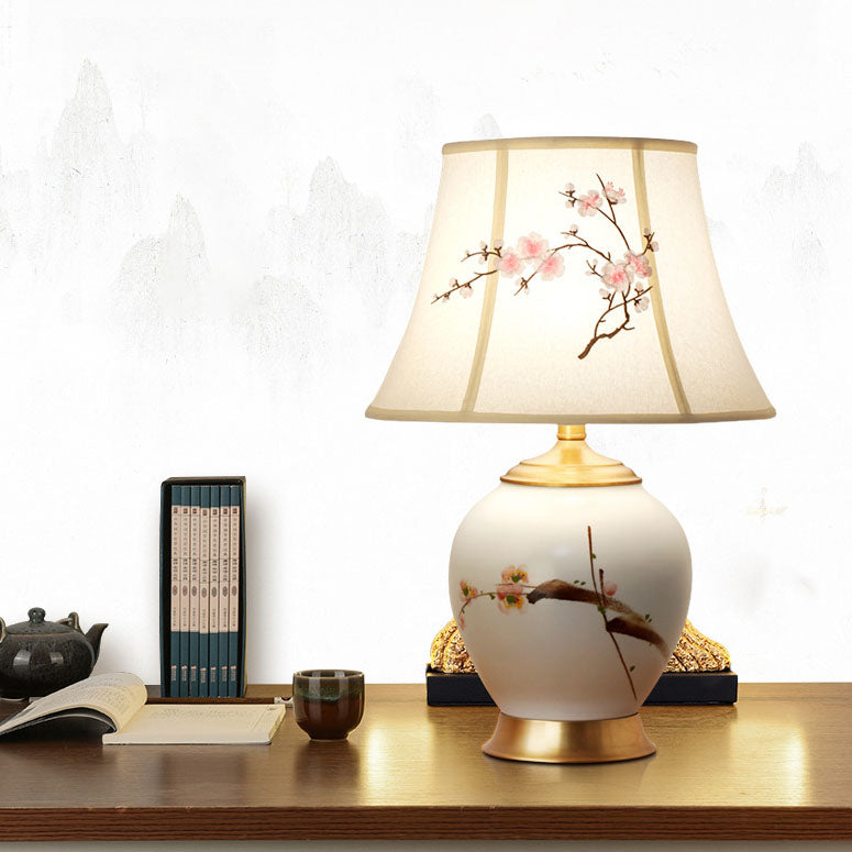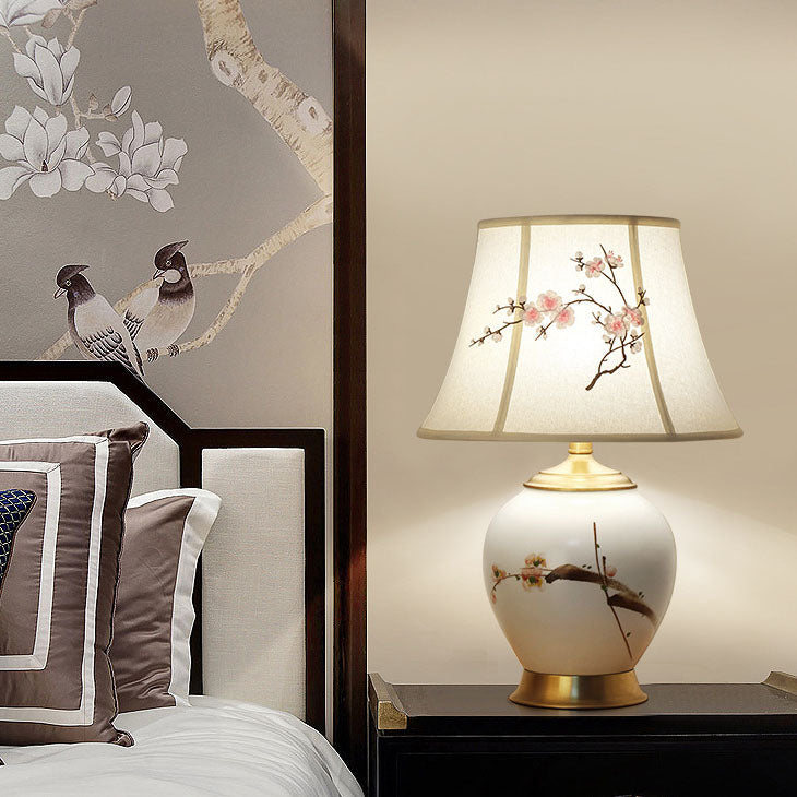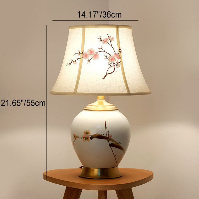 Traditional Chinese Plum Flower Embroidered Fabric Shade Ceramic Base 1-Light Table Lamp For Bedroom