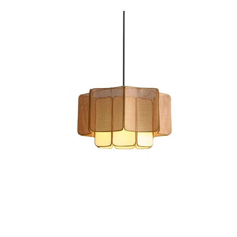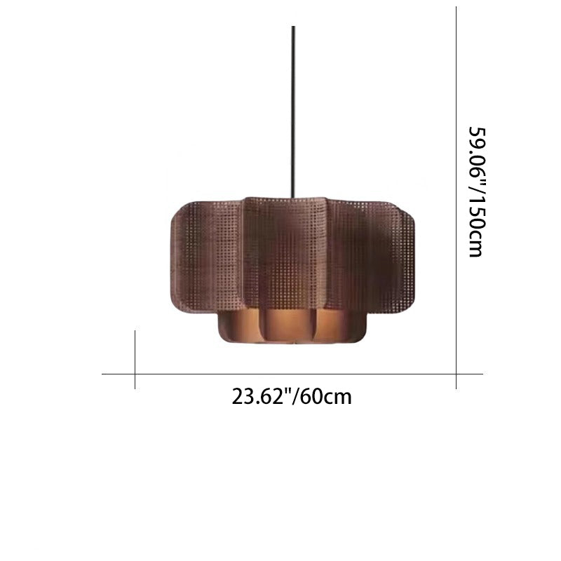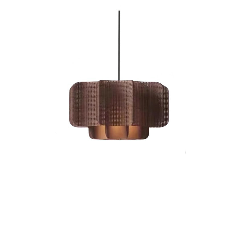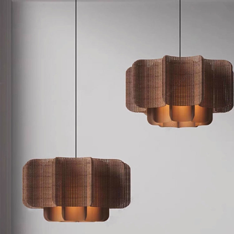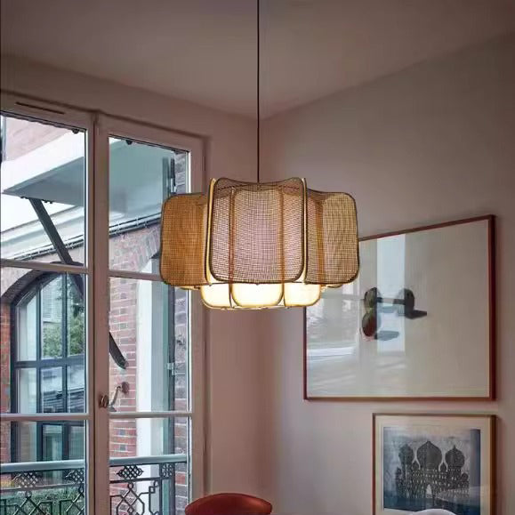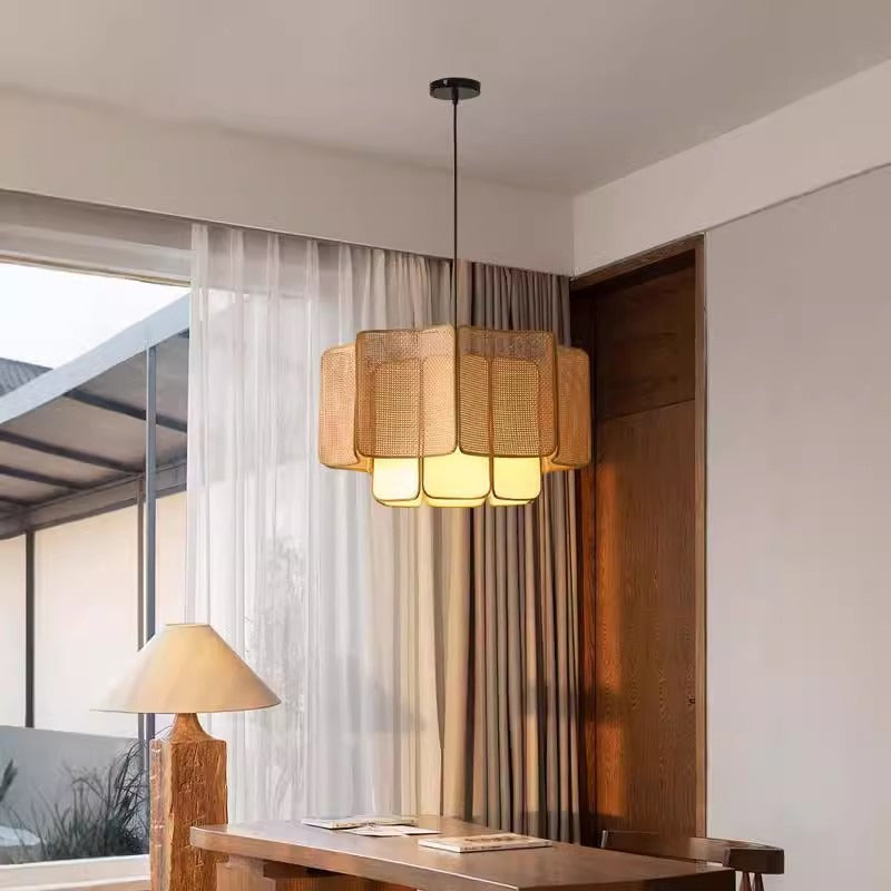 This traditional Chinese pendant light features a unique combination of rattan, iron, and fabric with a round and rectangular design, bringing a serene and elegant touch to dining rooms and living spaces. The adjustable hanging cord and warm wood tones in natural and coffee colors make it a perfect addition to modern tea rooms, restaurants, and homes.