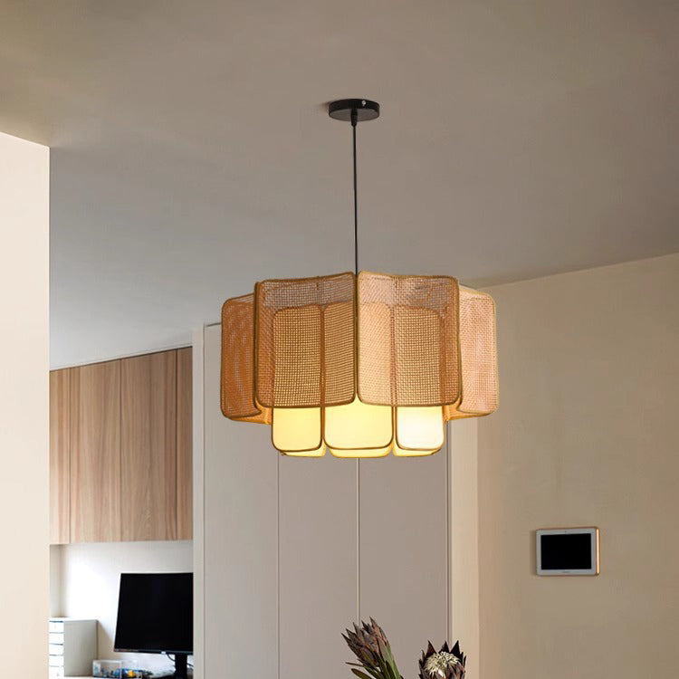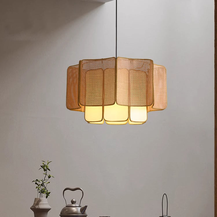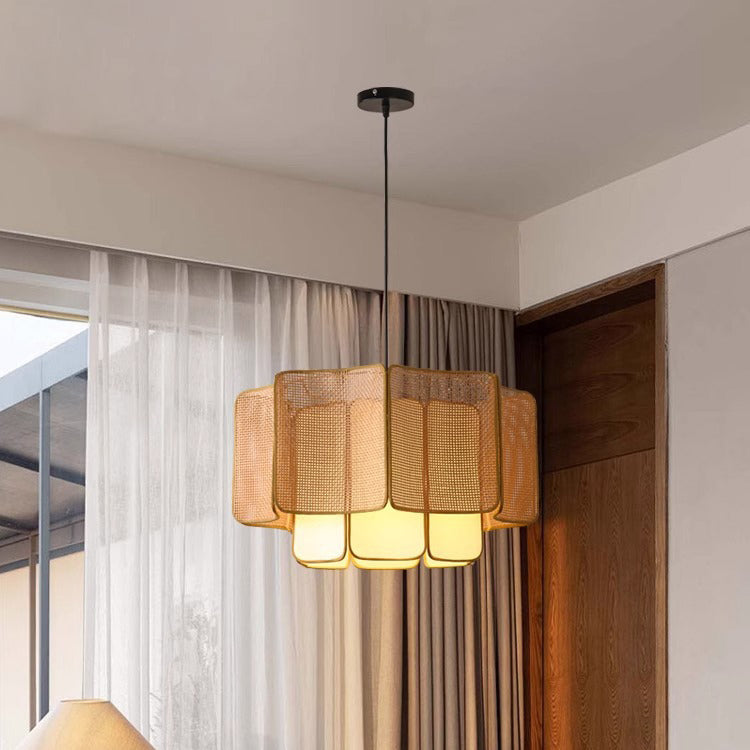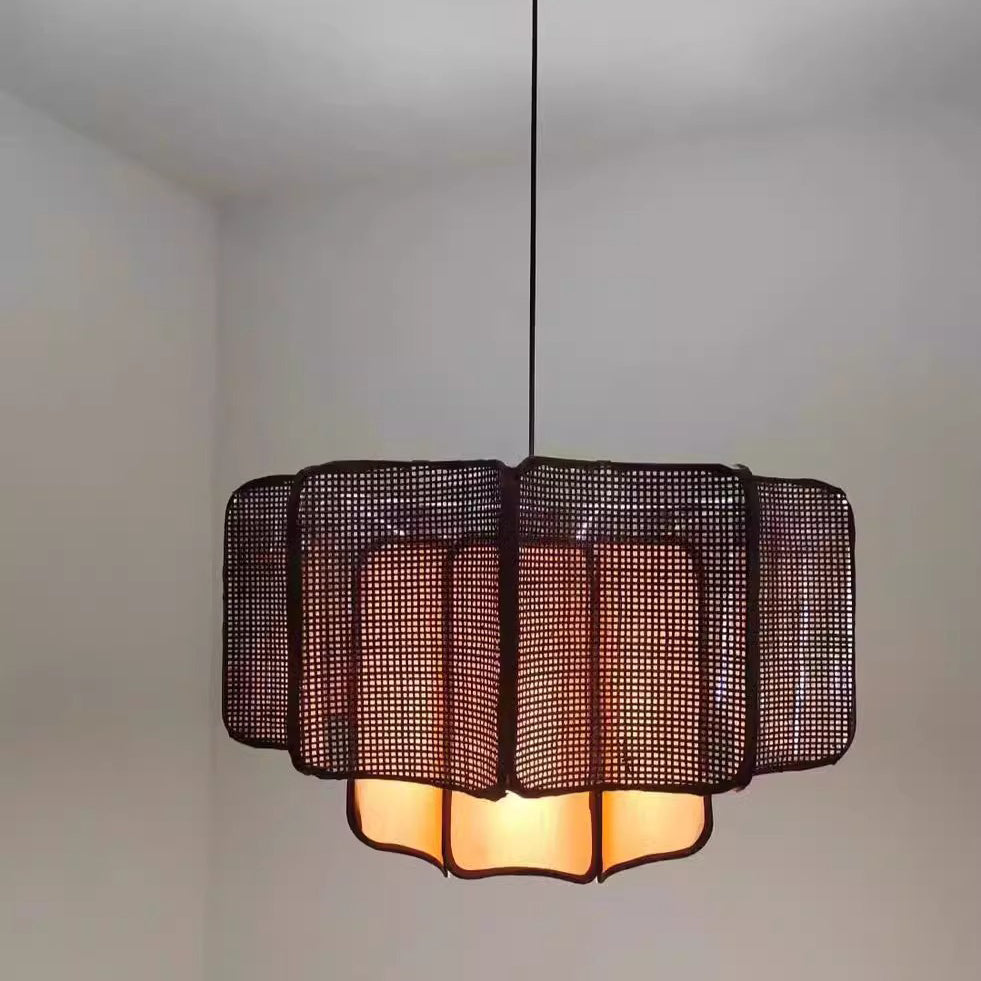Traditional Chinese Rattan, Iron & Fabric Round & Rectangular 1-Light Pendant Light For Dining Room & Living Room