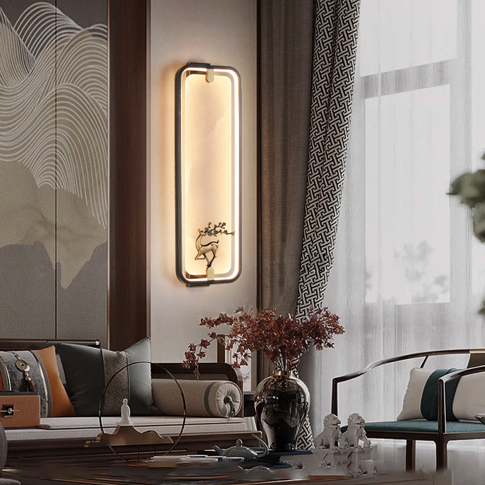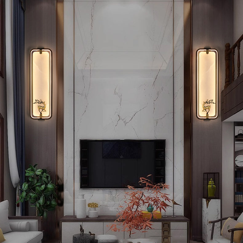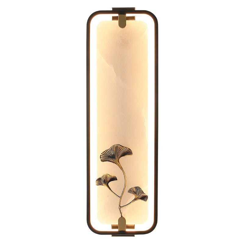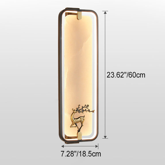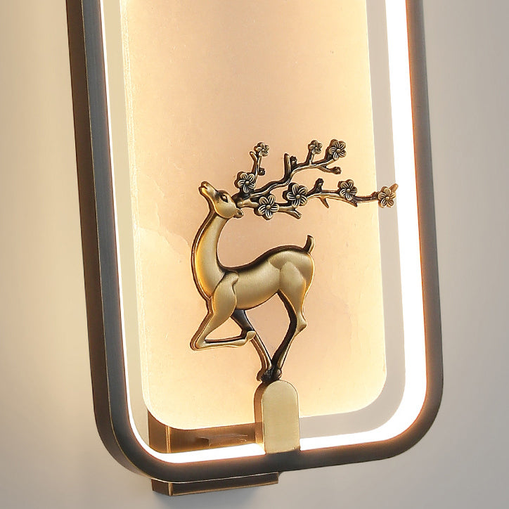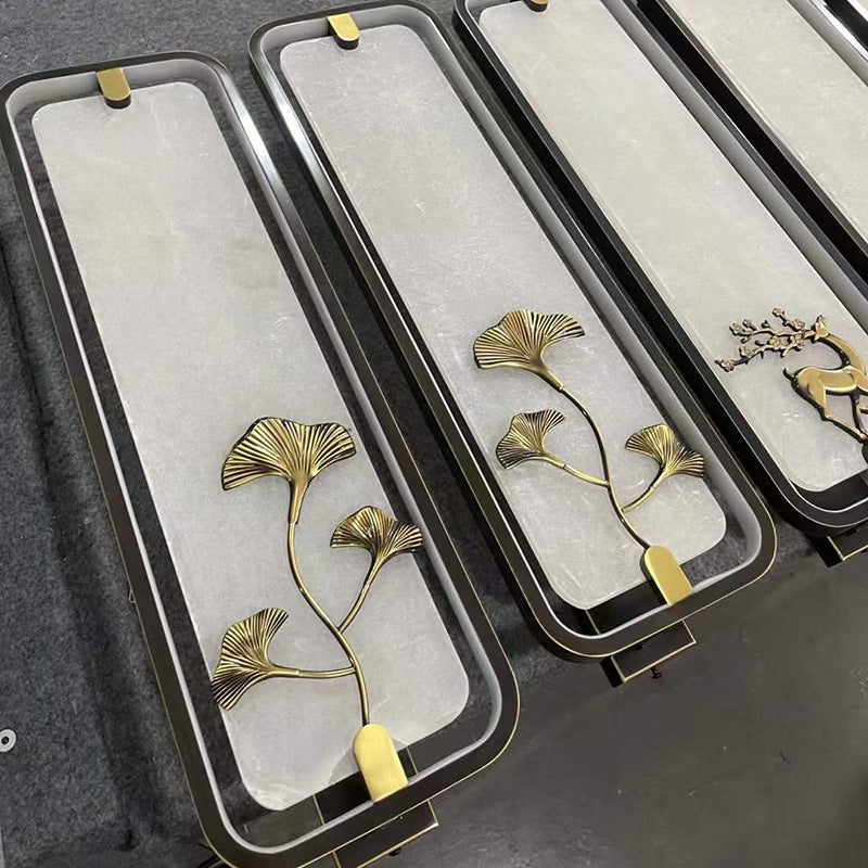 Traditional Chinese Rectangle Fairy Deer Apricot Leaf Marble Copper LED Wall Sconce Lamp For Living Room