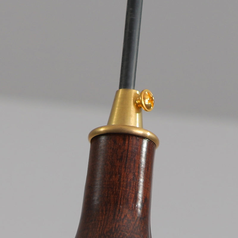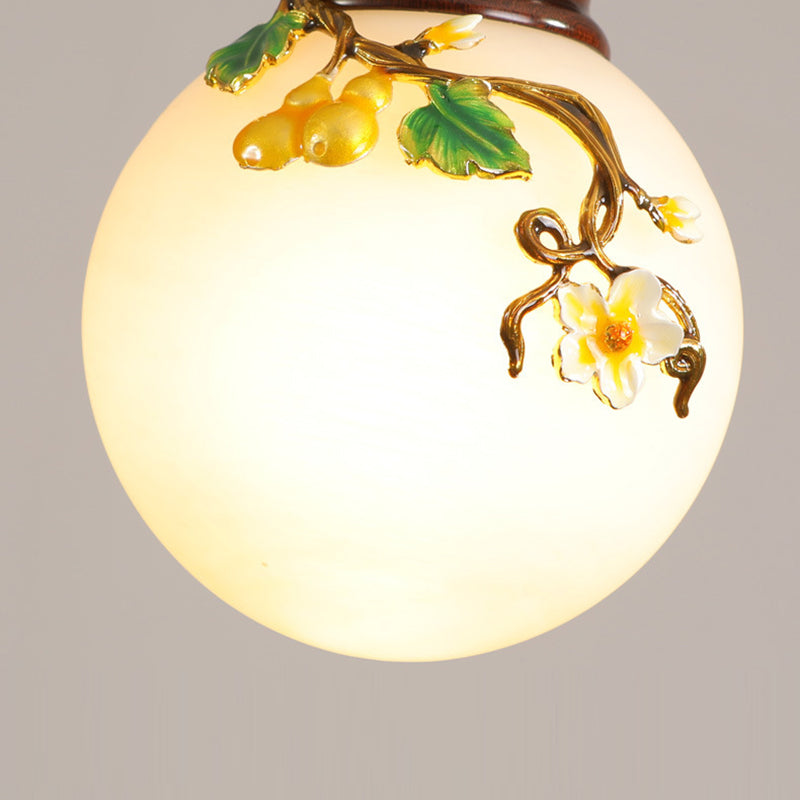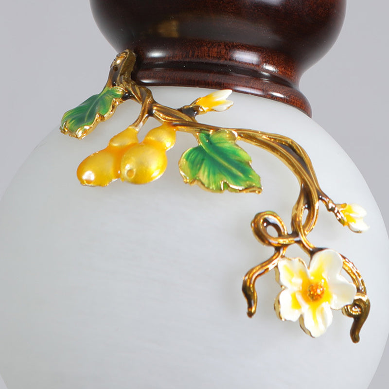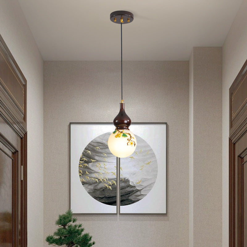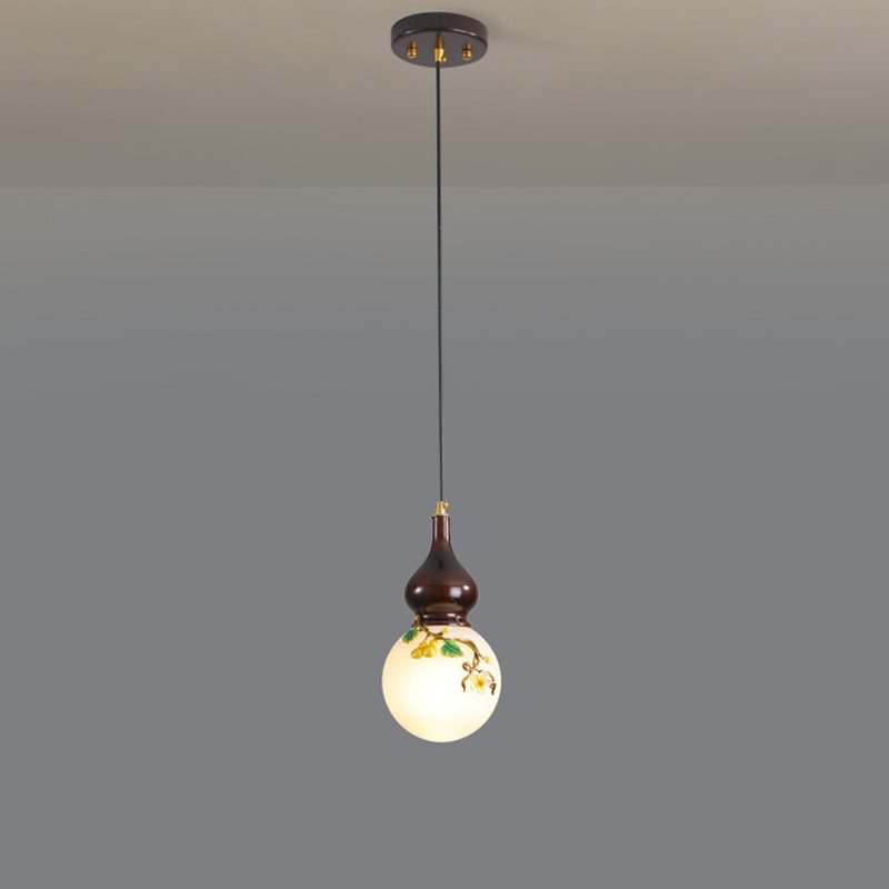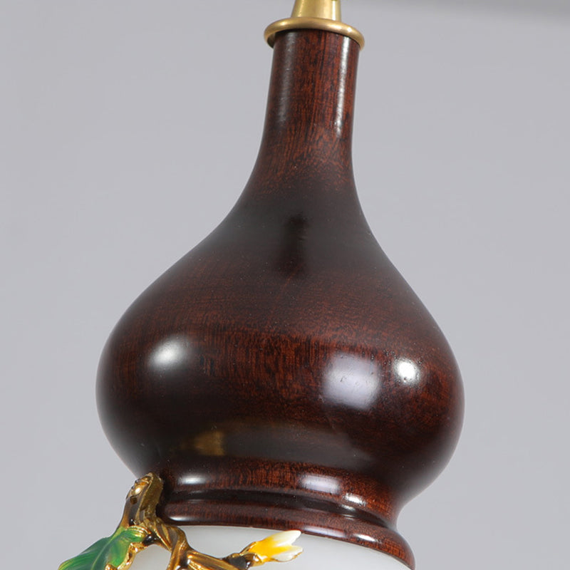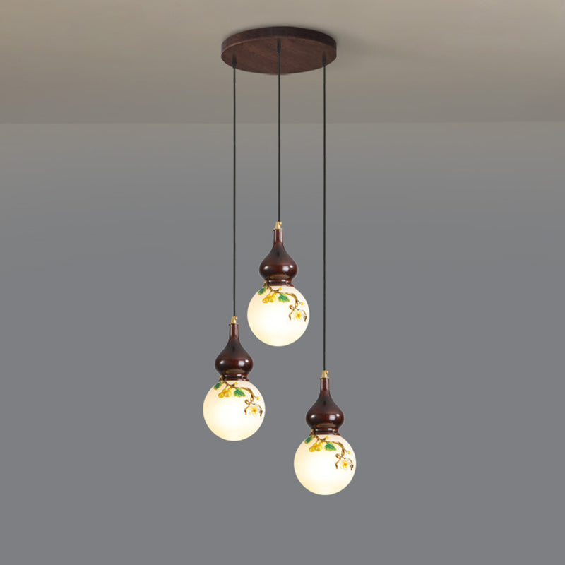 Traditional Chinese Round Gourd Wood Brass Enameled Glass Shade 1/3/6 Light Chandelier For Living Room