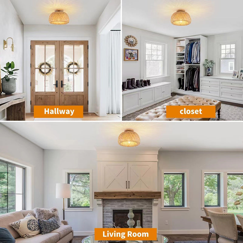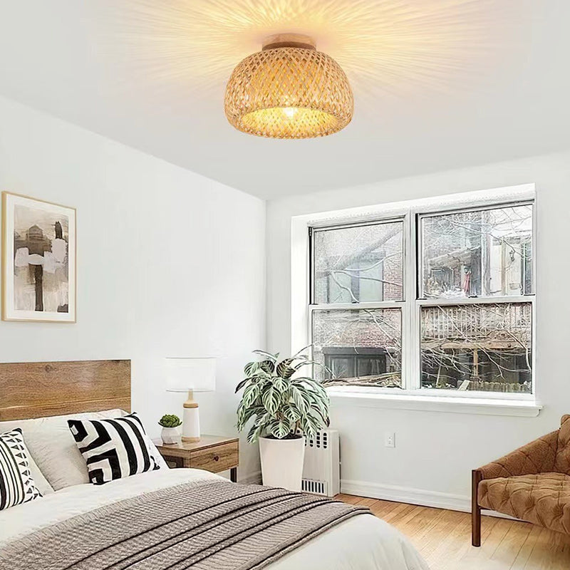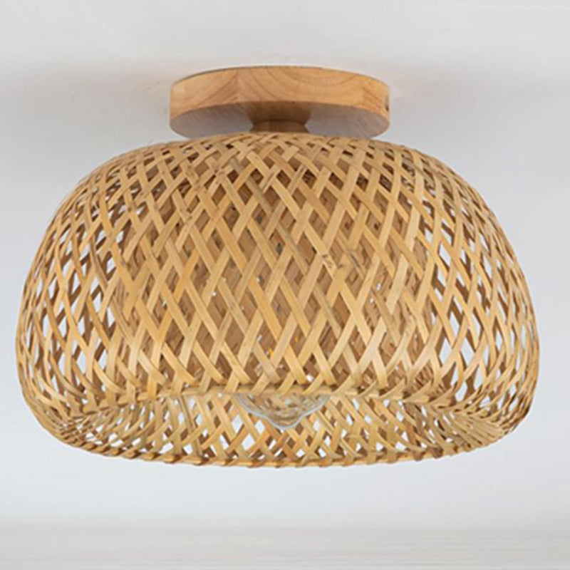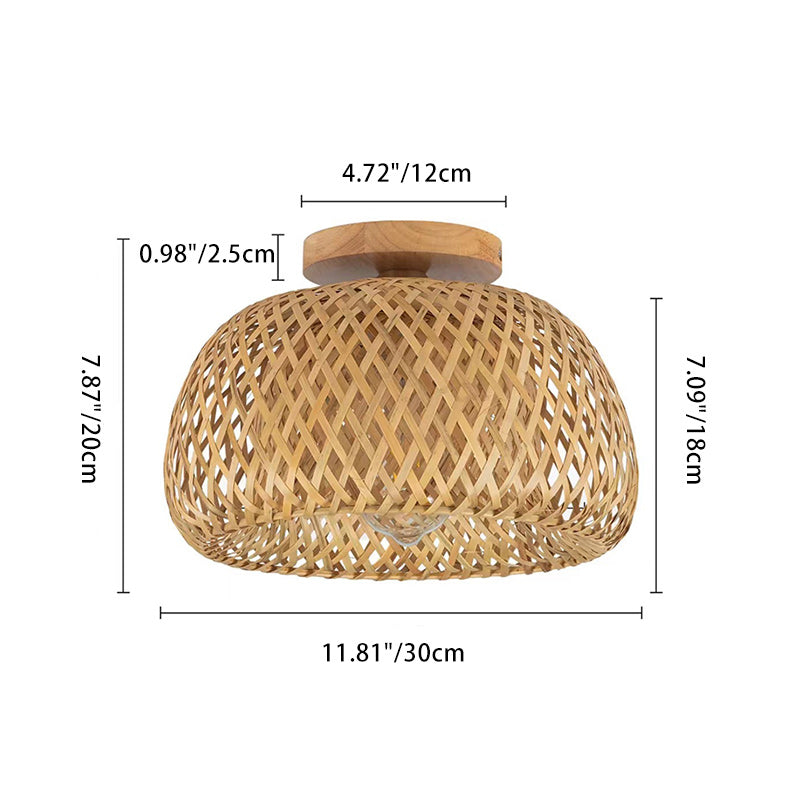 Traditional Chinese Round Wood Rattan 1-Light Semi-Flush Mount Ceiling Light For Dining Room