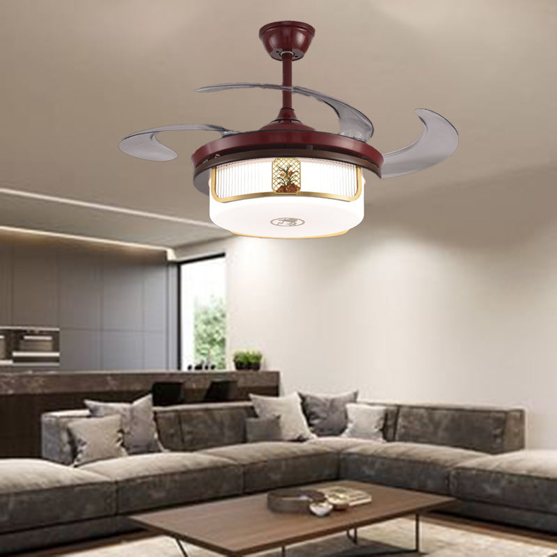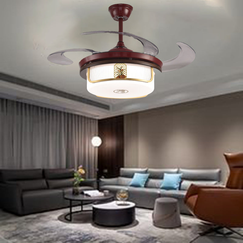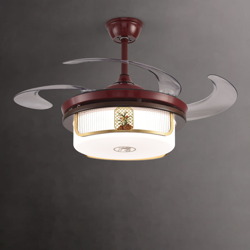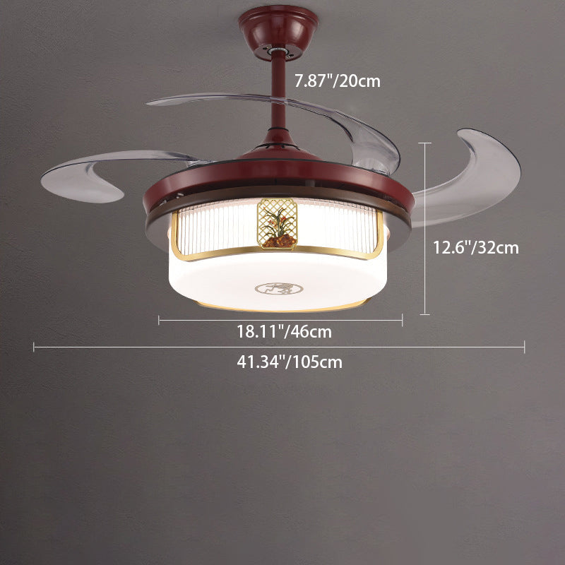 Traditional Chinese Sandalwood Hardware Stainless Steel Acrylic Round Cymbidium LED Downrods Ceiling Fan Light For Living Room