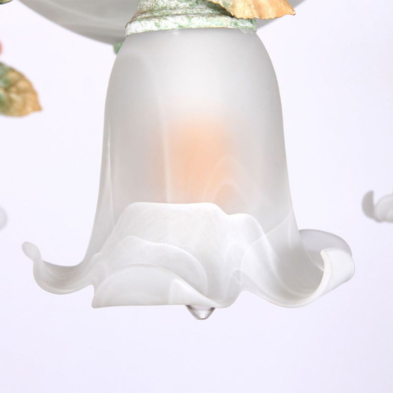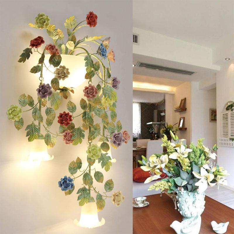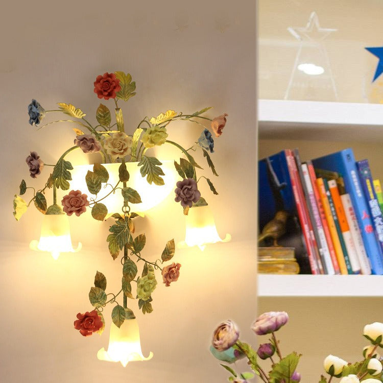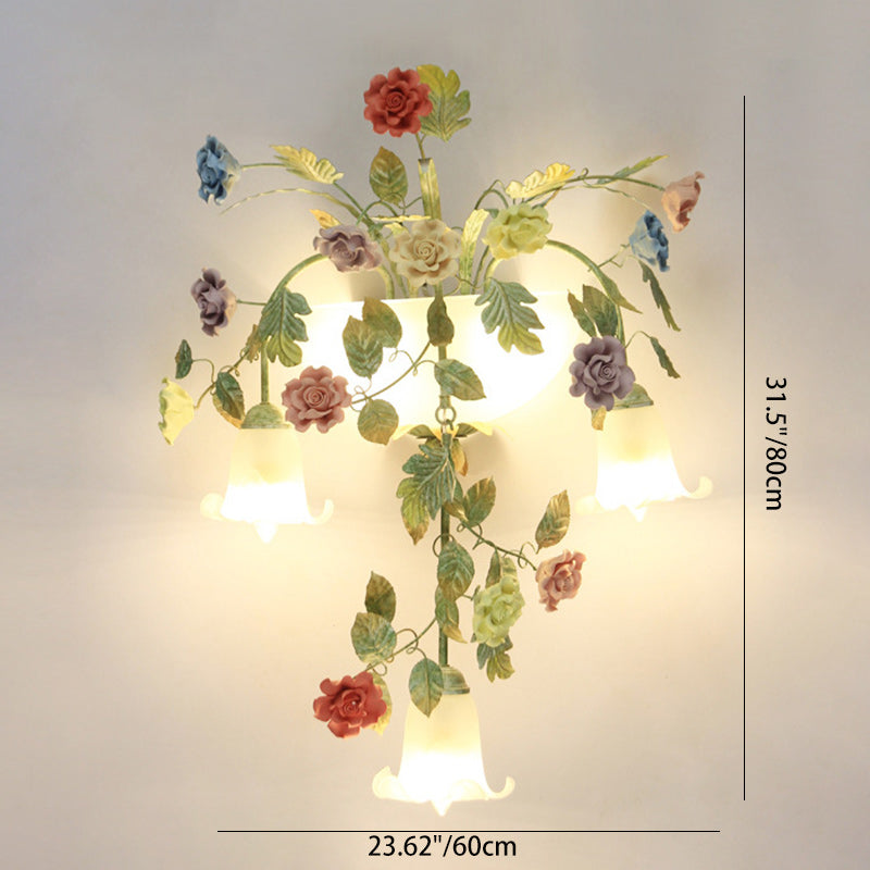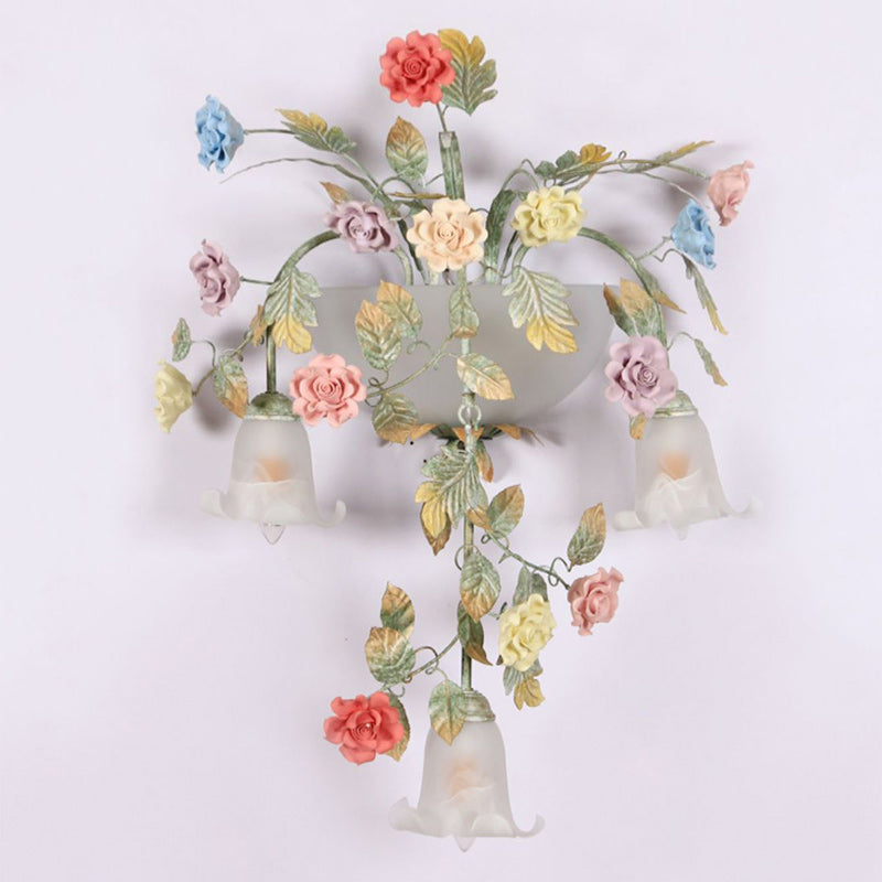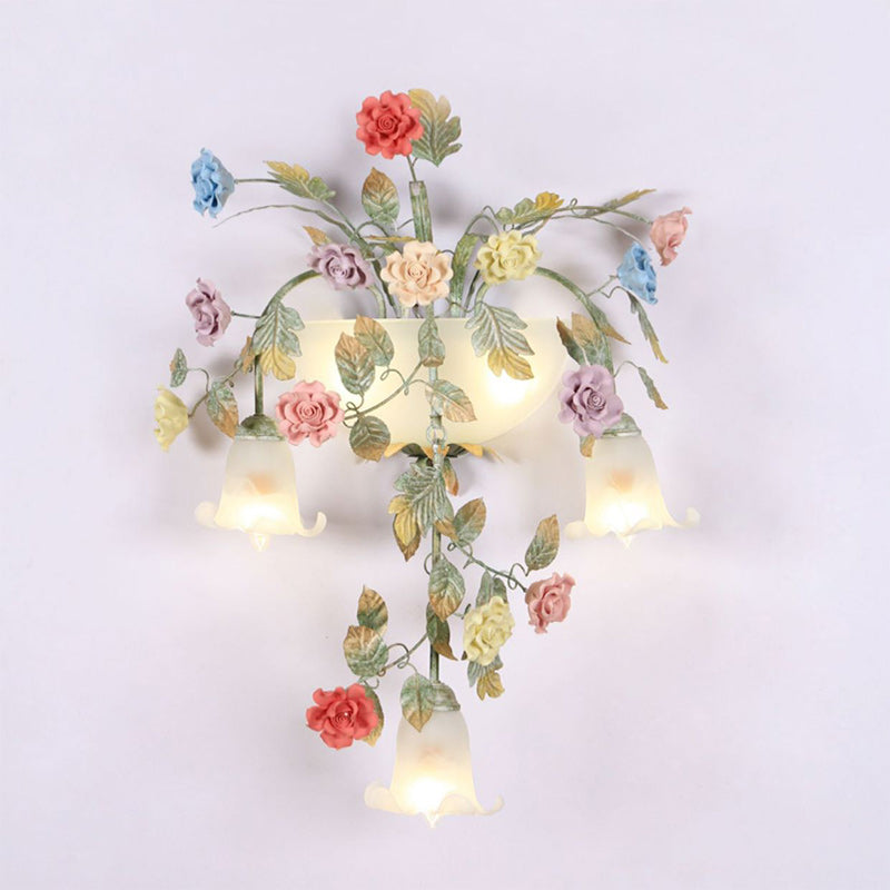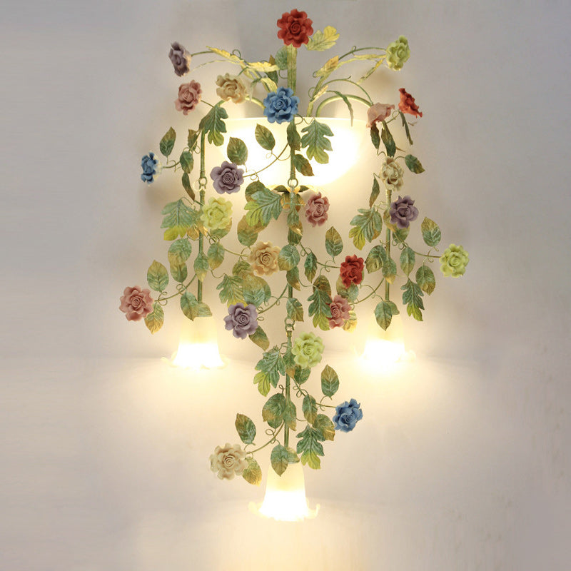 Traditional Farmhouse Iron Ceramic Glass Rose Floral Decorative 5-Light Wall Sconce Lamp For Living Room And Bedroom
