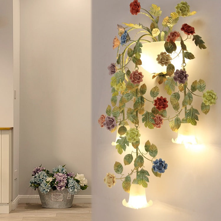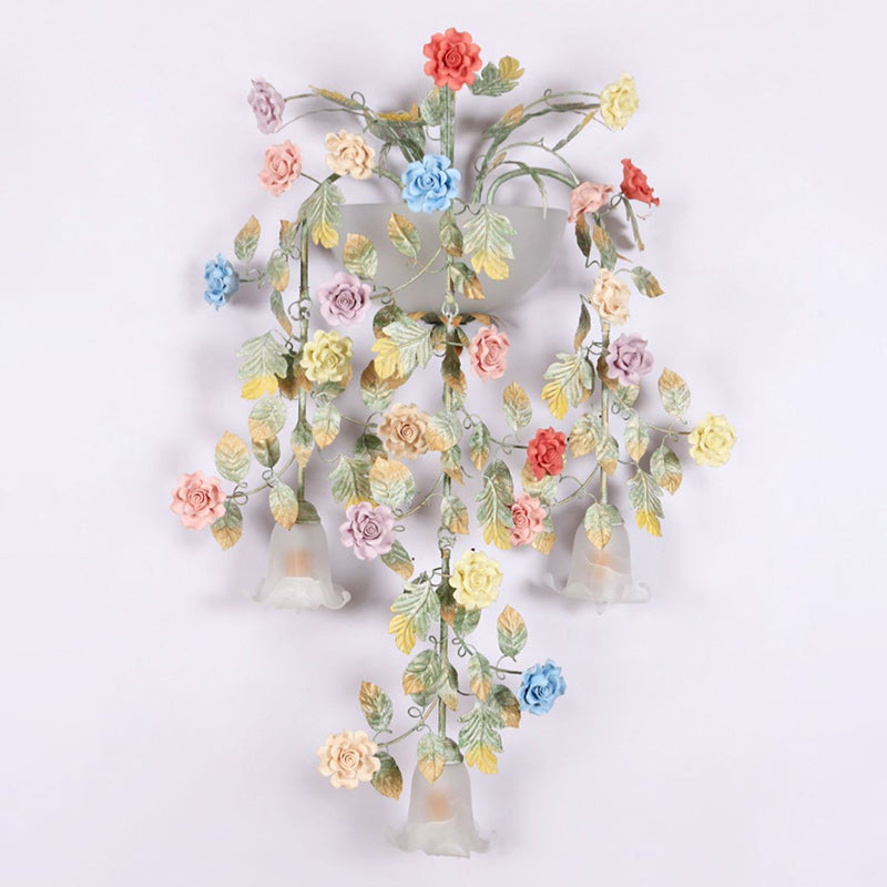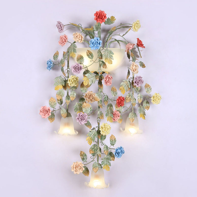 Bring rustic charm and artistic beauty to your space with this handcrafted farmhouse wall sconce lamp, featuring delicate ceramic roses, colorful floral accents in pink, blue, red, and white, and an elegant tree branch design. Made from durable iron, ceramic, and glass, this 5-light wall fixture is perfect for adding a decorative touch to living rooms or bedrooms.