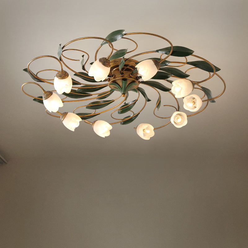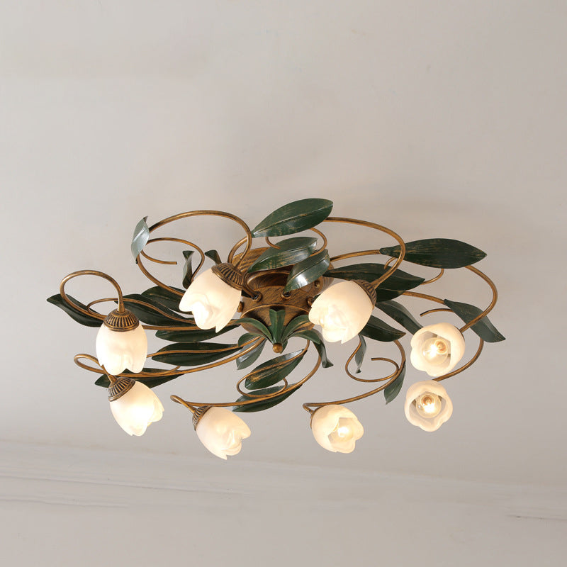 Traditional Farmhouse Iron Glass Floral Leaf 6/8/10 Light Semi-Flush Mount Ceiling Light For Living Room