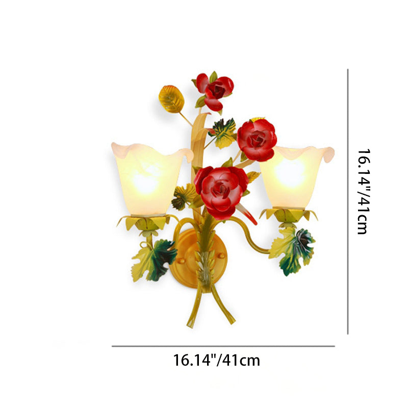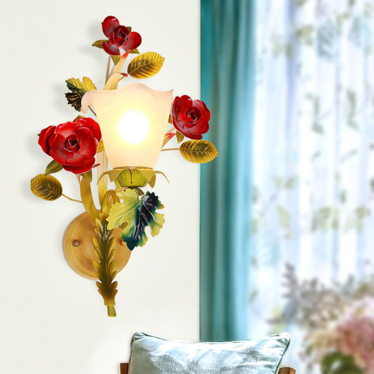 Traditional Farmhouse Iron Glass Rose Floral Bell 1/2 Light Wall Sconce Lamp For Hallway