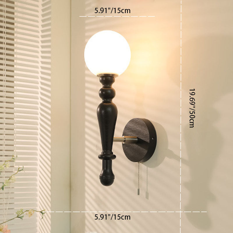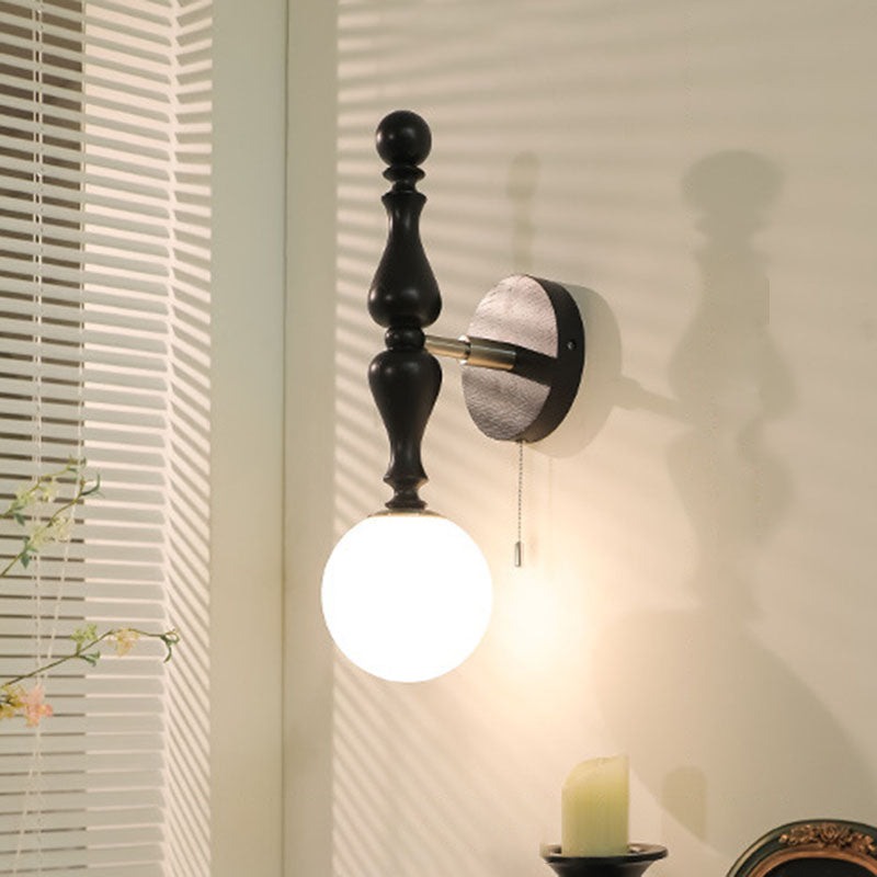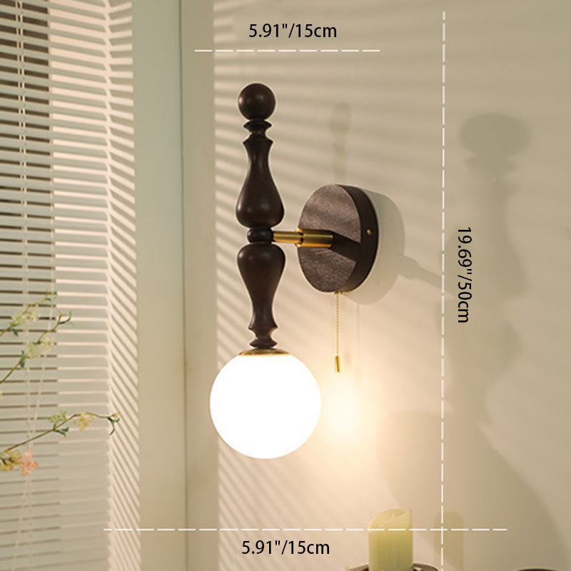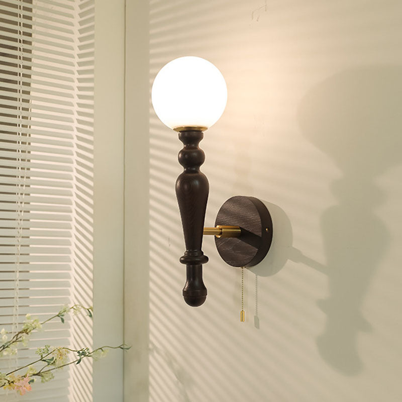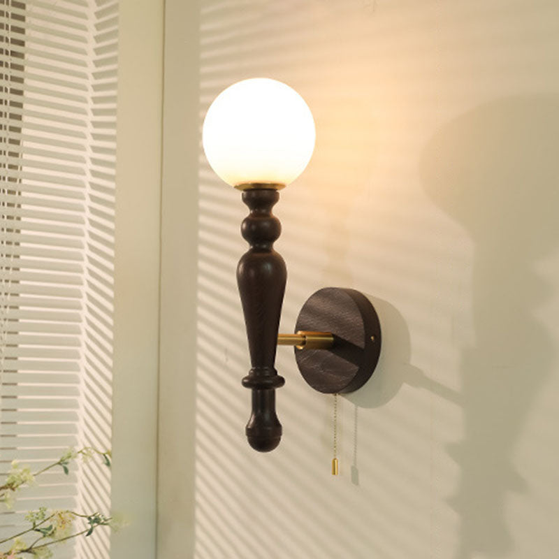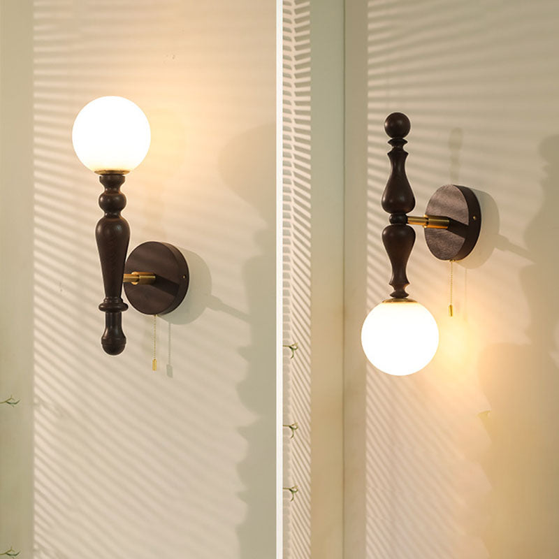 Traditional French Ash Wood Rod Glass Ball Shade 1-Light Wall Sconce Lamp For Bedroom