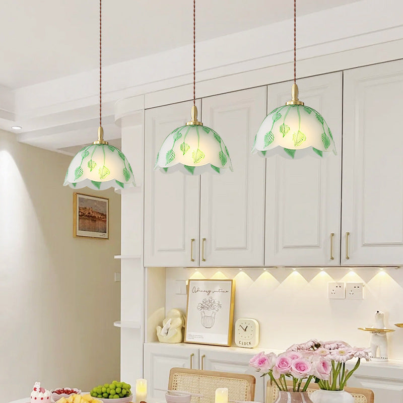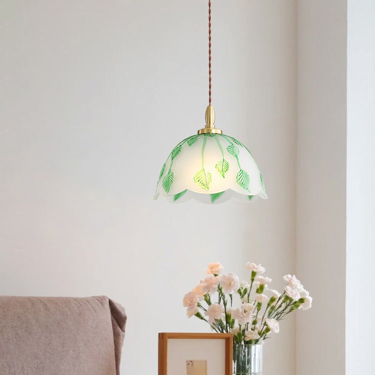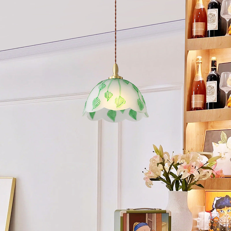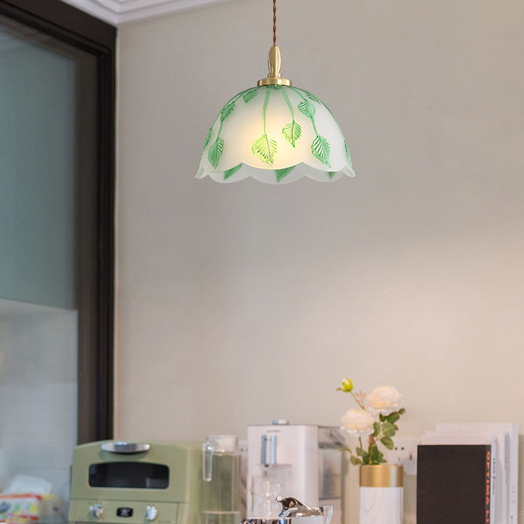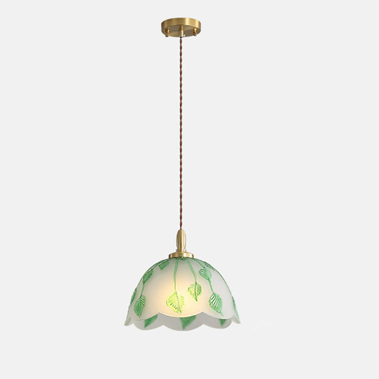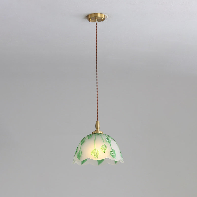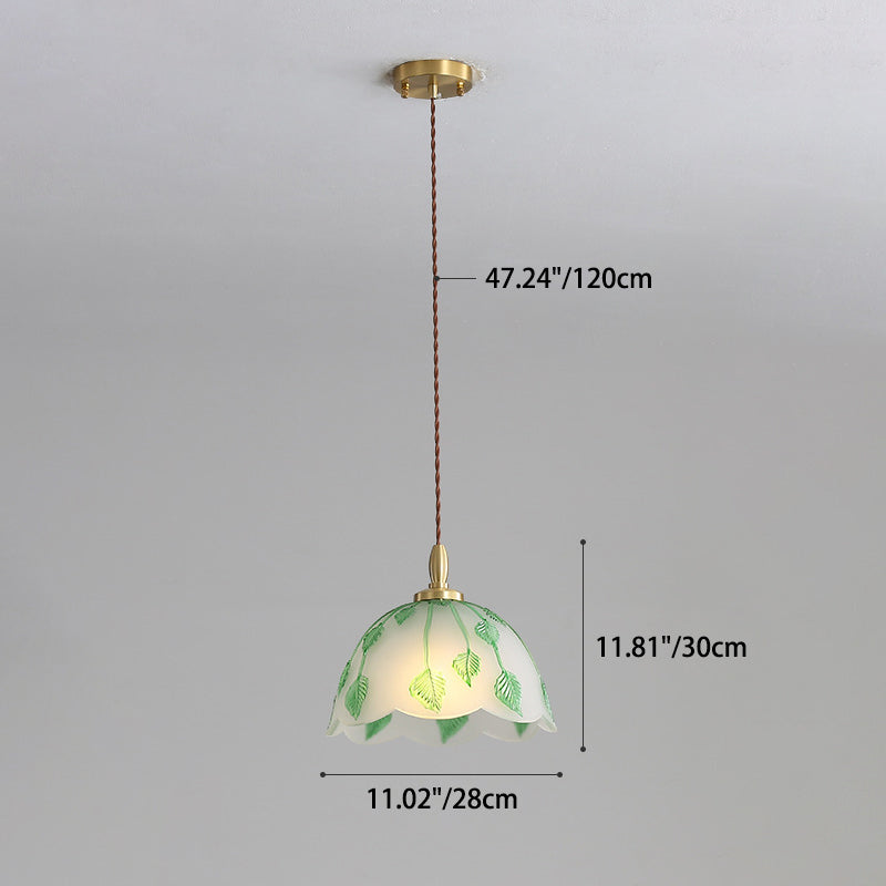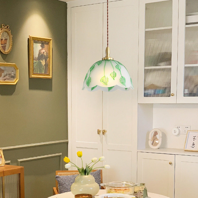 Traditional French Bowl Leaves Copper Glass 1-Light Pendant Light For Dining Room