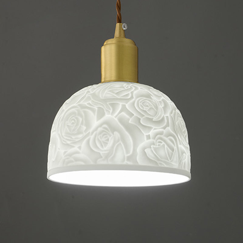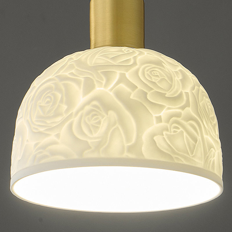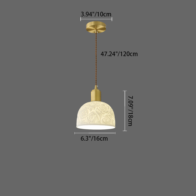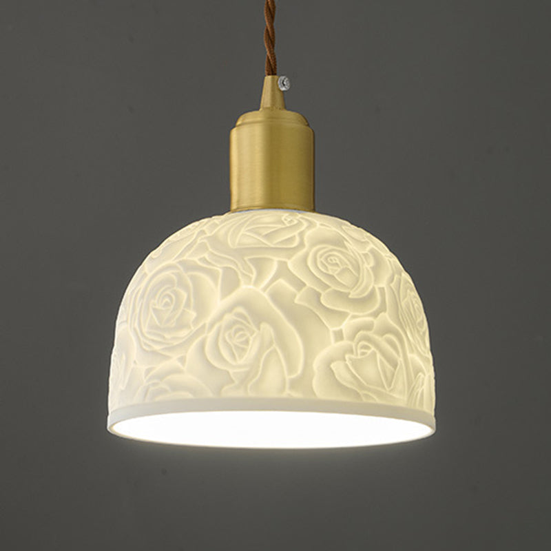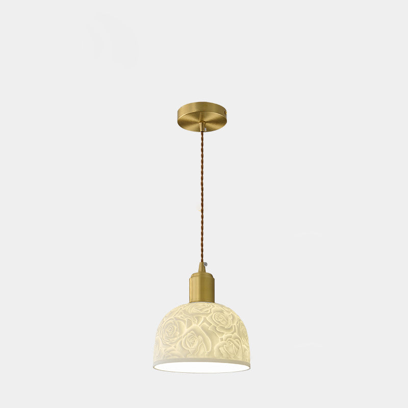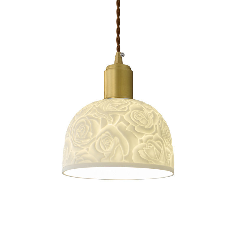 Traditional French Brass Ceramic Embossed Rose Dome 1-Light Pendant Light For Bedside