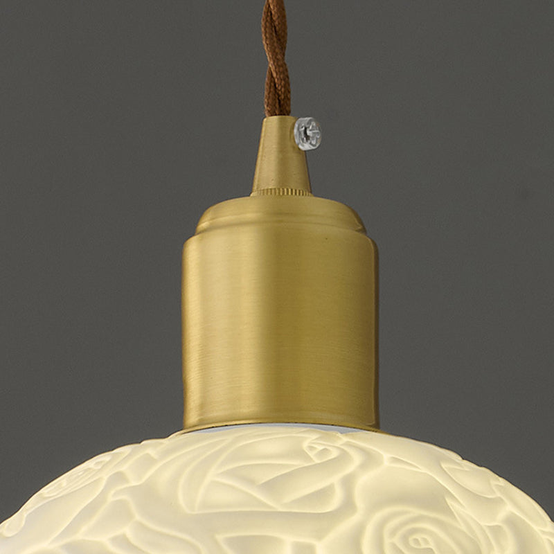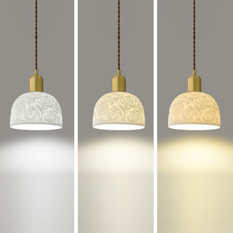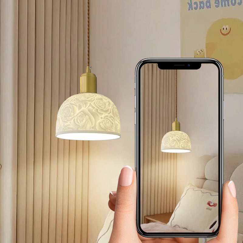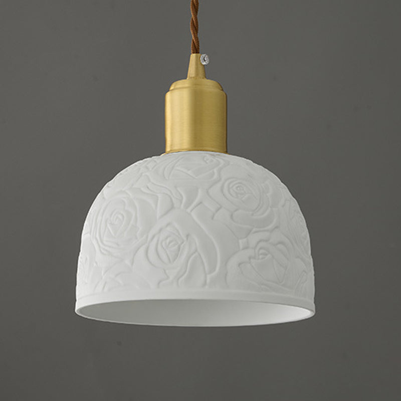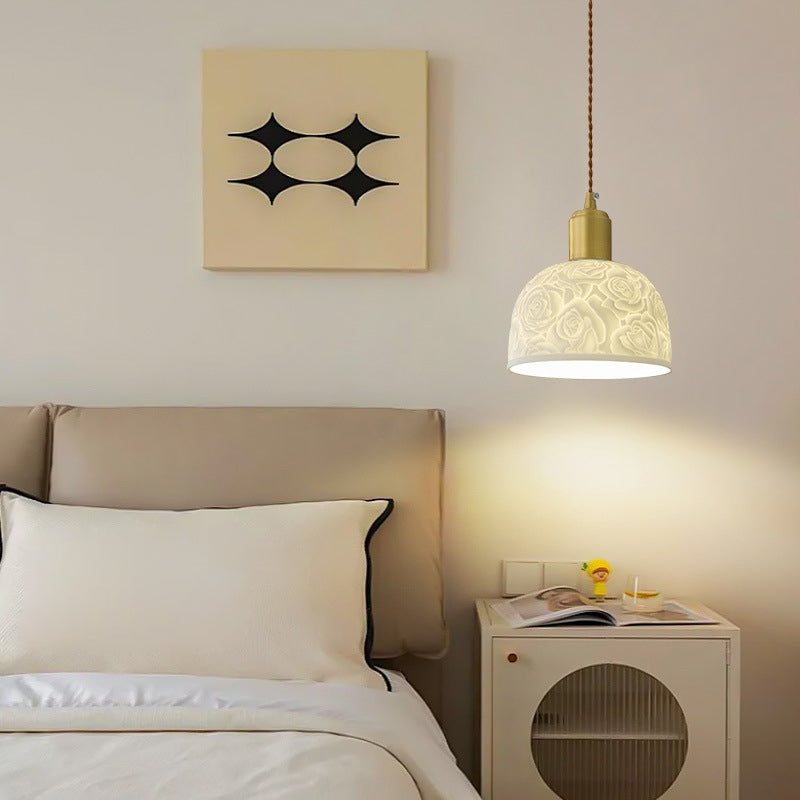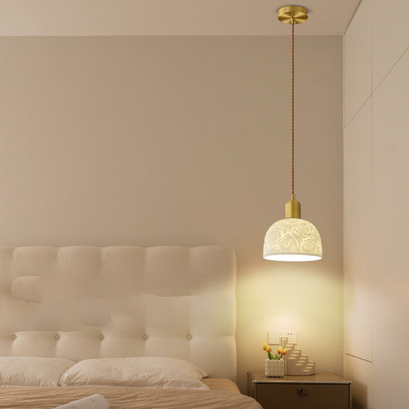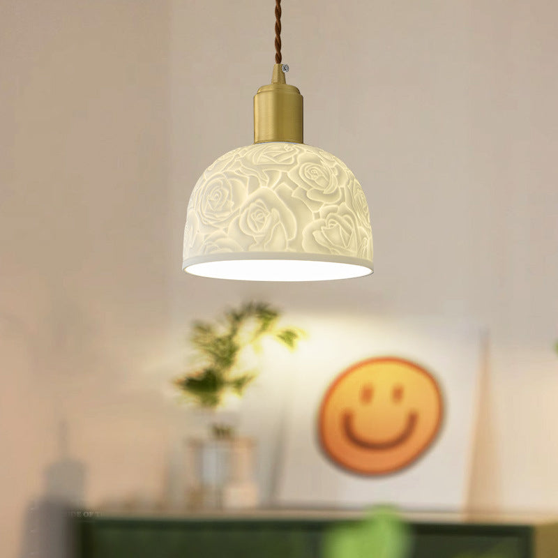 Traditional French Brass Ceramic Embossed Rose Dome 1-Light Pendant Light For Bedside
