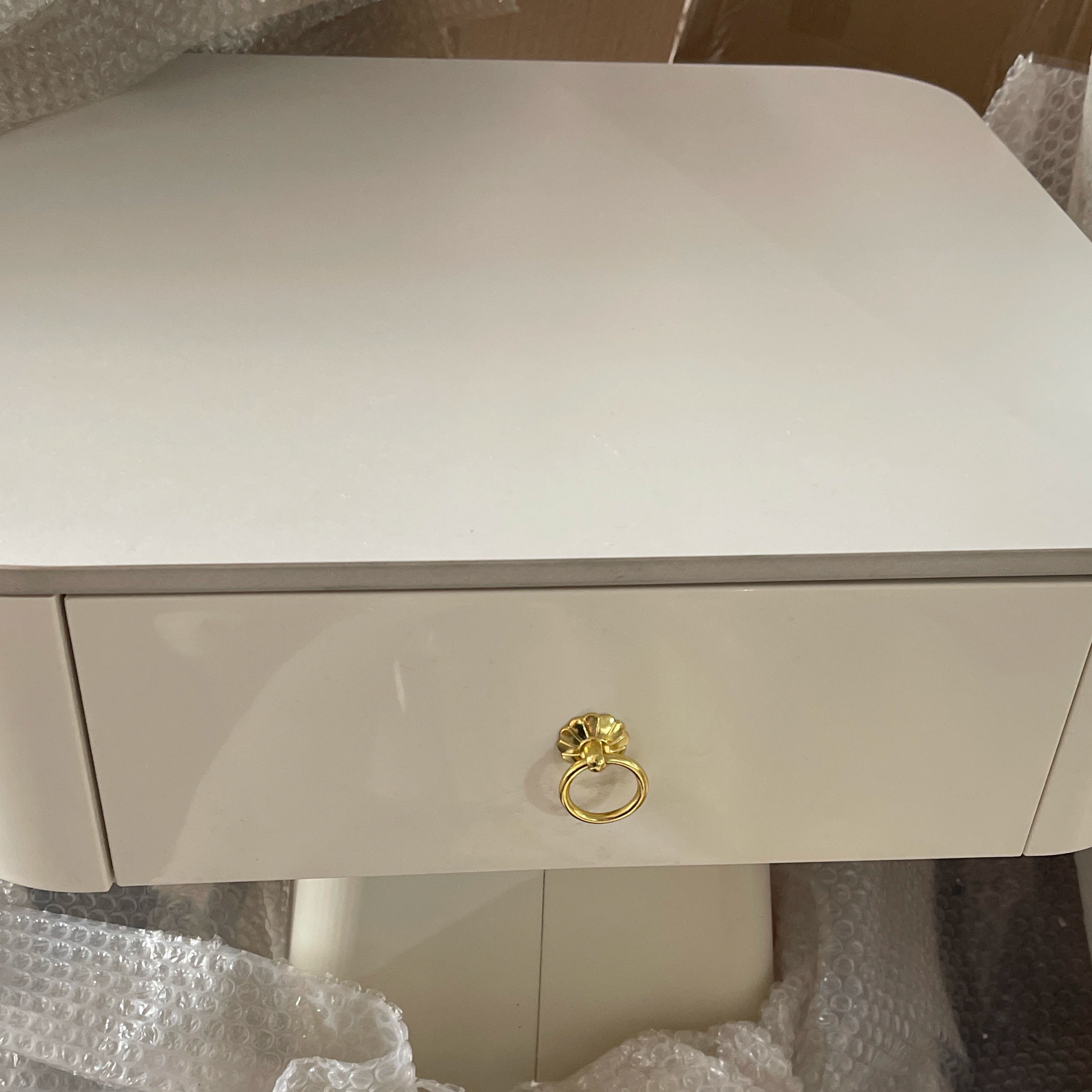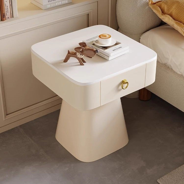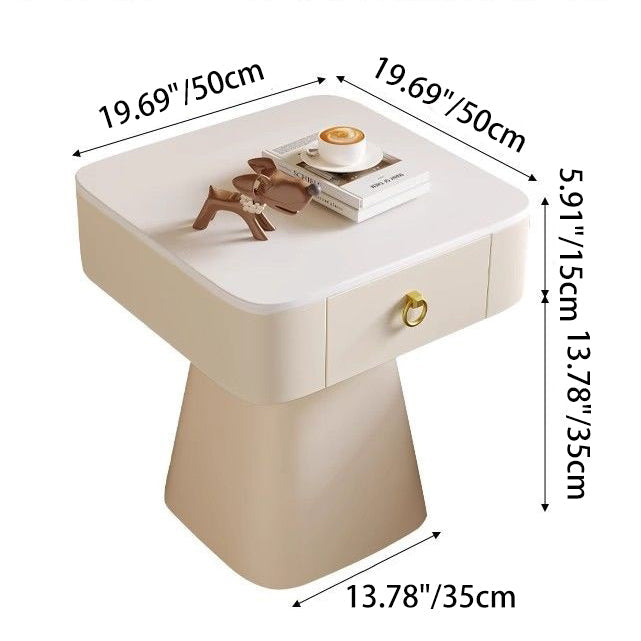 Elevate your bedroom or living room with this traditional French nightstand, featuring a carbon steel frame, a durable rock slab top, a square tabletop, and a unique pyramid-shaped base. Available in elegant beige, gold, and black finishes, with one drawer for practical storage.