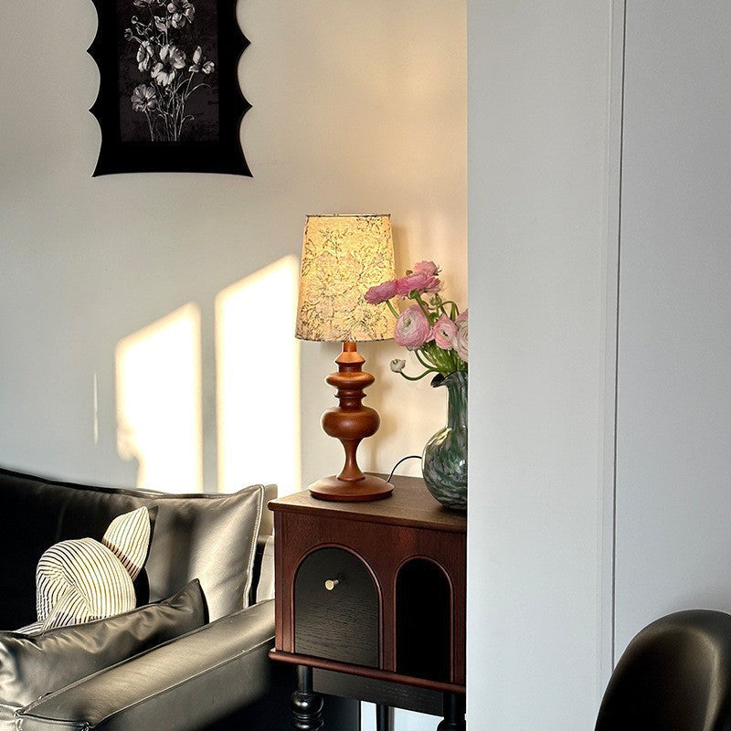 Traditional French Cylinder Floral Fabric Shade Solid Wood Base 1-Light Table Lamp For Bedroom