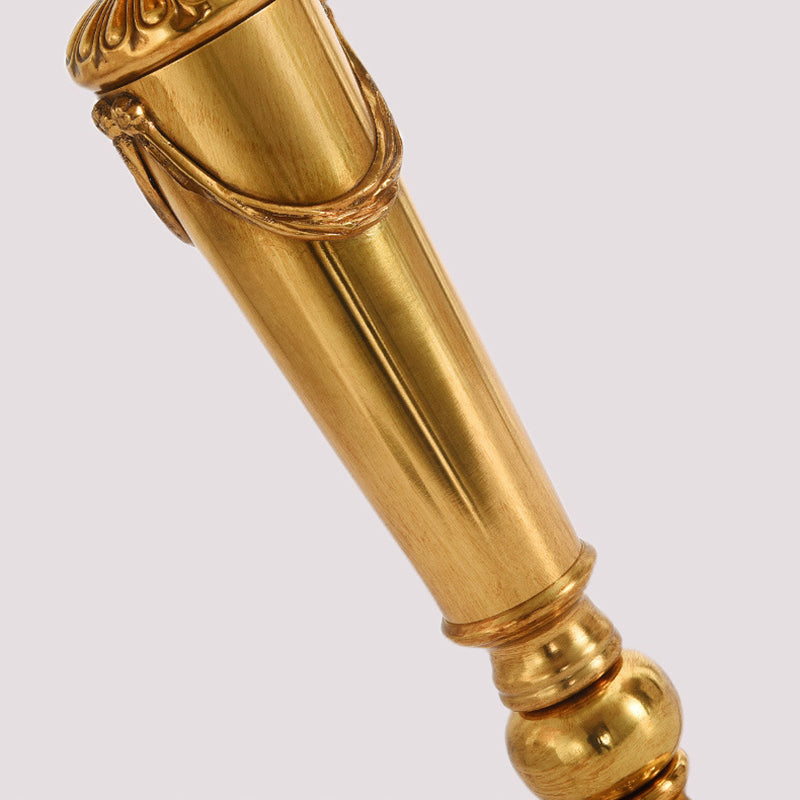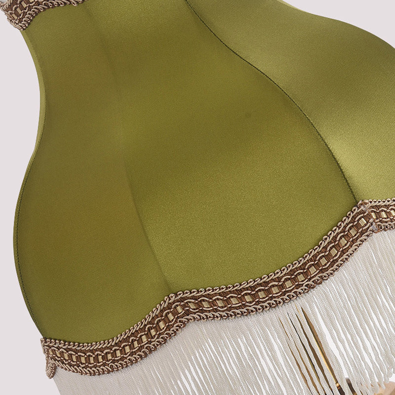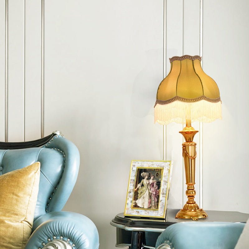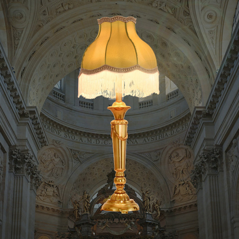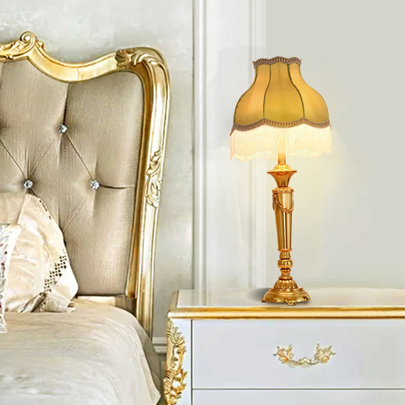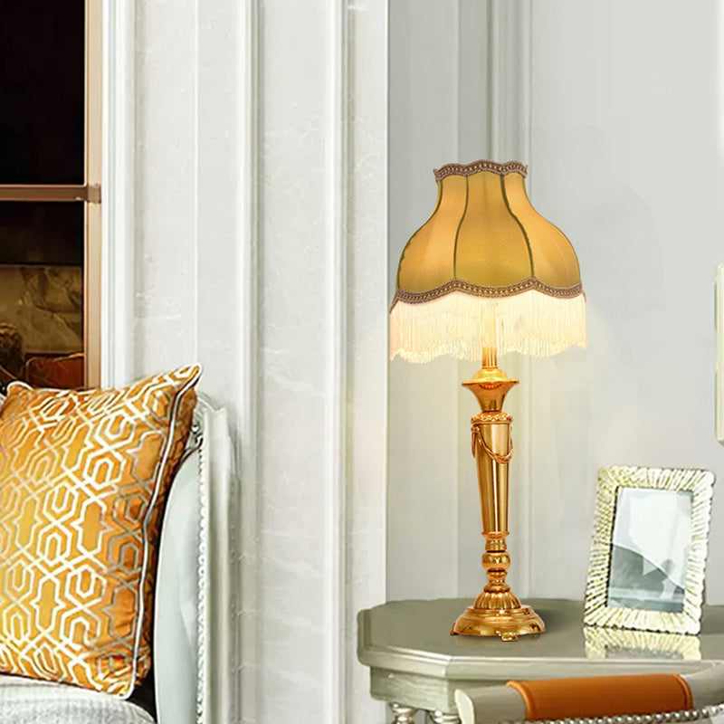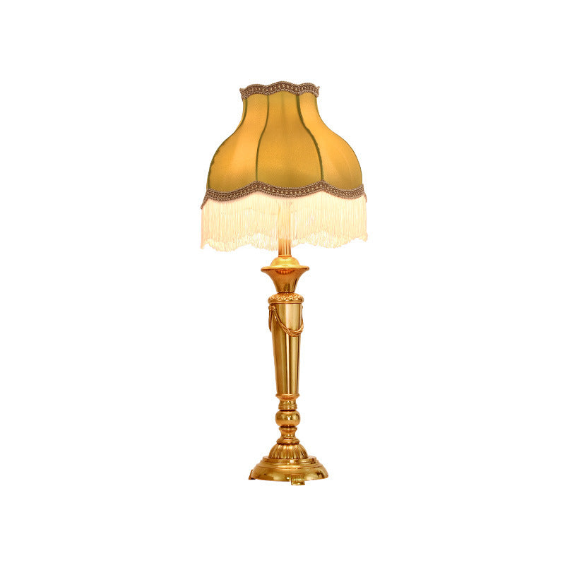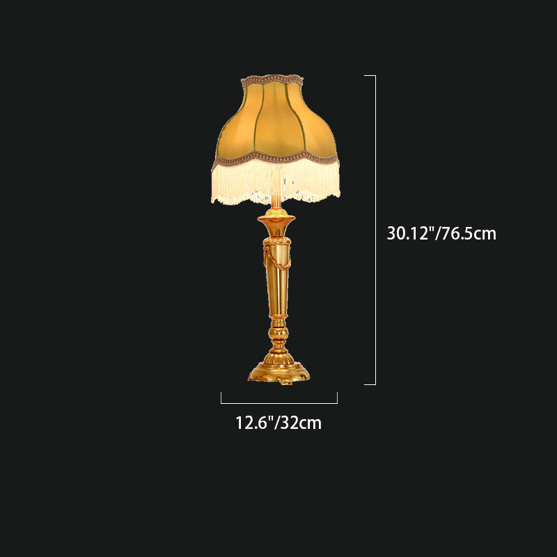 Traditional French Fringe Round Cylinder Fabric Brass 1-Light Table Lamp For Living Room