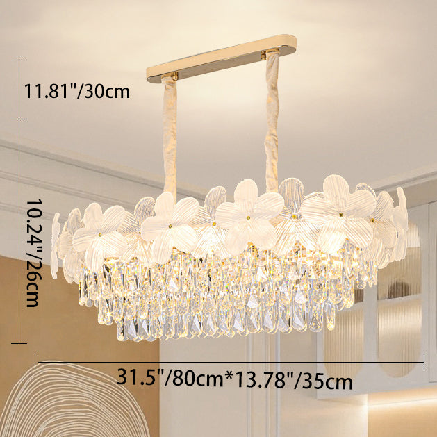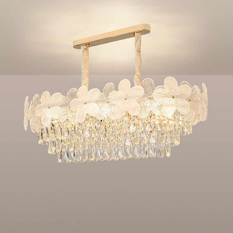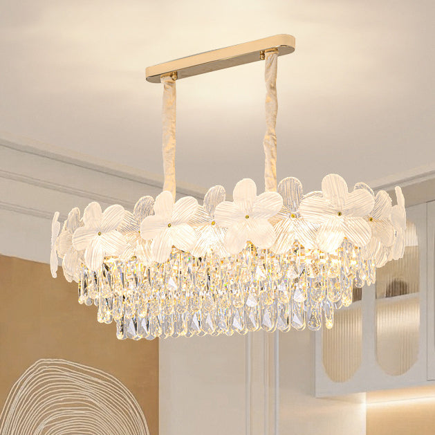 Elevate your dining space with this French-style chandelier featuring frosted floral glass shades, sparkling crystal accents, and an elegant oval silhouette. Made from iron, crystal, and glass in a luxurious gold and clear finish, this 10/12-light island light includes an adjustable chain for customizable hanging height. Perfect for adding a refined touch to any modern or classic dining room.