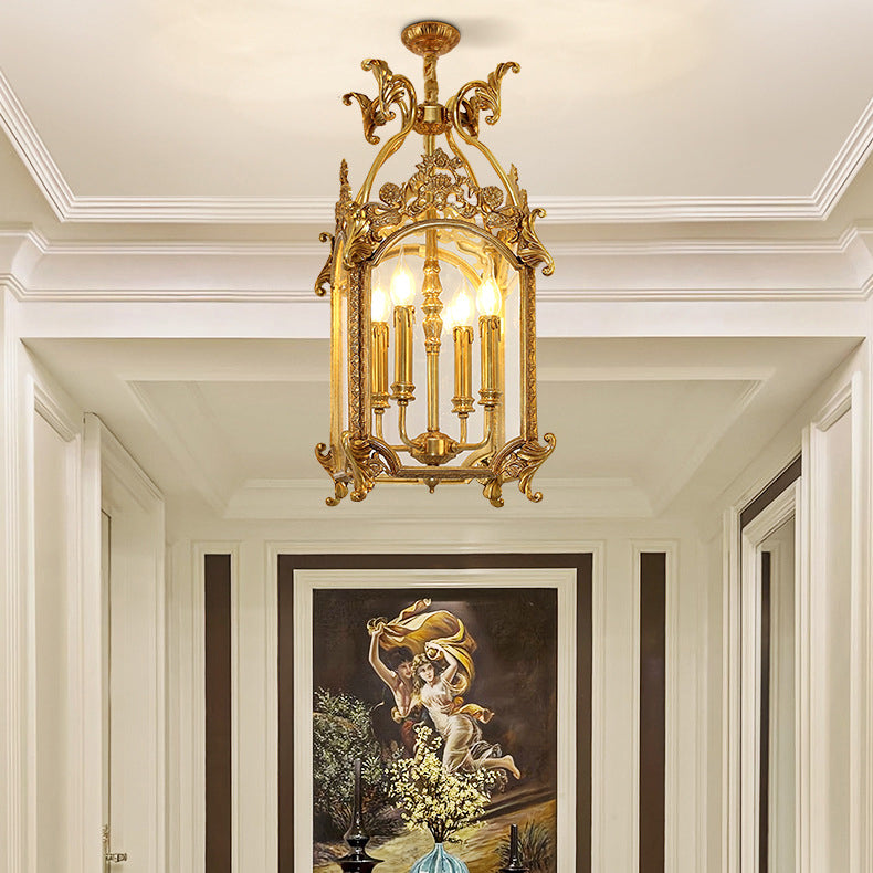 Traditional French Quadrilateral Carved Candle Holder Full Brass Frame 4-Light Pendant Light For Living Room