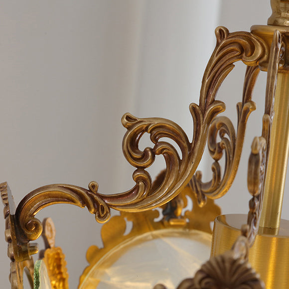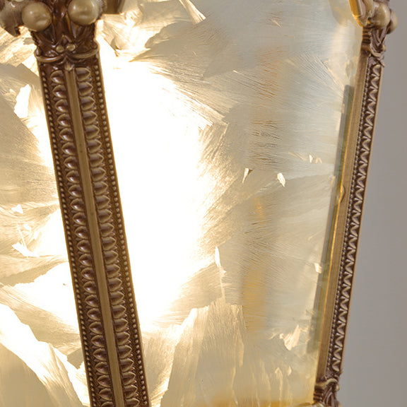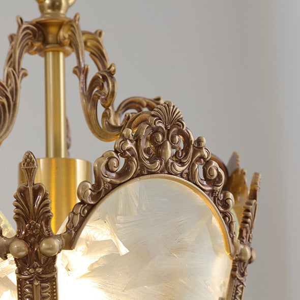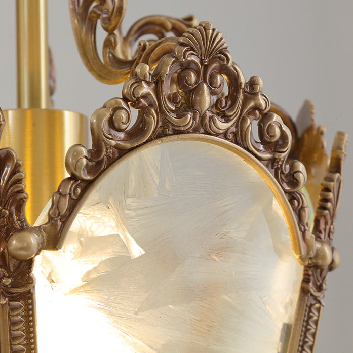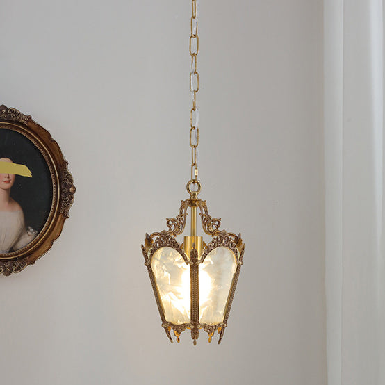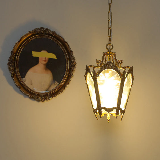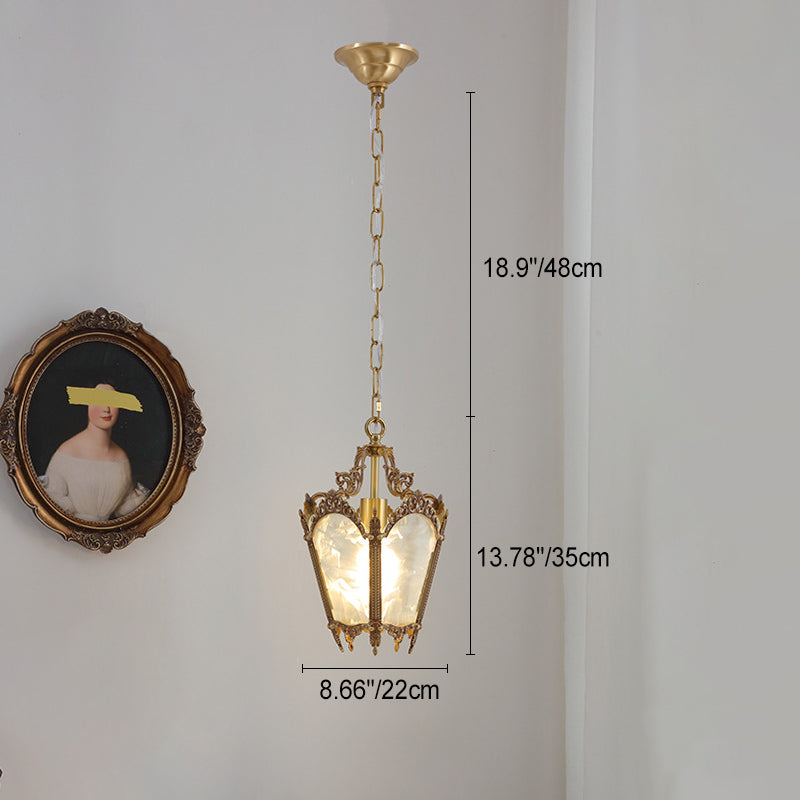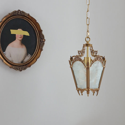 Traditional French Quadrilateral Lace Ice Glass Full Brass 1-Light Pendant Light For Living Room