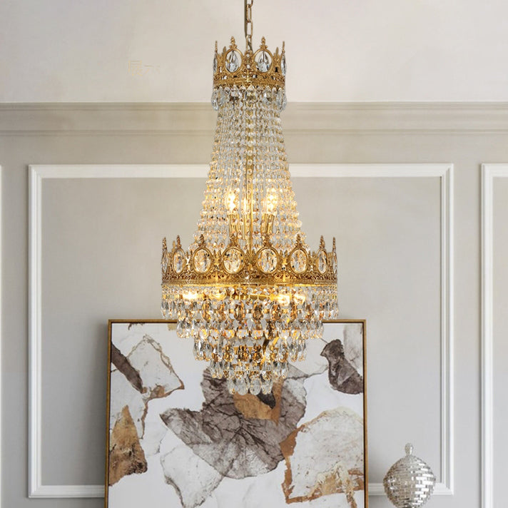 Traditional French Round Crown Shape Cut Diamond Crystal Copper Frame Candelabra 9-Light Chandelier For Living Room