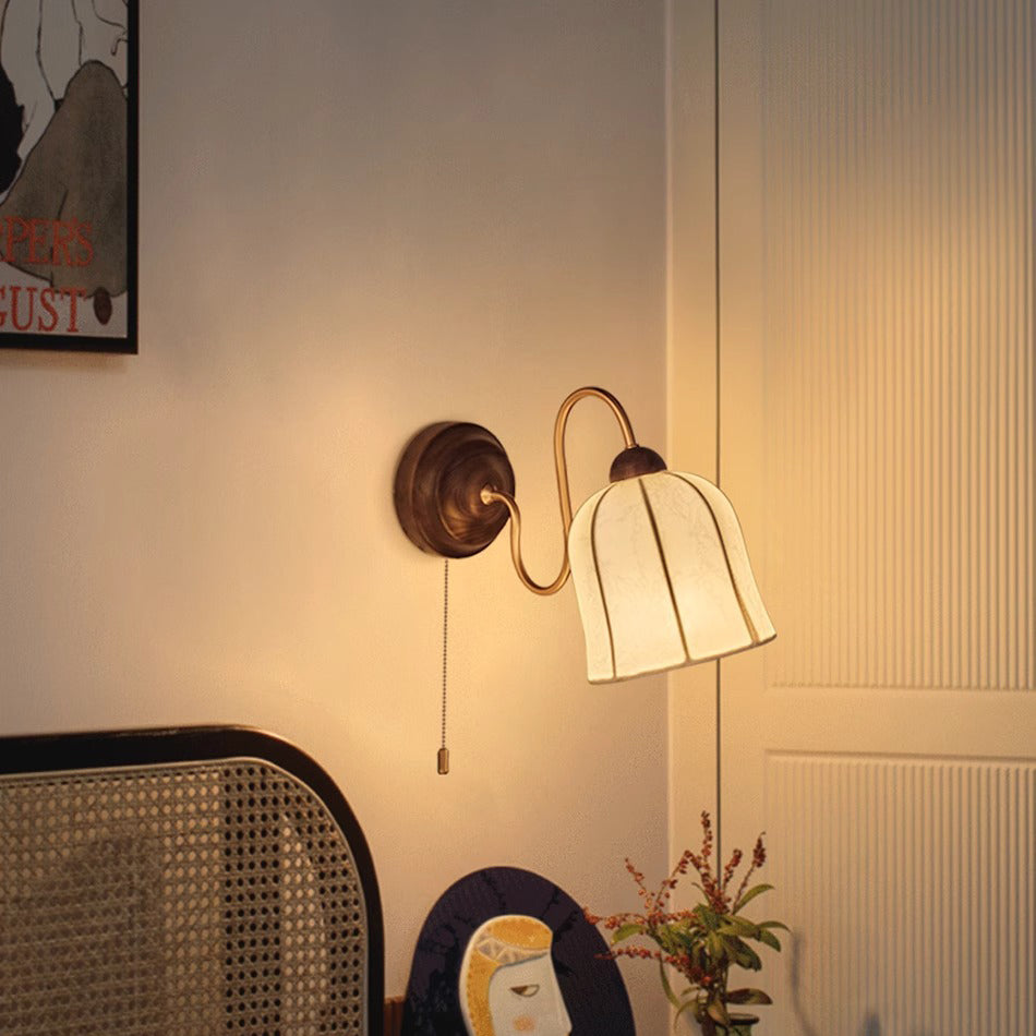 Traditional French Round Dome Cup Shape Wood Iron Fabric Shade 1-Light Wall Sconce Lamp For Living Room