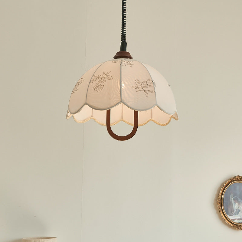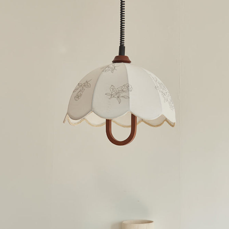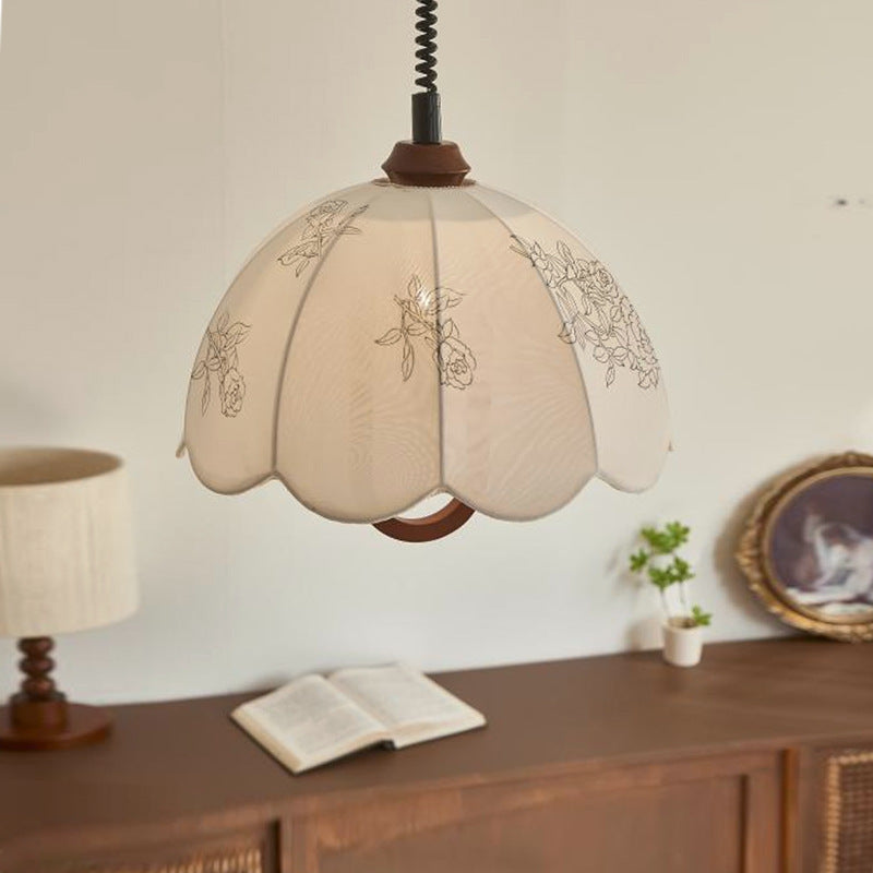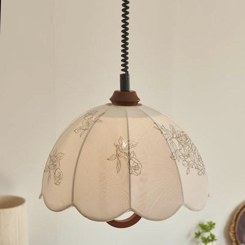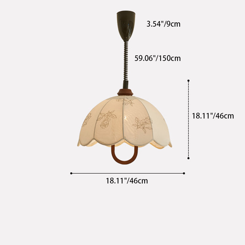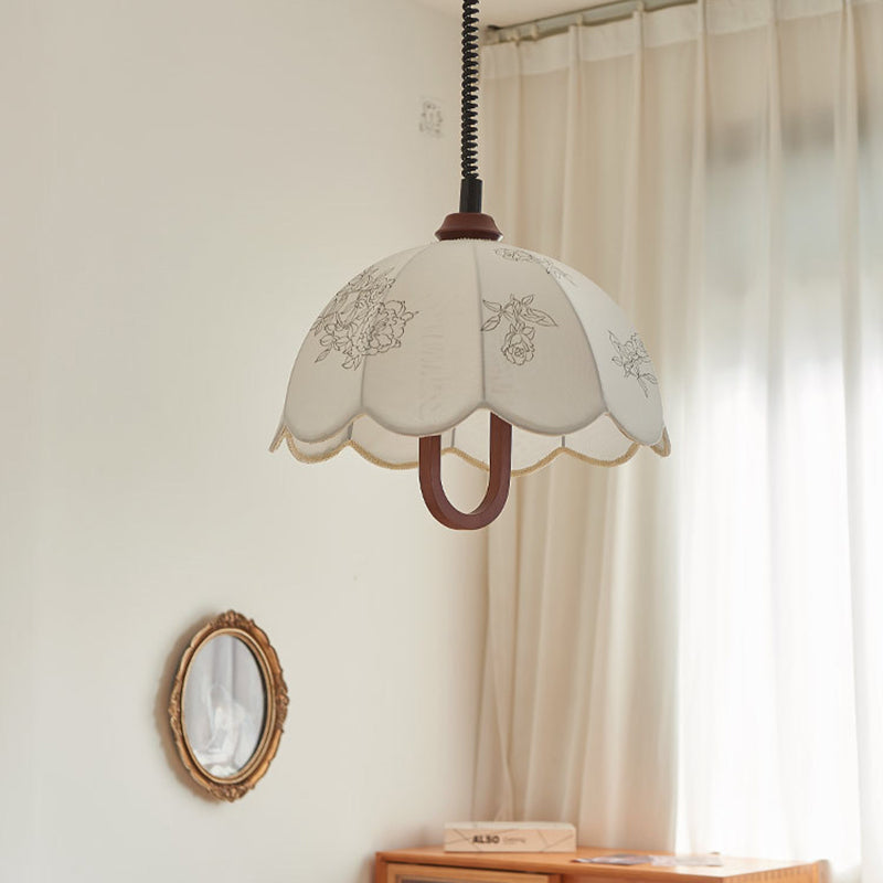 Traditional French Round Dome Floral Print Solid Wood Fabric 1-Light Pendant Light For Living Room