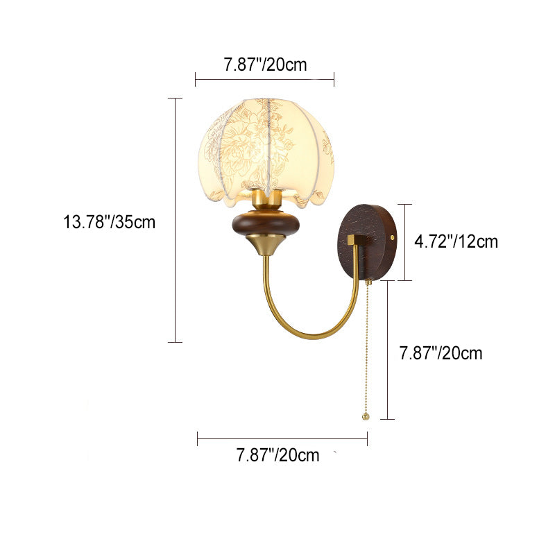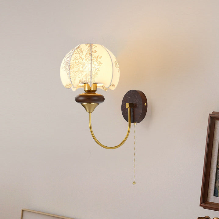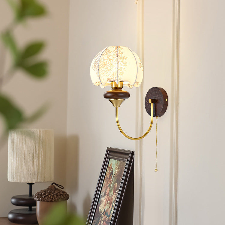 Traditional French Round Dome Floral Printed Fabric Shade Iron Wood Frame 1-Light Wall Sconce Lamp For Living Room