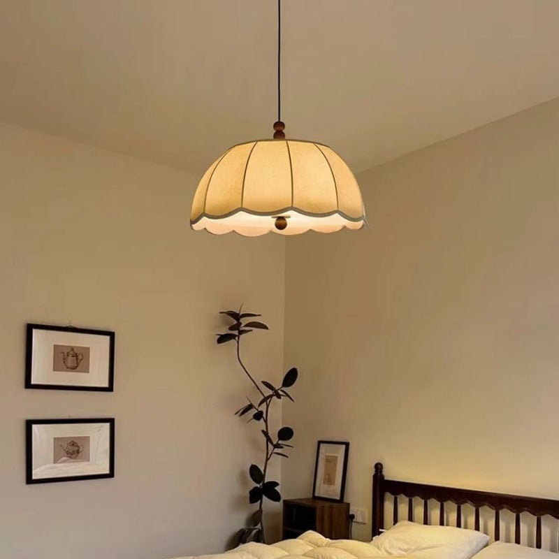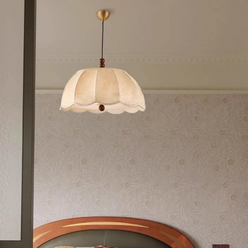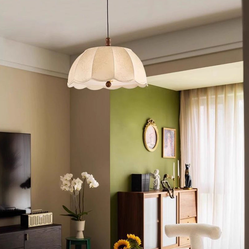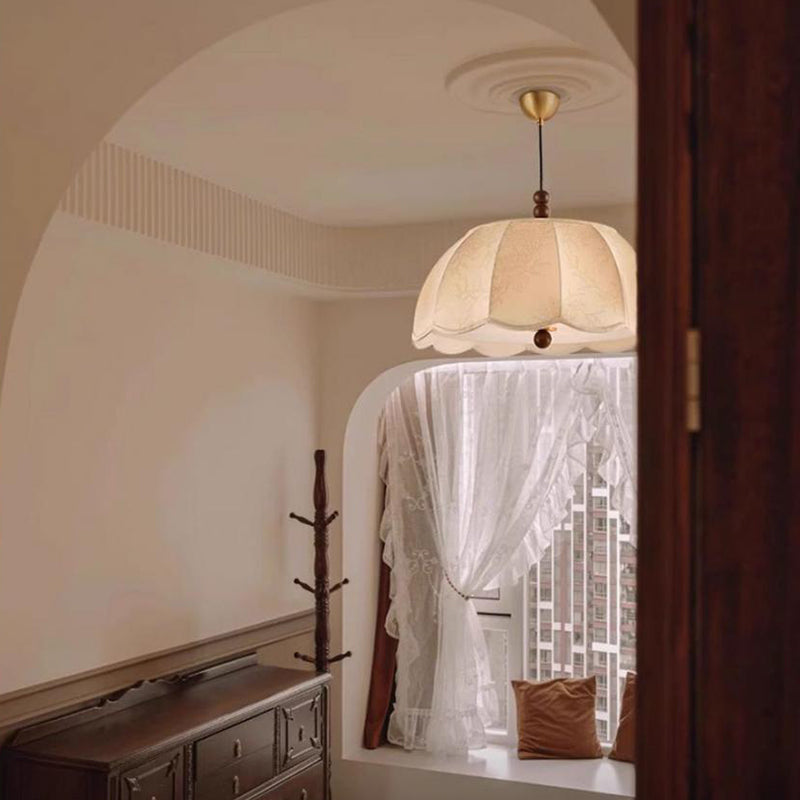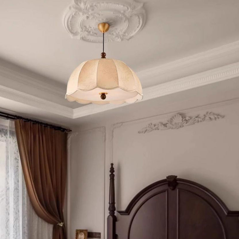 Traditional French Round Floral Print Fabric Shade Wood Brass 4-Light Pendant Light For Living Room