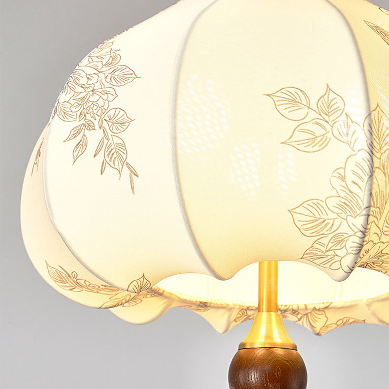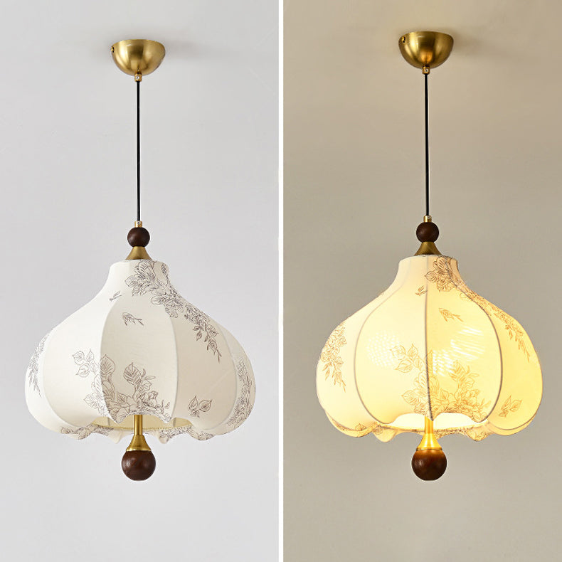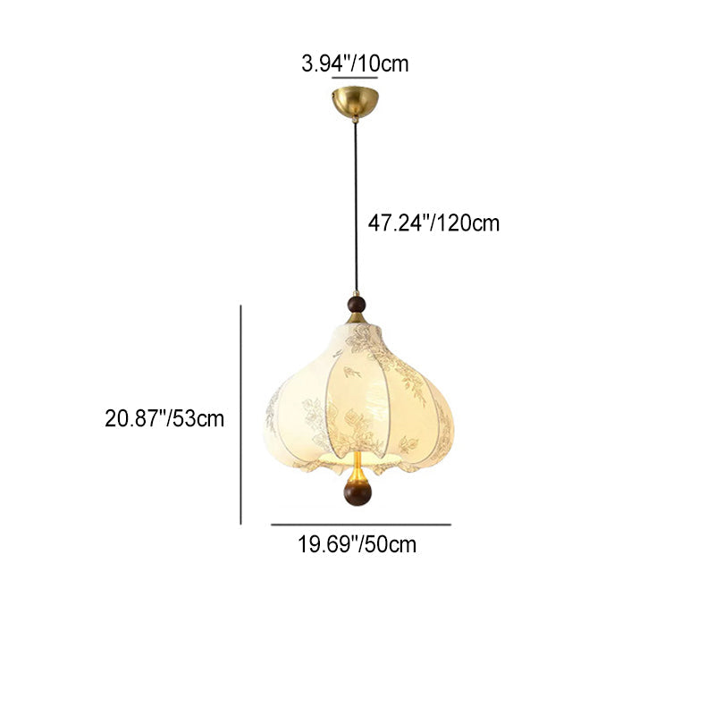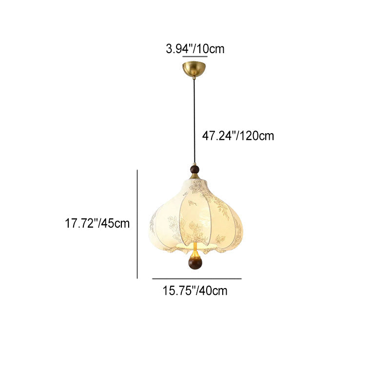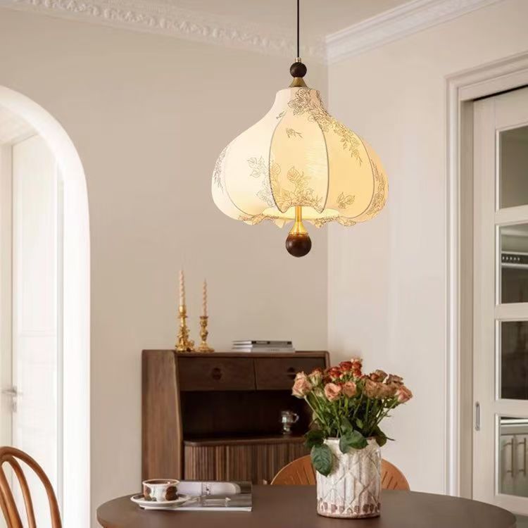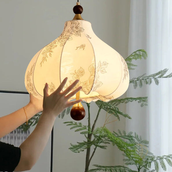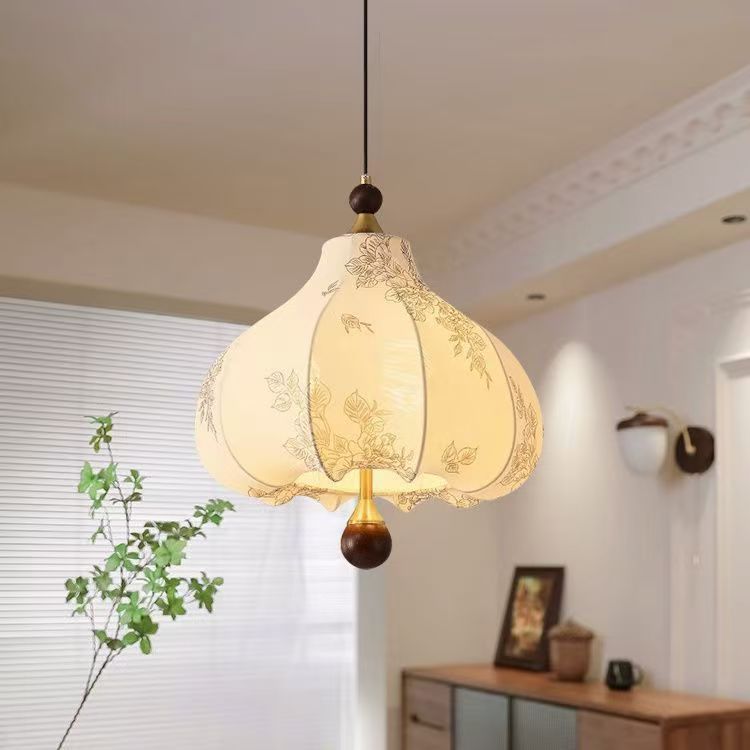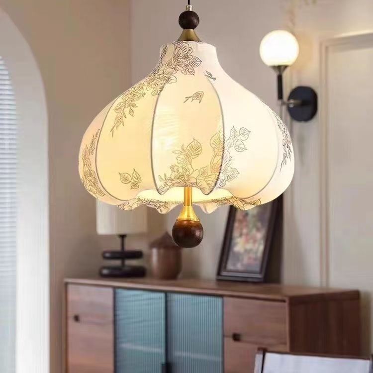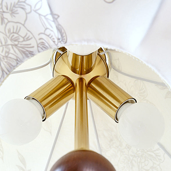 Traditional French Round Trapezoidal Flower Patterned Wood Fabric Metal 3/5 Light Pendant Light For Living Room