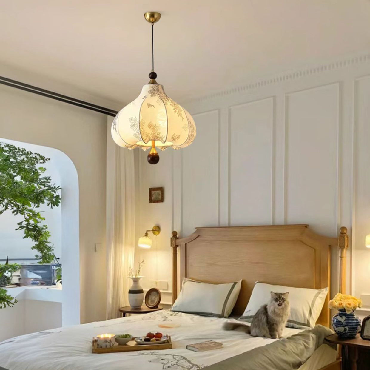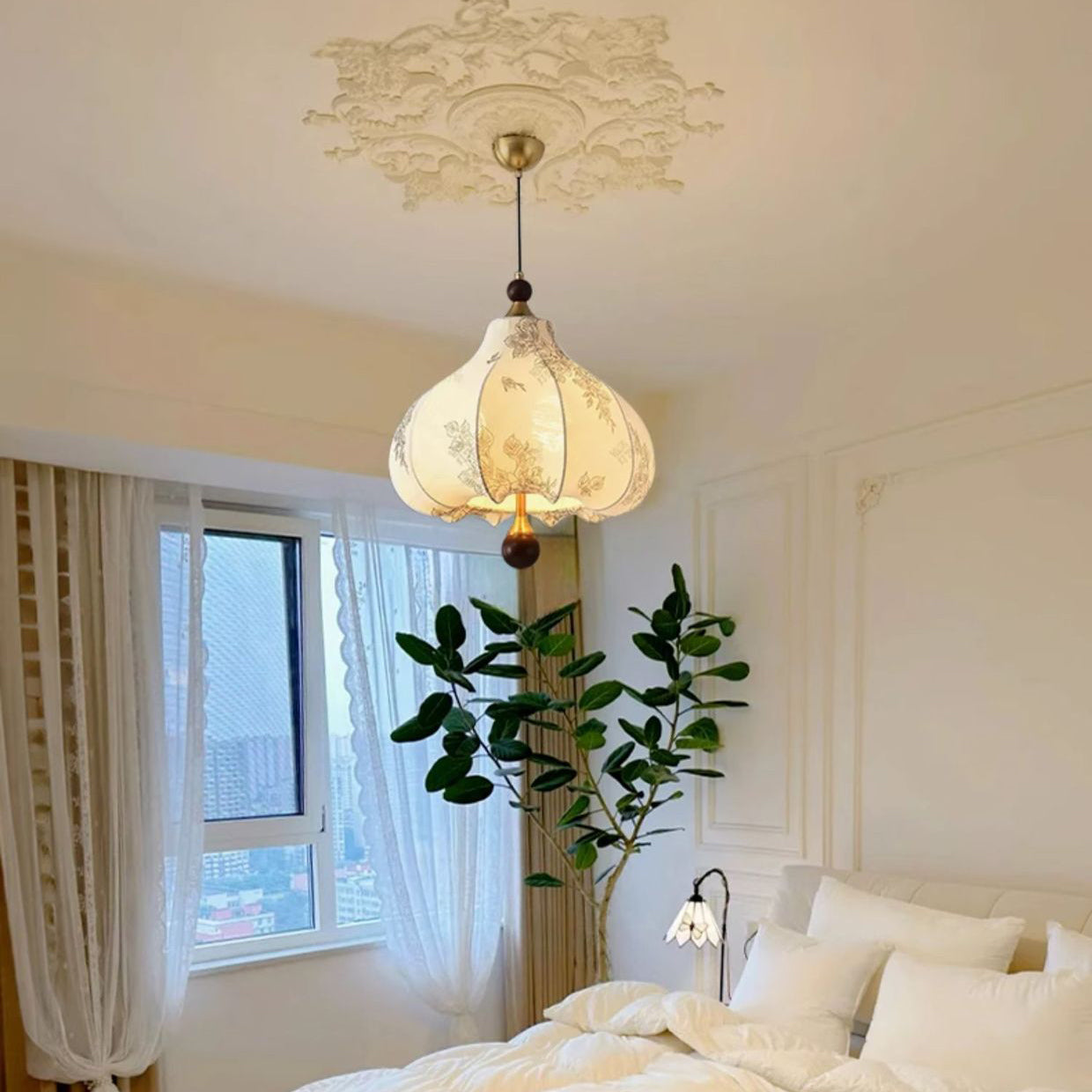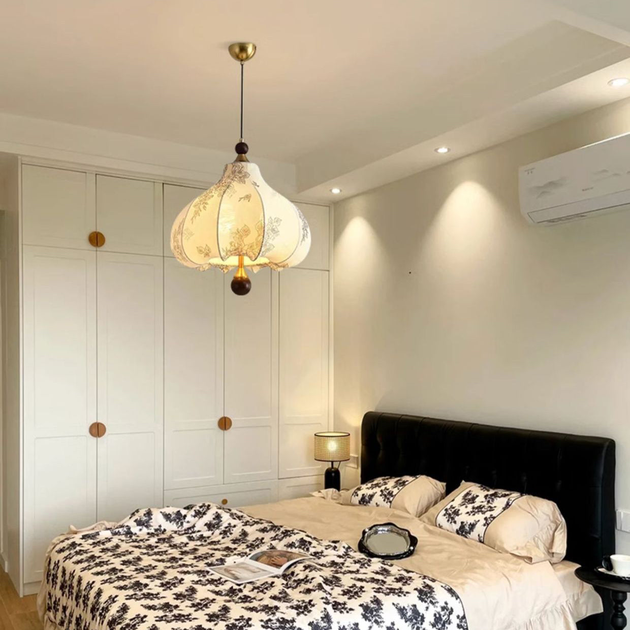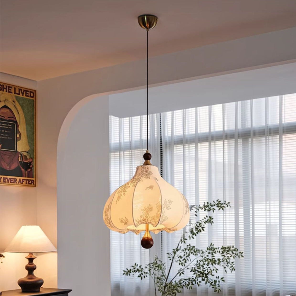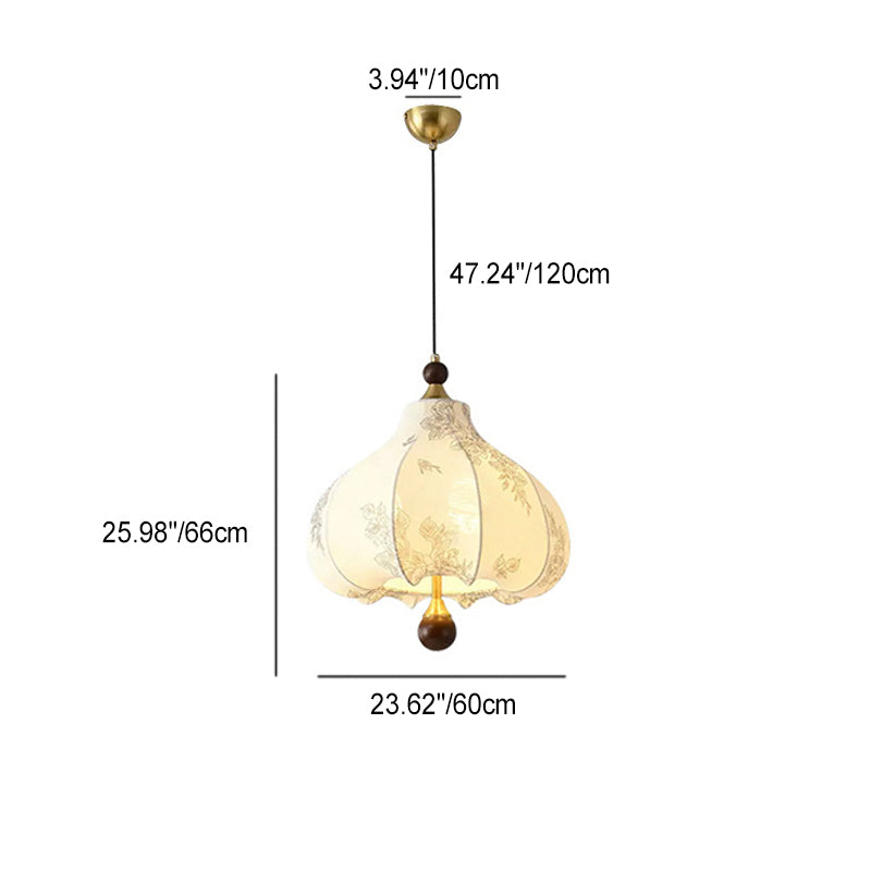 Traditional French Round Trapezoidal Flower Patterned Wood Fabric Metal 3/5 Light Pendant Light For Living Room