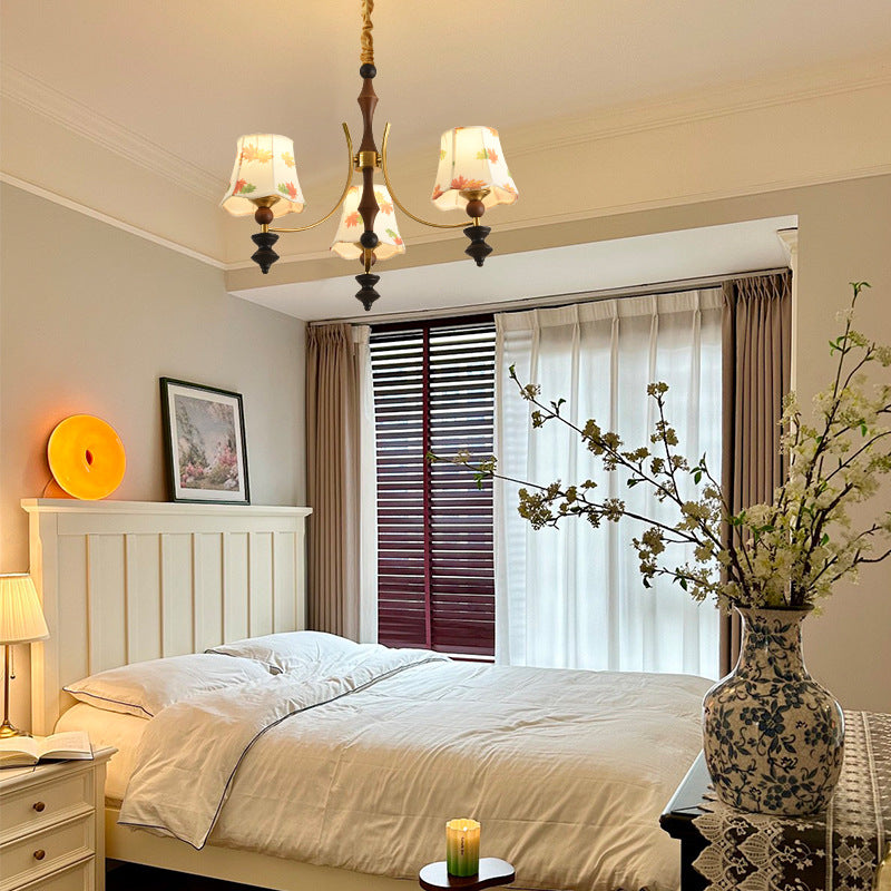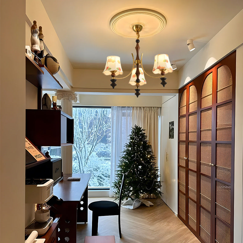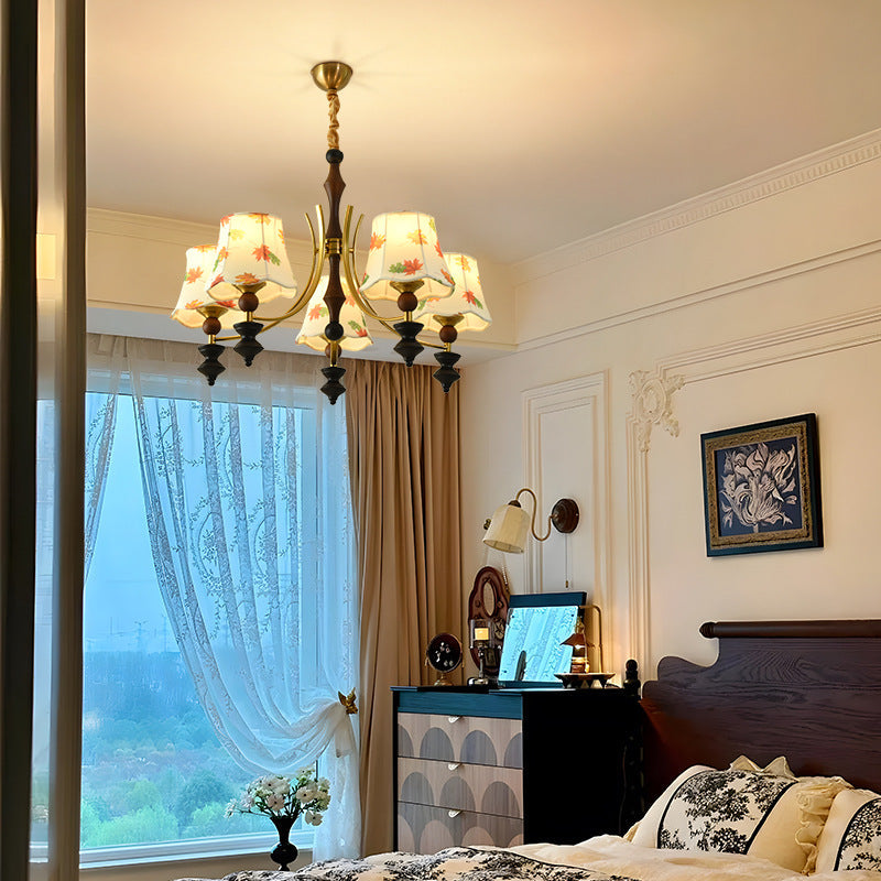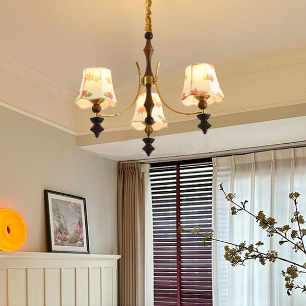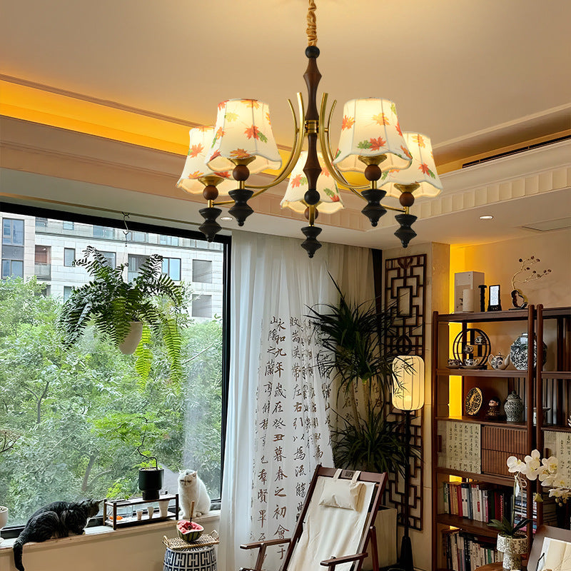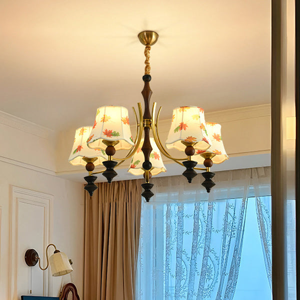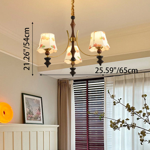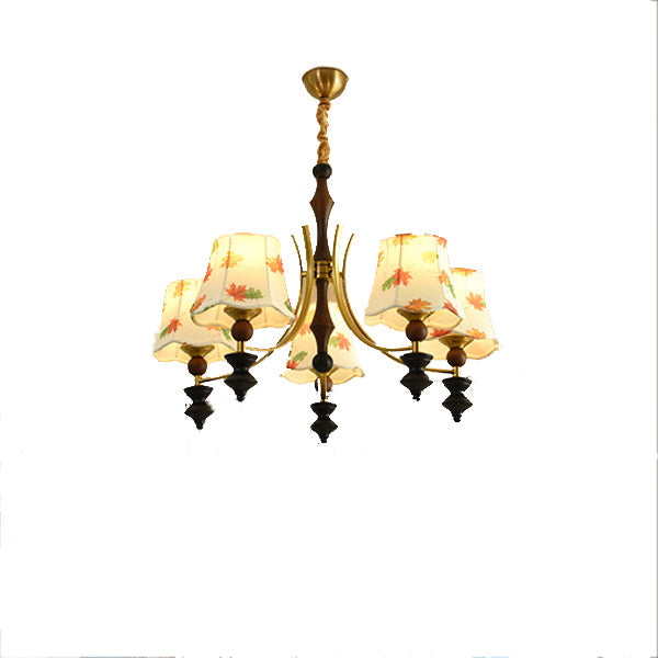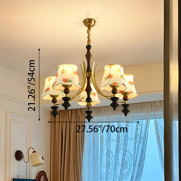 Traditional French Wood Iron Arc Frame Maple Leaves Fabric Shade 3/5-Light Chandelier For Living Room