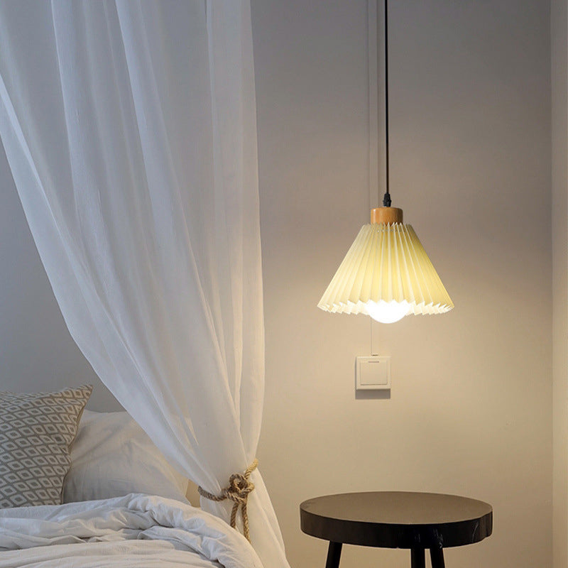 Traditional Japanese Cone Wood Fabric 1-Light Pendant Light For Living Room