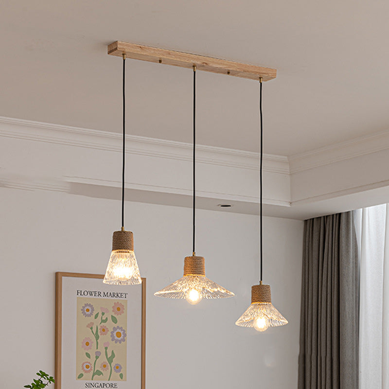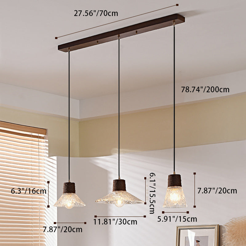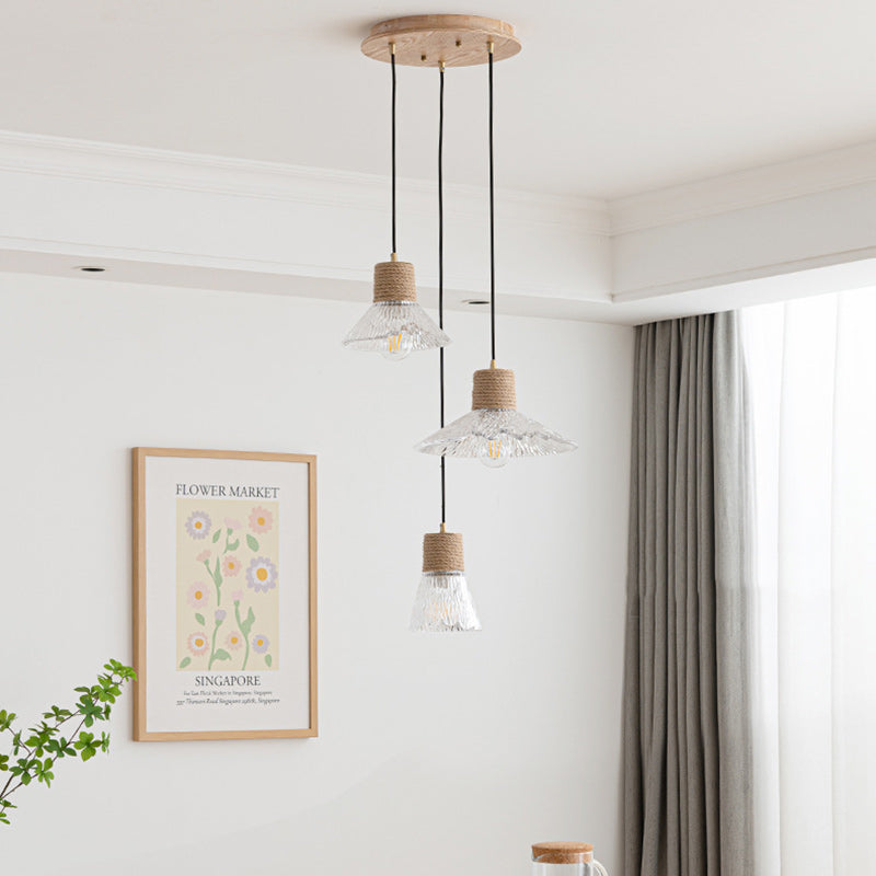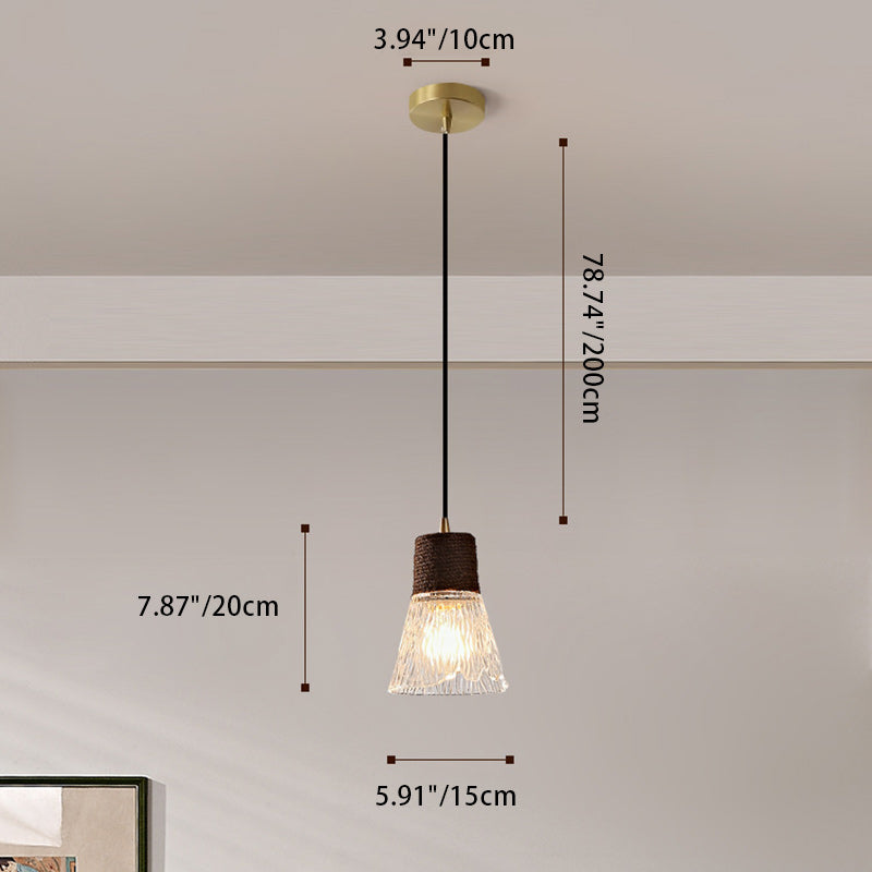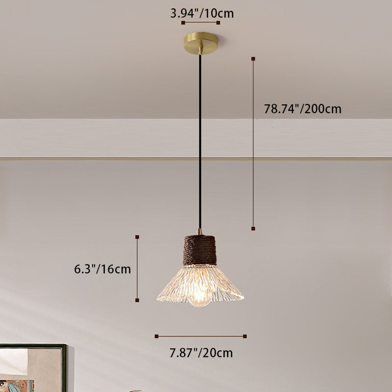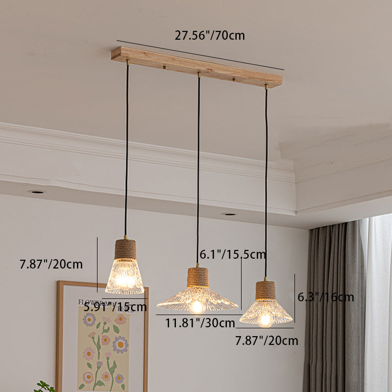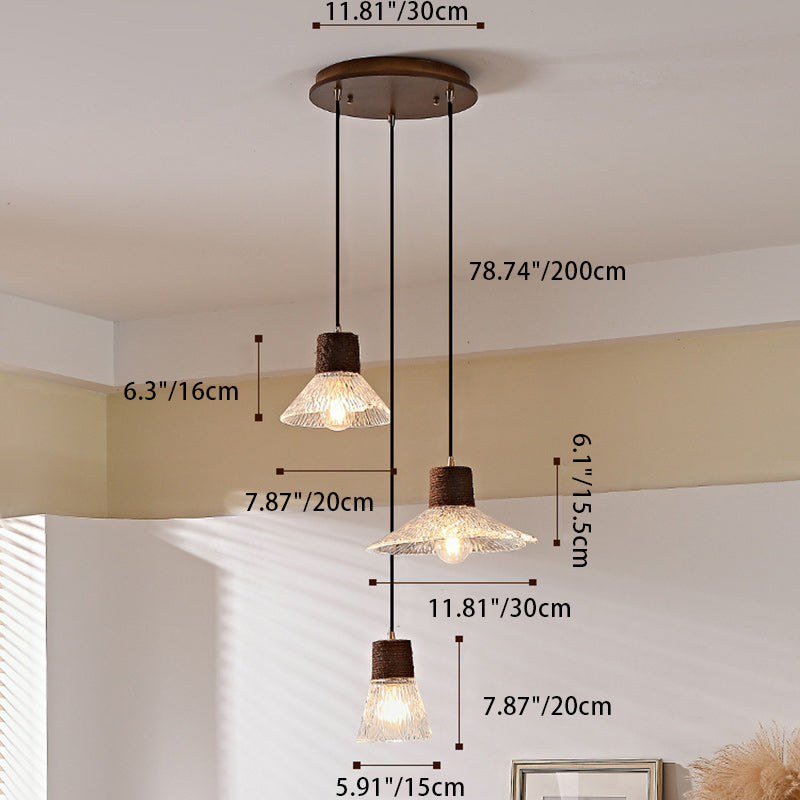 Traditional Japanese Copper Wood Glass Hemp Rope Conic Ripple 1/3 Light Pendant Light For Dining Room