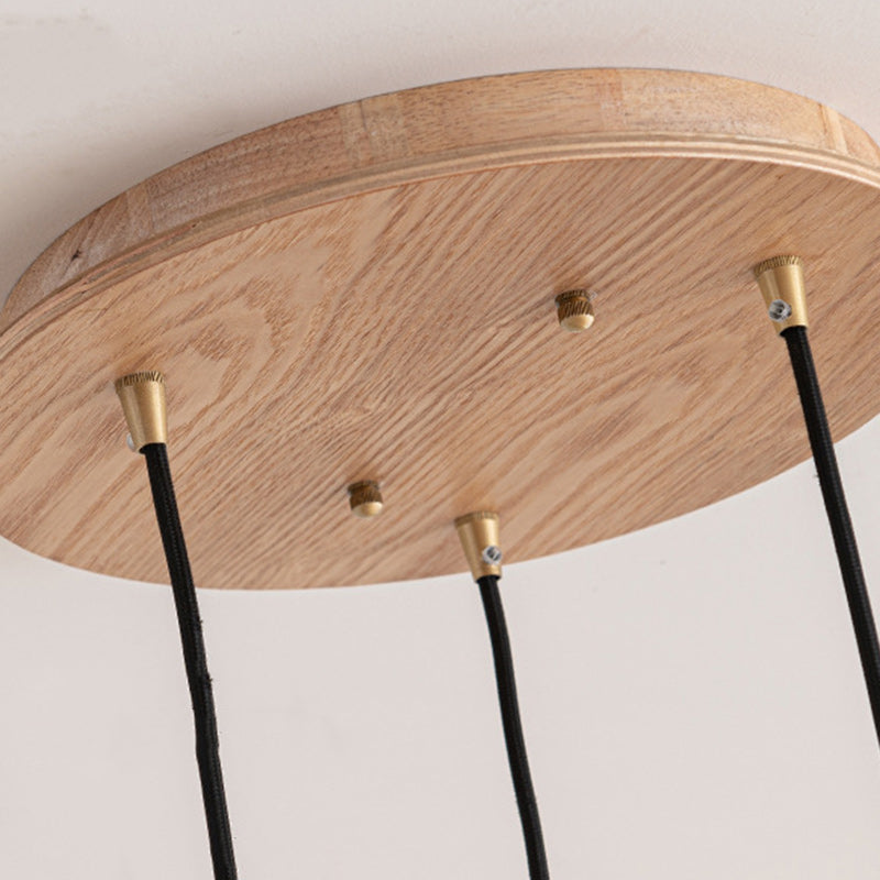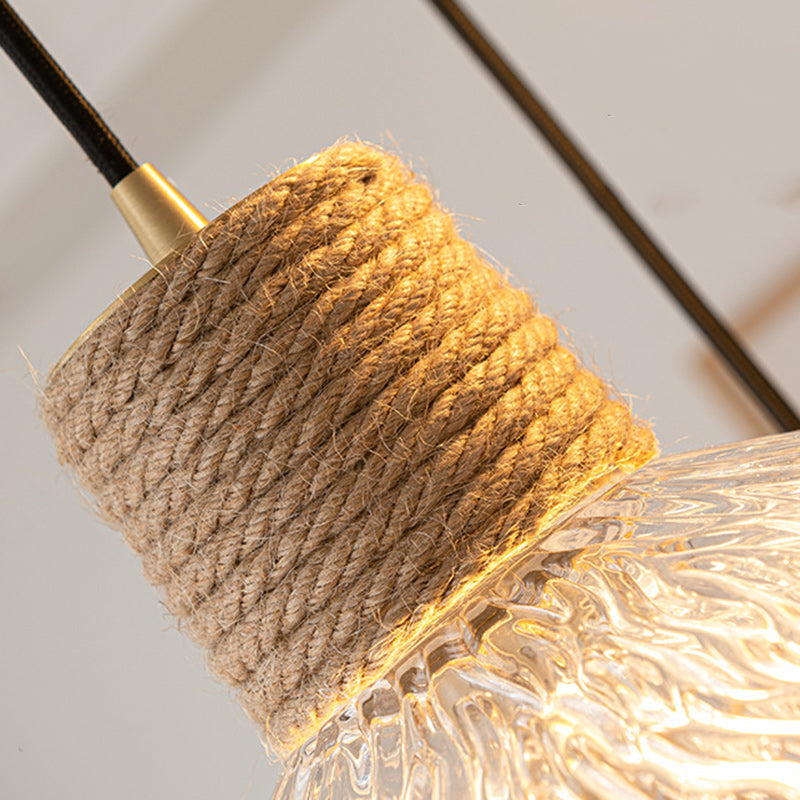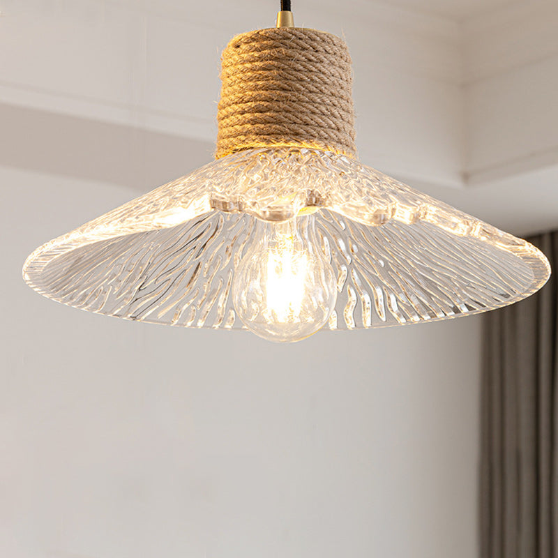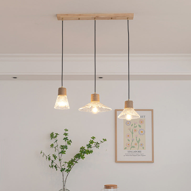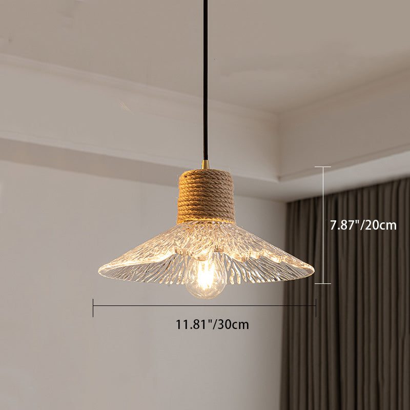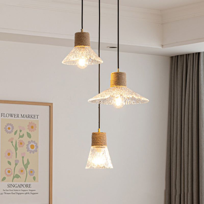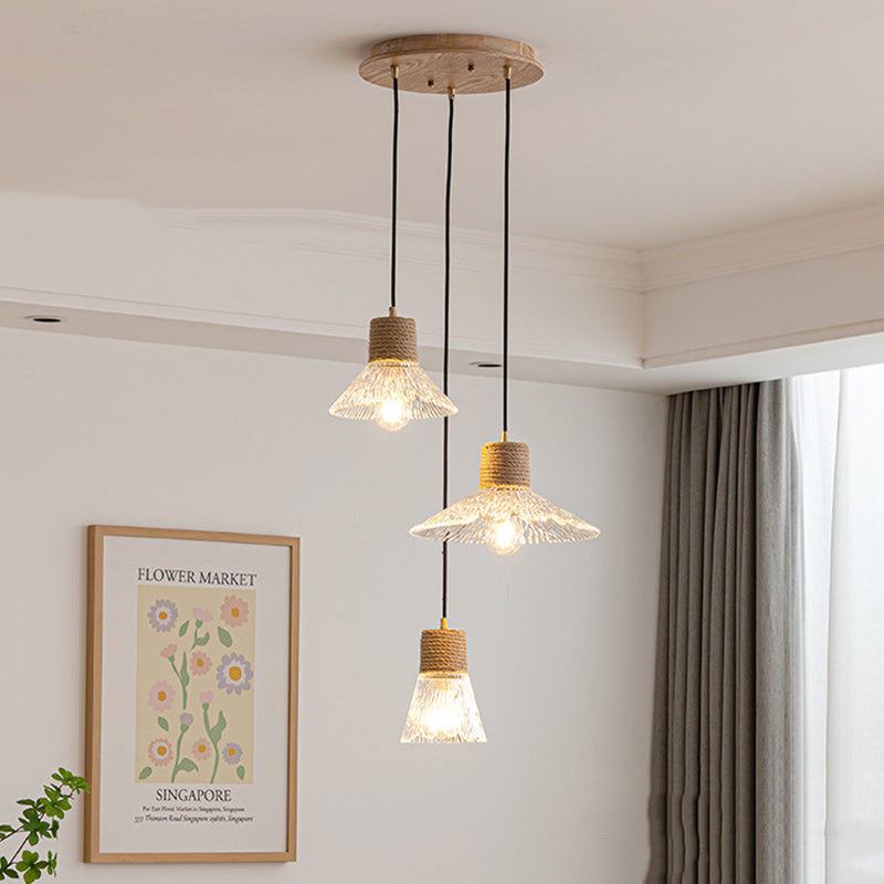Traditional Japanese Copper Wood Glass Hemp Rope Conic Ripple 1/3 Light Pendant Light For Dining Room