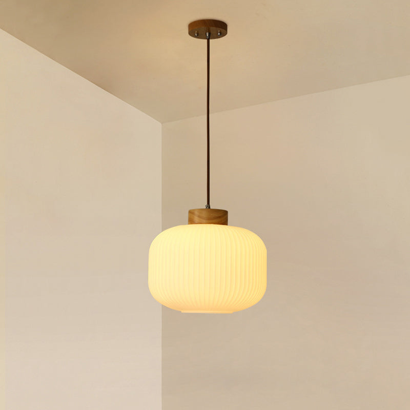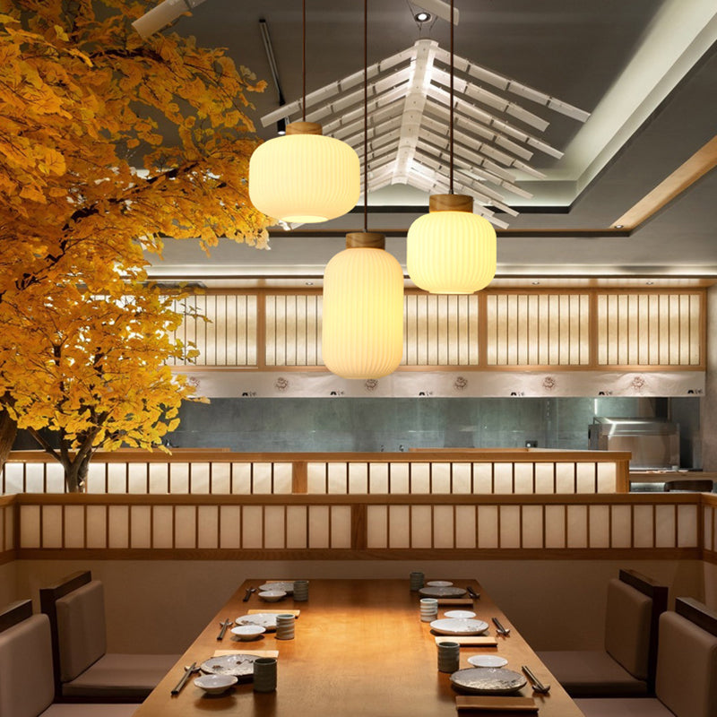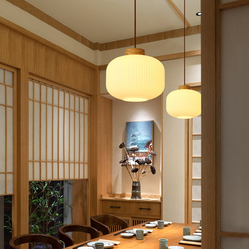 Traditional Japanese Cylinder Round Distressed Glass Wood 1-Light Pendant Light For Living Room