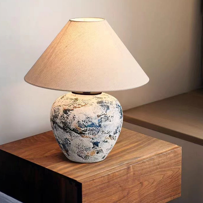 Traditional Japanese Fabric Tapered Shade Handmade Ceramic Jar 1-Light Table Lamp For Bedroom
