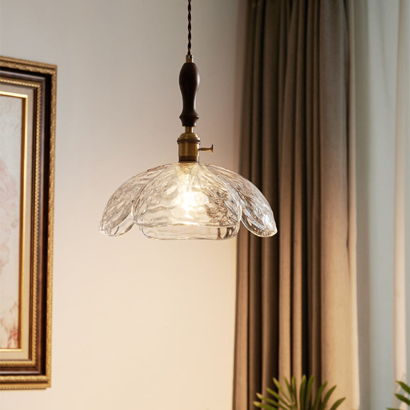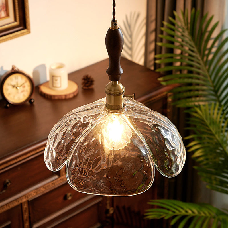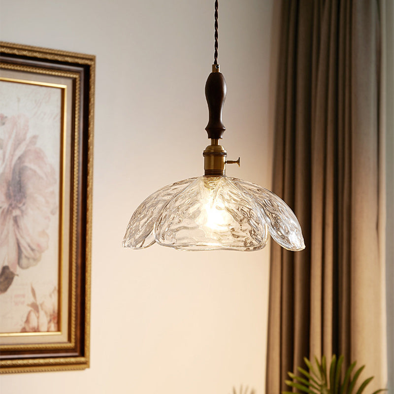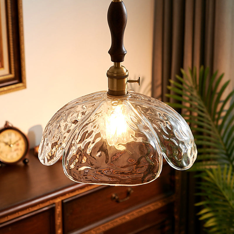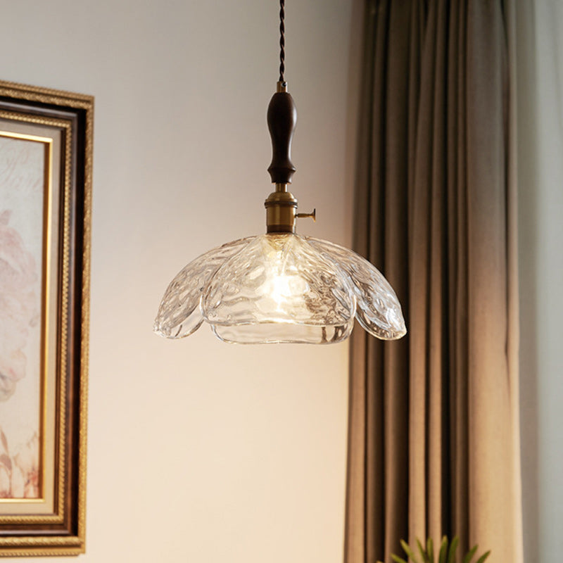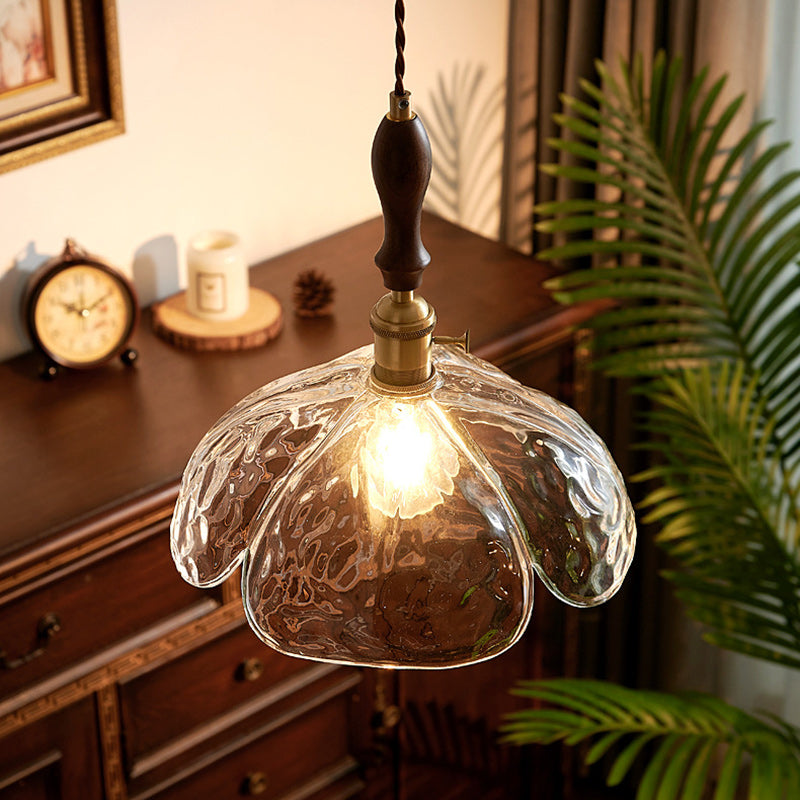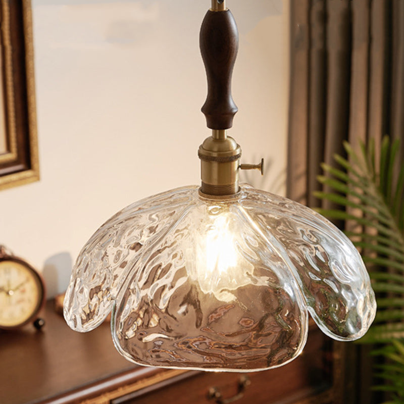 Traditional Japanese Flower Copper Wood Glass 1-Light Pendant Light For Living Room